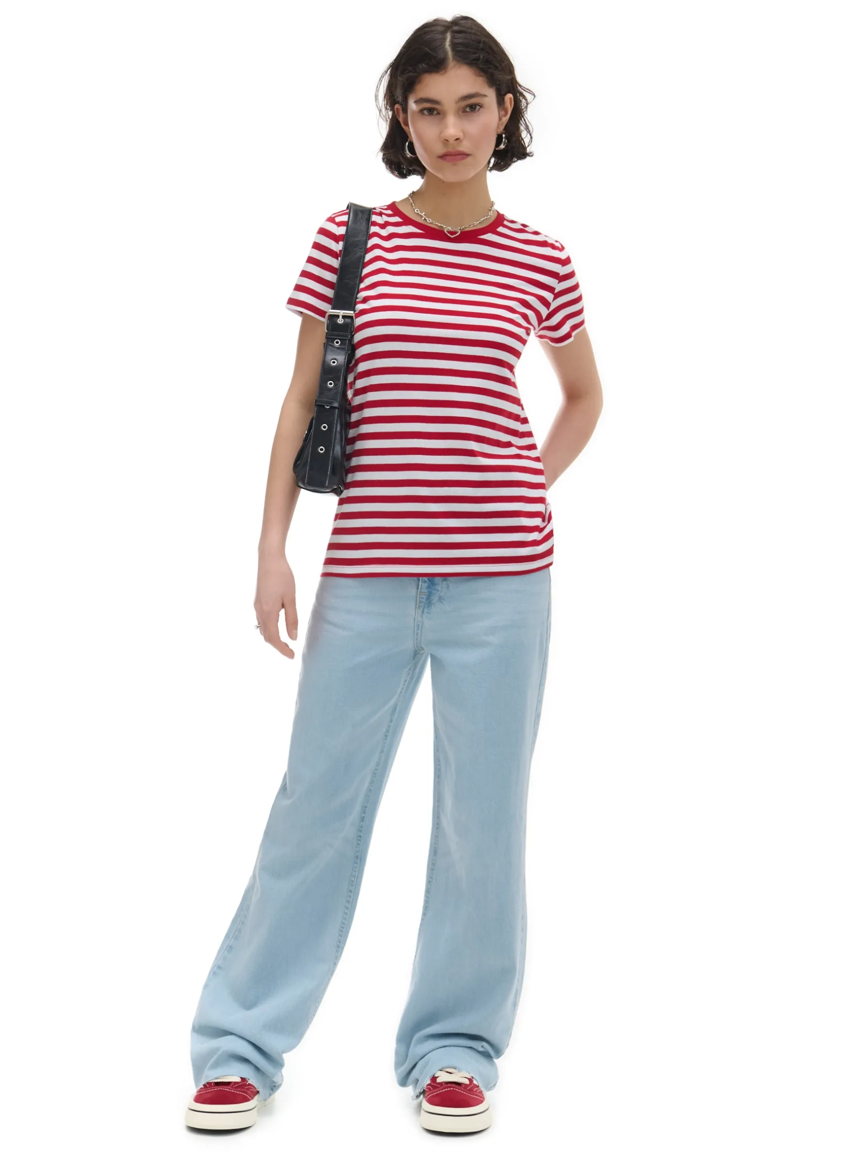Damska koszulka o regularnym kroju, uszyta w 100% z bawełny. Na całości wzór w czerwono-białe poziome paski. Wzrost modelki: 172 cm