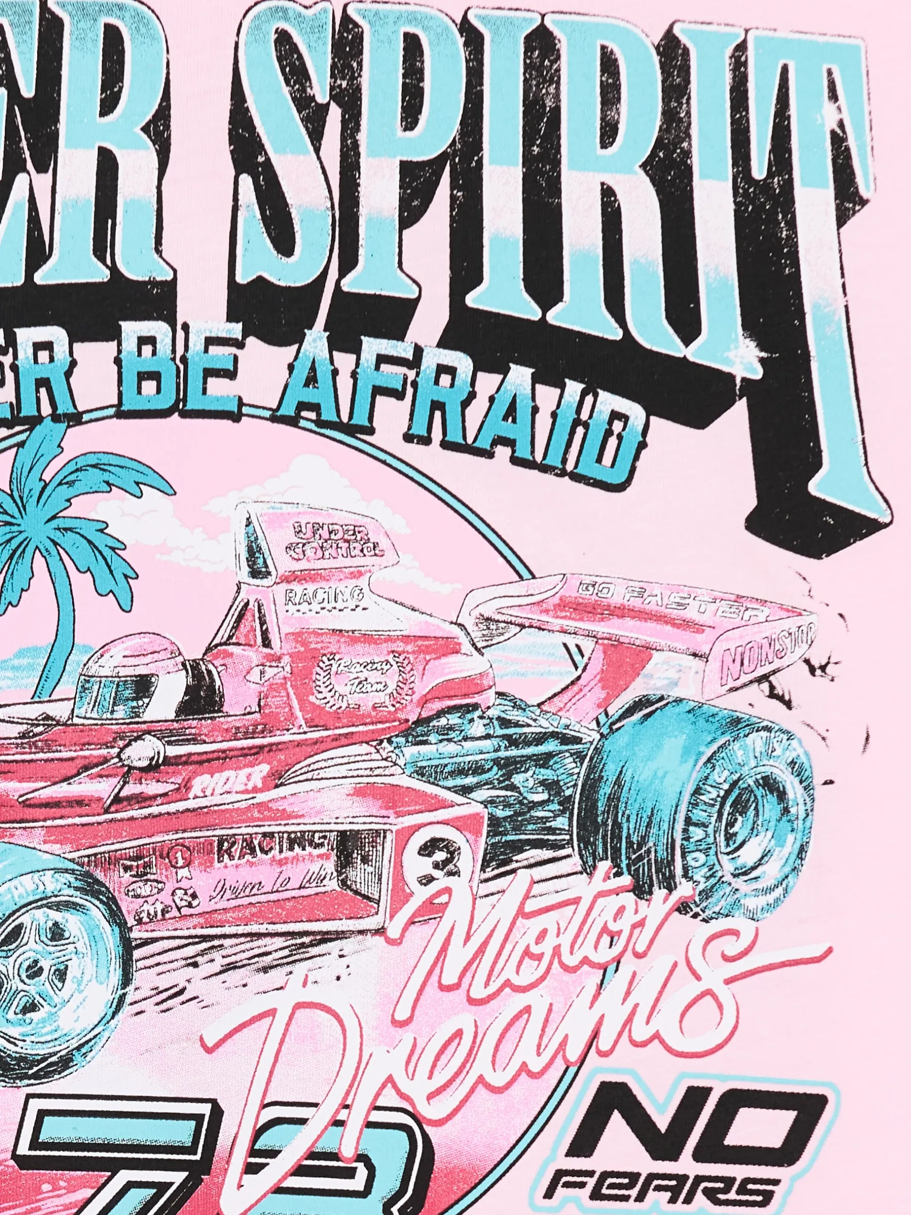 Bawełniana koszulka damska o kroju oversize, z obniżoną linią ramion. Z przodu duży nadruk z motywem motoryzacyjnym. 100% bawełny krój oversize krótkie, swobodne rękawy duży nadruk z przodu