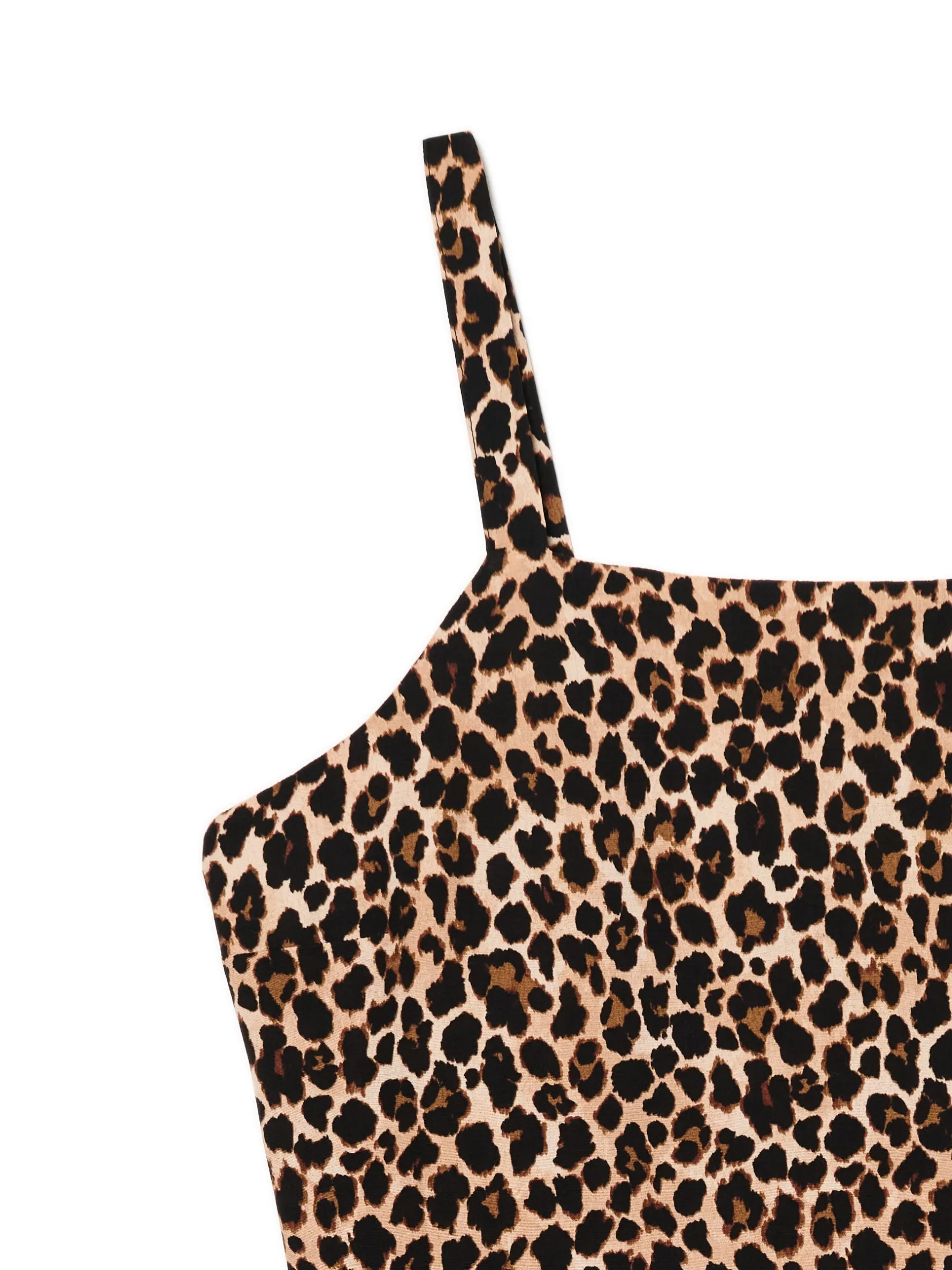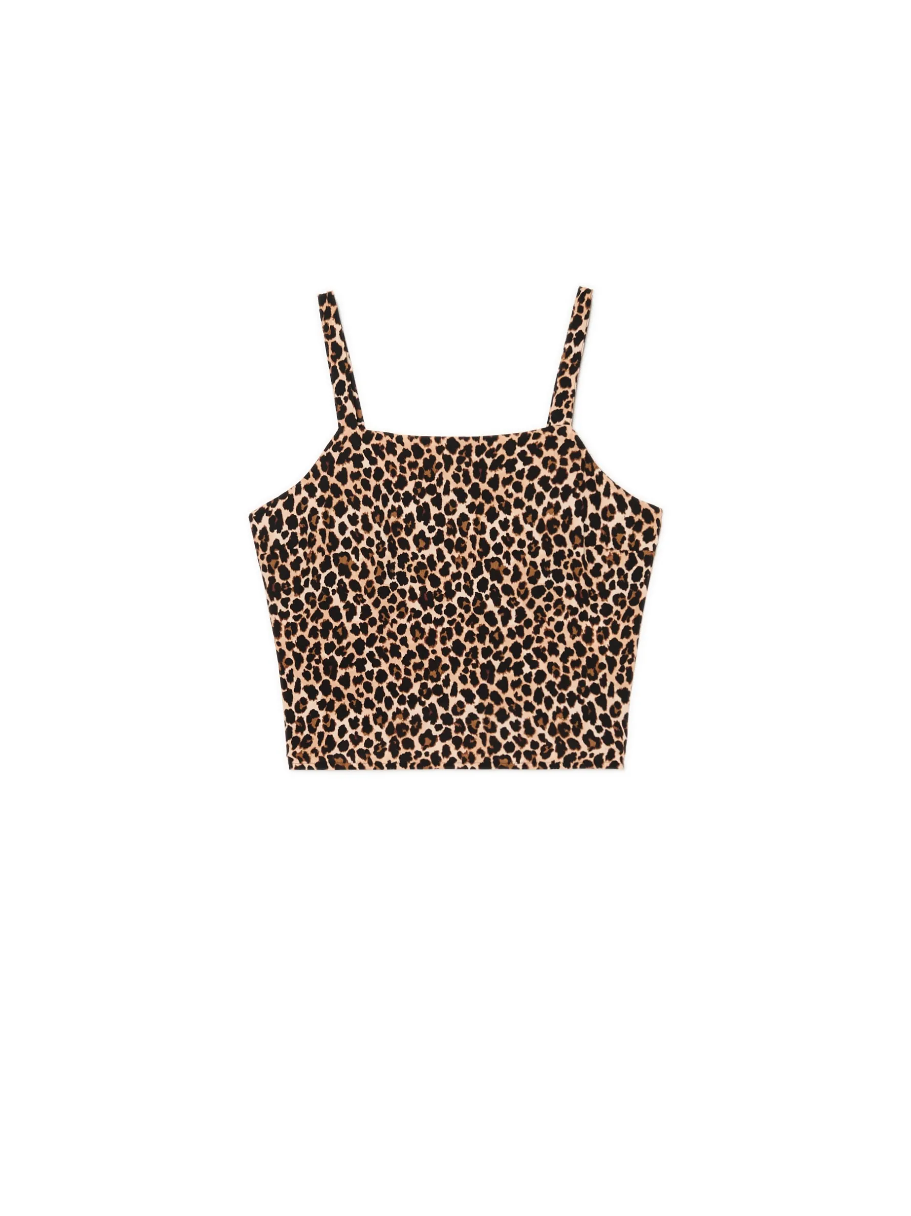 Damski top w kroju slim, uszyty z lekkiej wiskozowej tkaniny. Model w ponadczasowym nadruku w panterkę. 100% wiskozy cienkie ramiączka dopasowany krój podkreślający sylwetkę zaszewki modelujące biust i talię zwierzęcy print all over Wzrost modelki: 172 cm