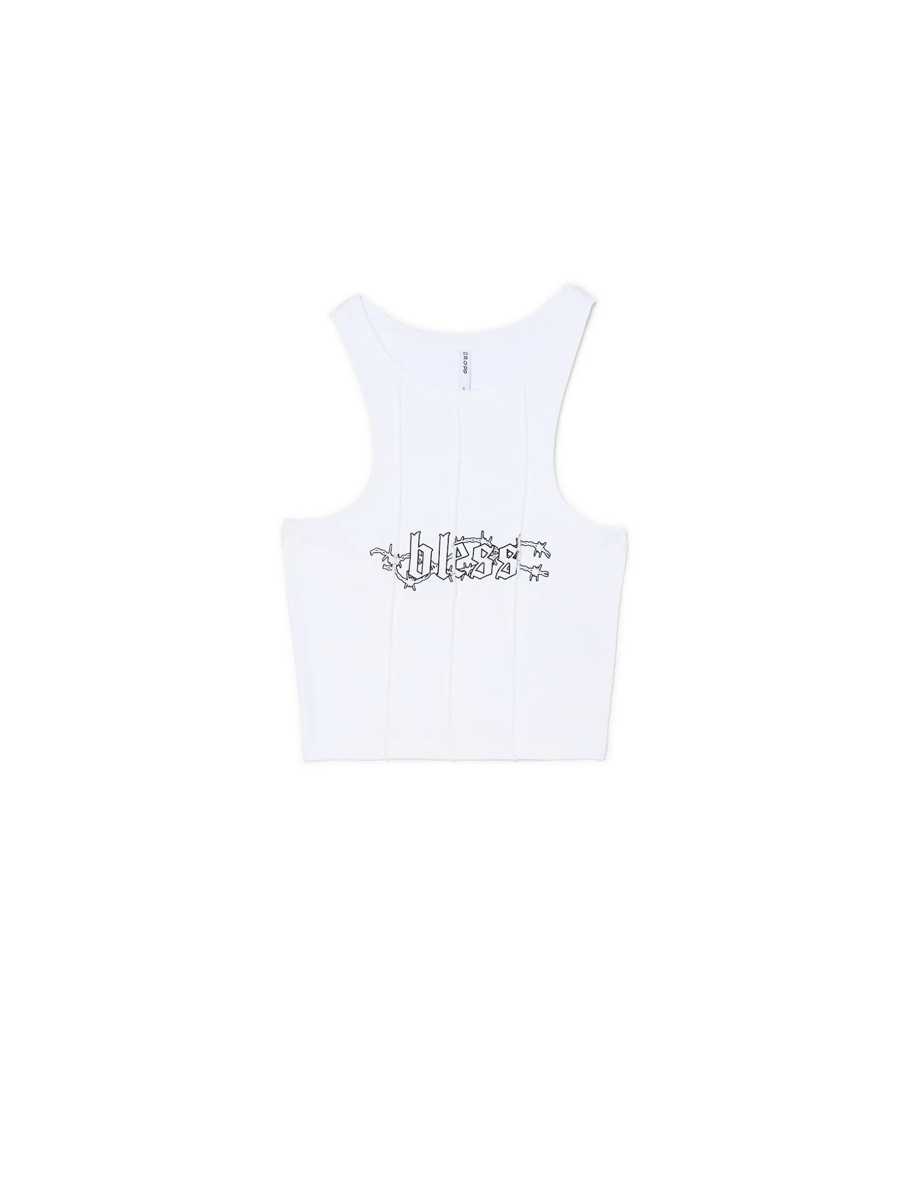 Biały damski top, uszyty z dzianiny o bardzo wysokiej zawartości bawełny. Domieszka elastanu zapewnia idealne dopasowanie do sylwetki. dzianina z domieszką elastycznych włókien krótki, dopasowany krój szersze ramiączka dekolt typu halter ozdobne przeszycia tekstowy nadruk z przodu