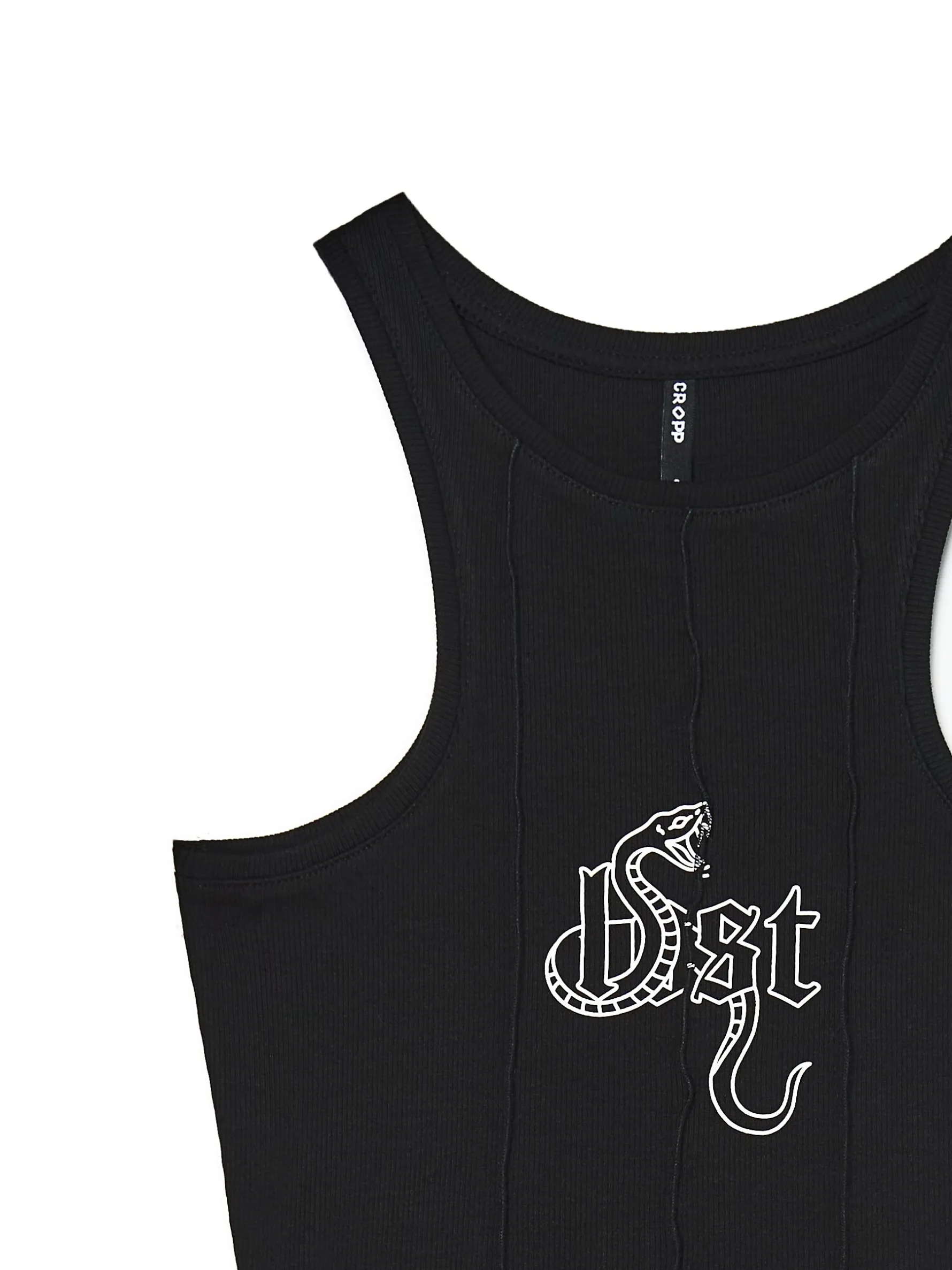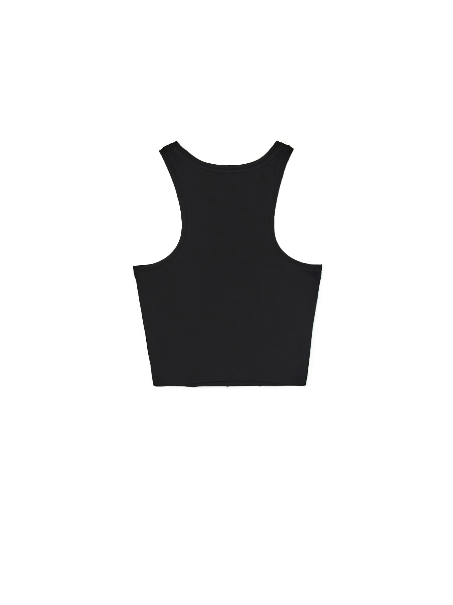 Czarny damski top, uszyty z dzianiny o bardzo wysokiej zawartości bawełny. Domieszka elastanu zapewnia idealne dopasowanie do sylwetki. dzianina z domieszką elastycznych włókien krótki, dopasowany krój szersze ramiączka dekolt typu halter ozdobne przeszycia tekstowy nadruk z przodu Wzrost modelki: 172 cm