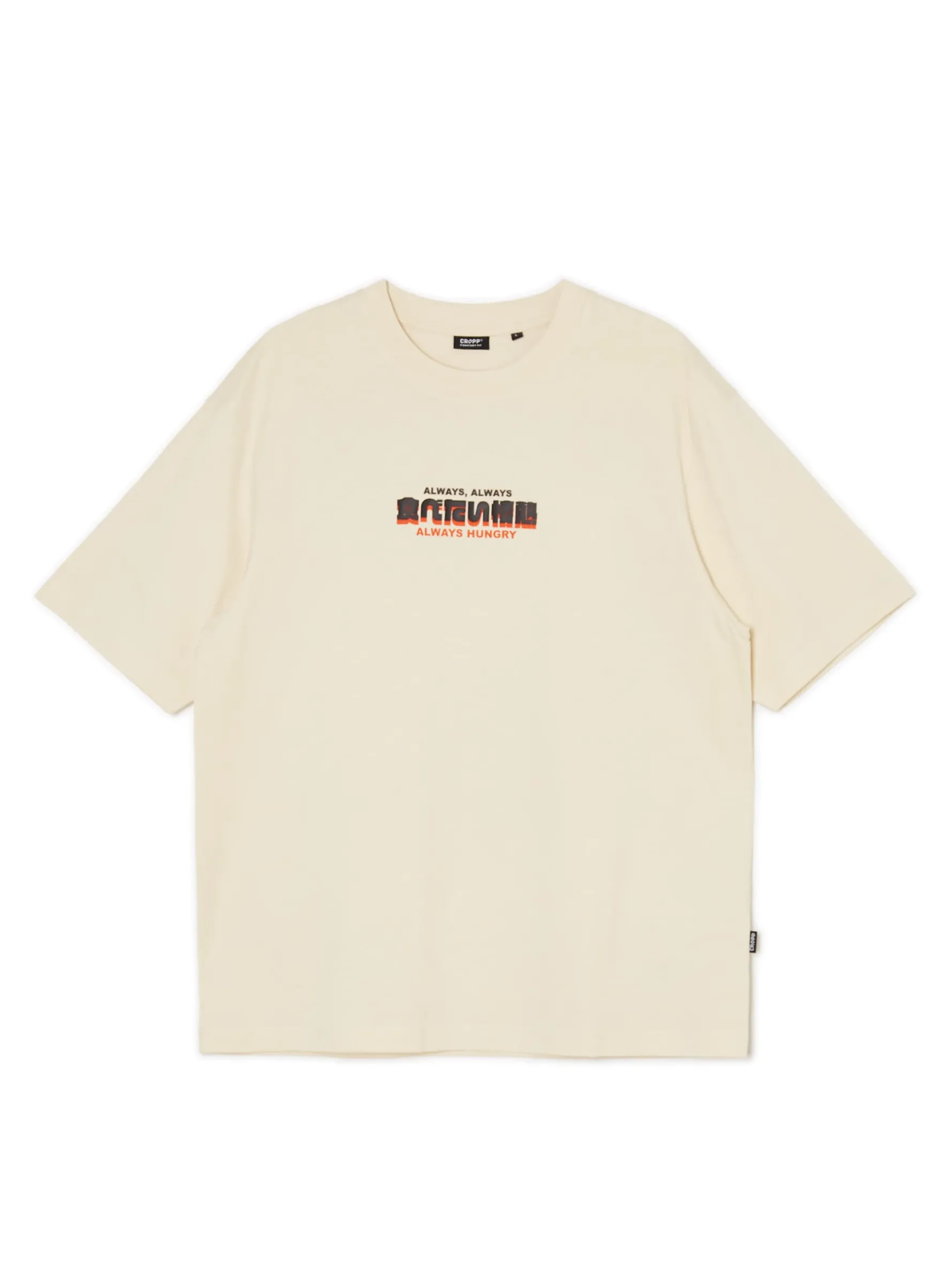 Męska kremowa koszulka, uszyta w 100% z bawełny. fason comfort krótkie rękawy z przodu nadruk typu puff print na plecach duży nadruk z motywem kota jedzącego ramen