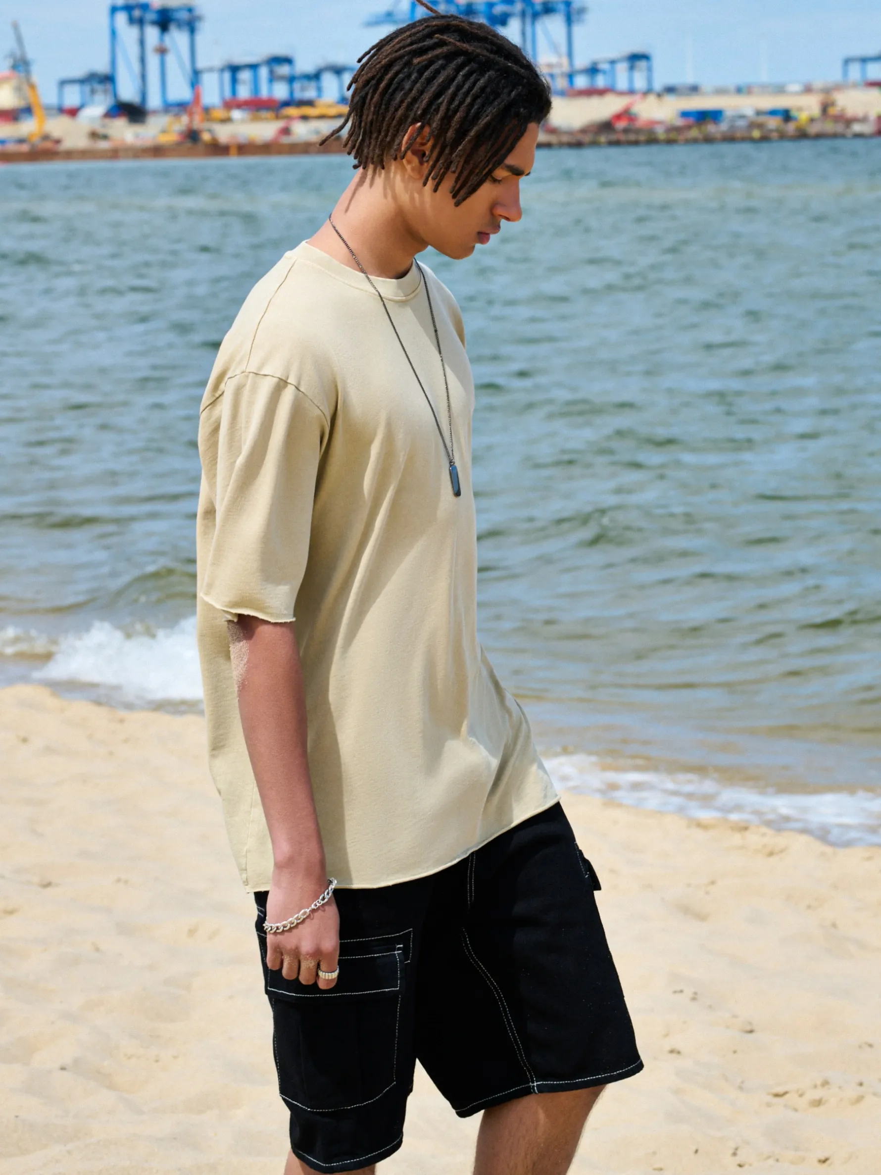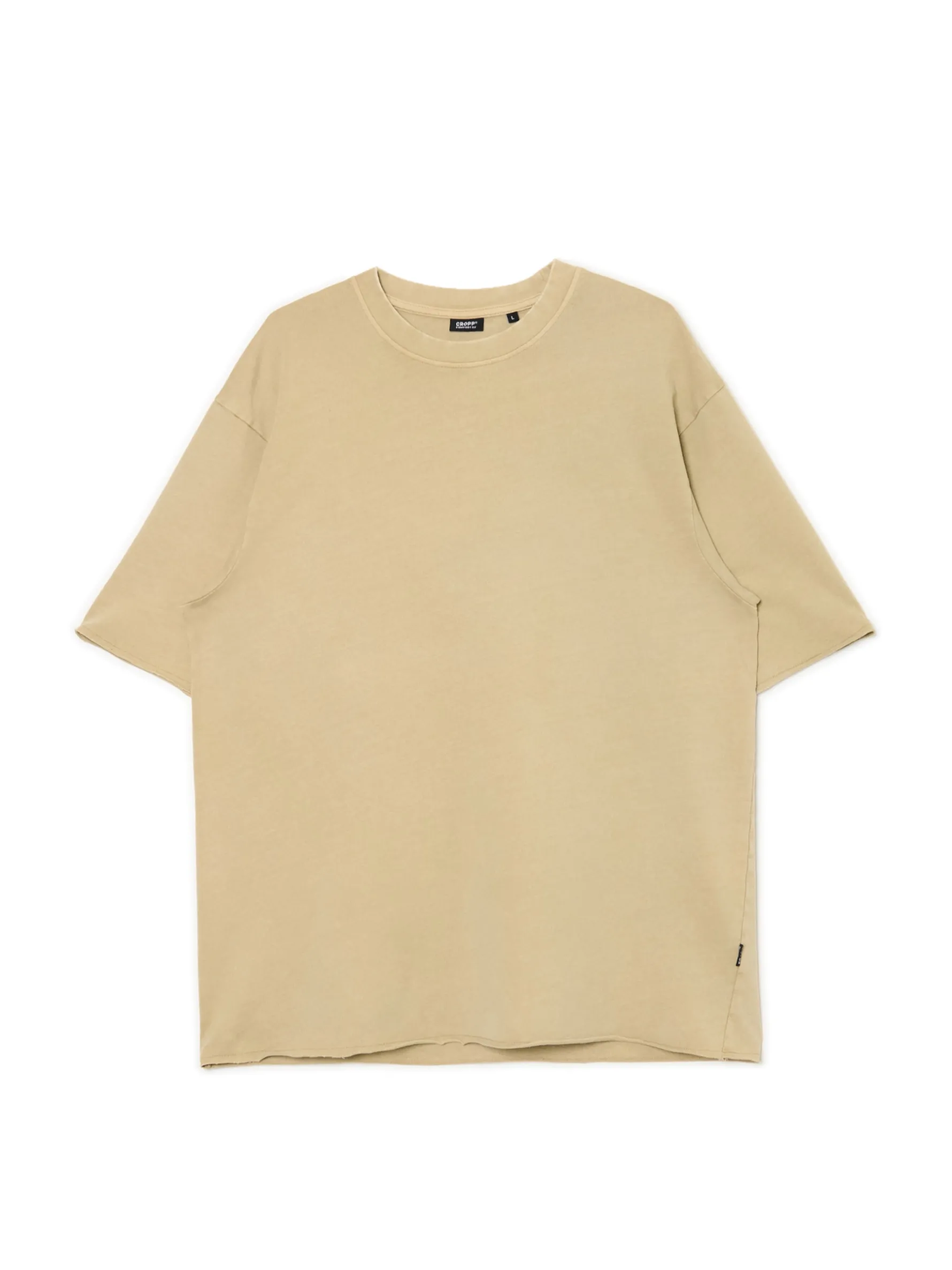 Męska koszulka uszyta z bawełnianej dzianiny french terry z efektem sprania i surowym wykończeniem brzegów. 100% bawełny luźny fason z obniżoną linią ramion krótkie, swobodne rękawy surowe wykończenie brzegów efekt sprania na całości