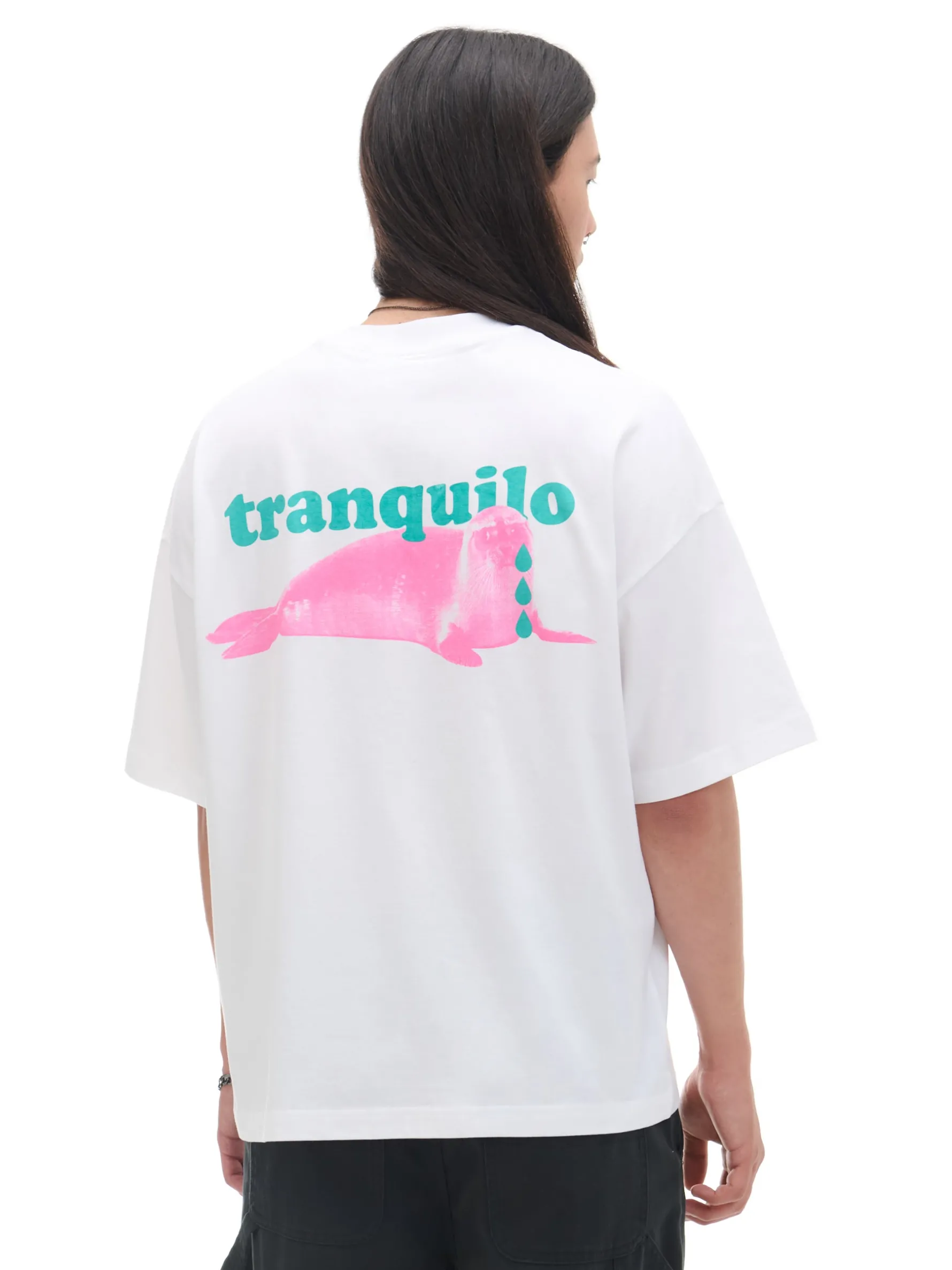 Męski T-shirt z krótkim rękawem, uszyty z bawełnianej dzianiny. Na przodzie delikatny napis, a na plecach nadruk z uroczą foczką. 100% bawełny obszerny krój boxy krótkie, swobodne rękawy mały nadruk na piersi, duży nadruk na plecach
