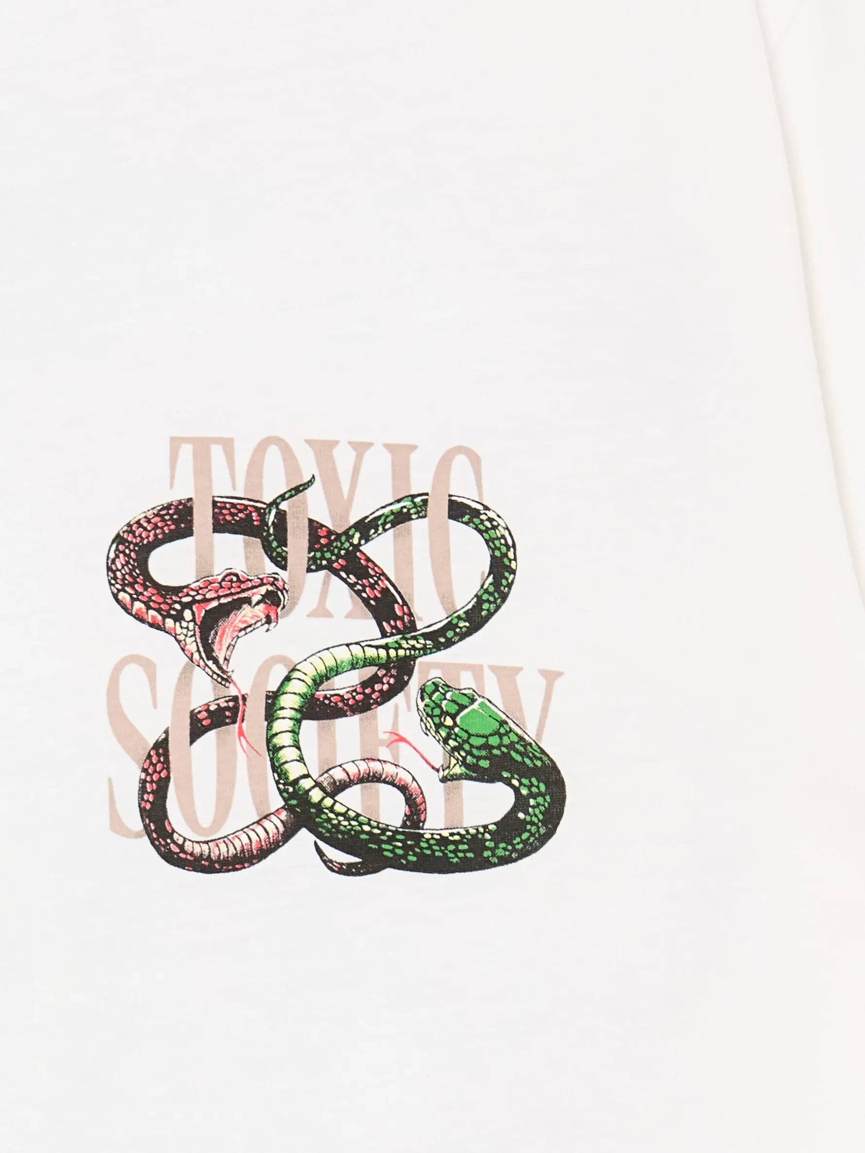 Biała męska koszulka z krótkim rękawem, uszyta z bawełnianej dzianiny. Wyróżnia ja mały nadruk na piersi i duży na plecach z motywem węży. 100% bawełny regularny krój krótkie, swobodne rękawy mały nadruk na piersi, duży nadruk na plecach