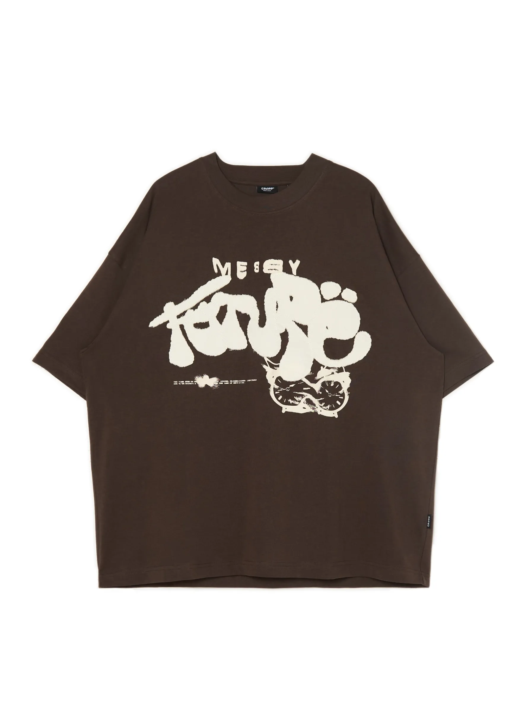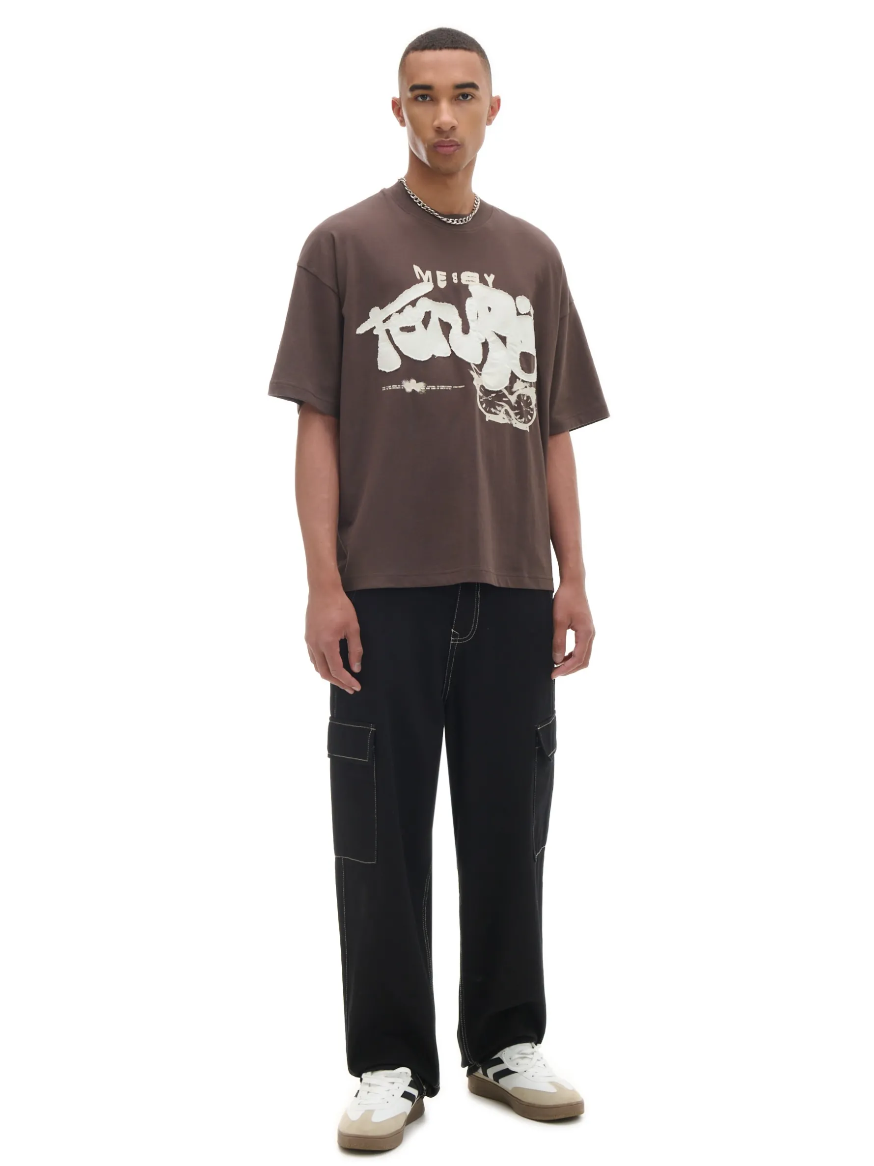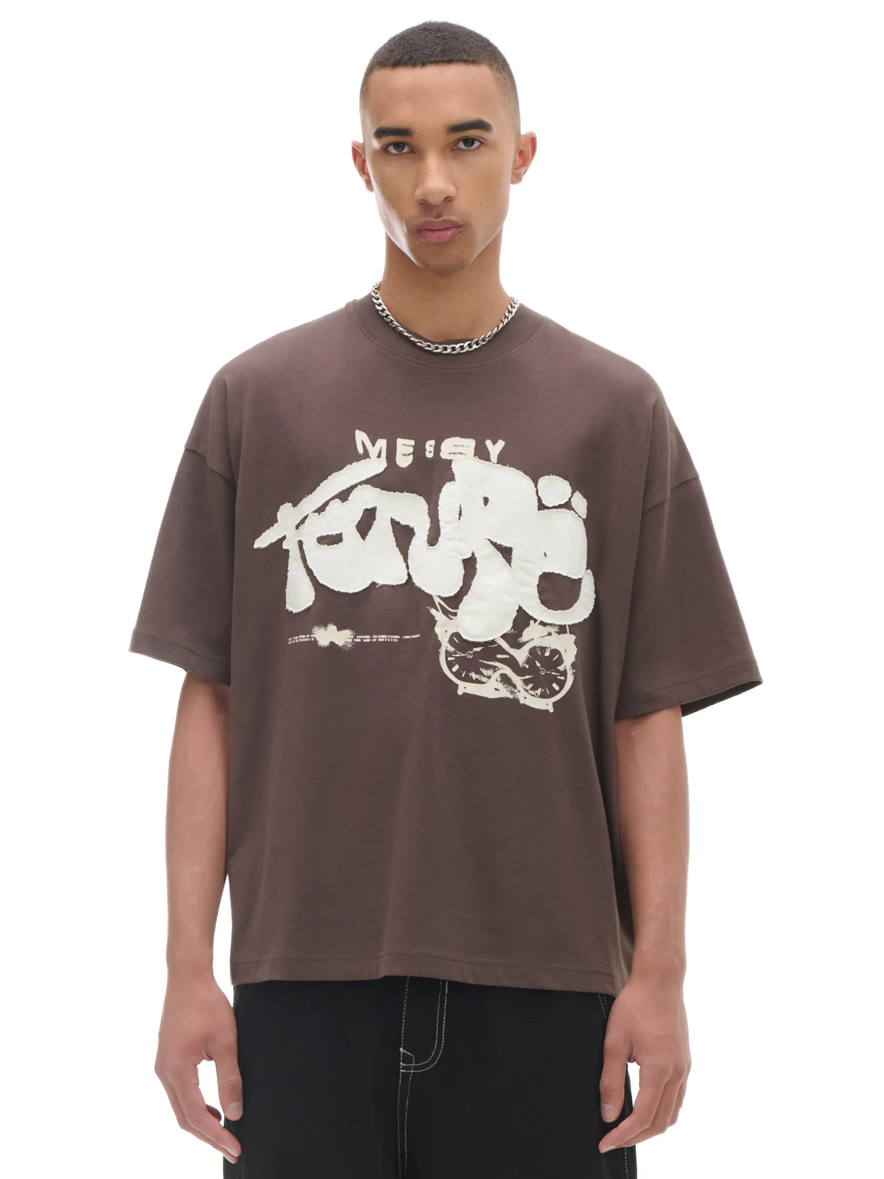 Brązowy T-shirt z dużym nadrukiem, uszyty w 100% z bawełny. obszerny krój boxy krótkie rękawy z przodu print oraz aplikacja Wzrost modela: 185 cm