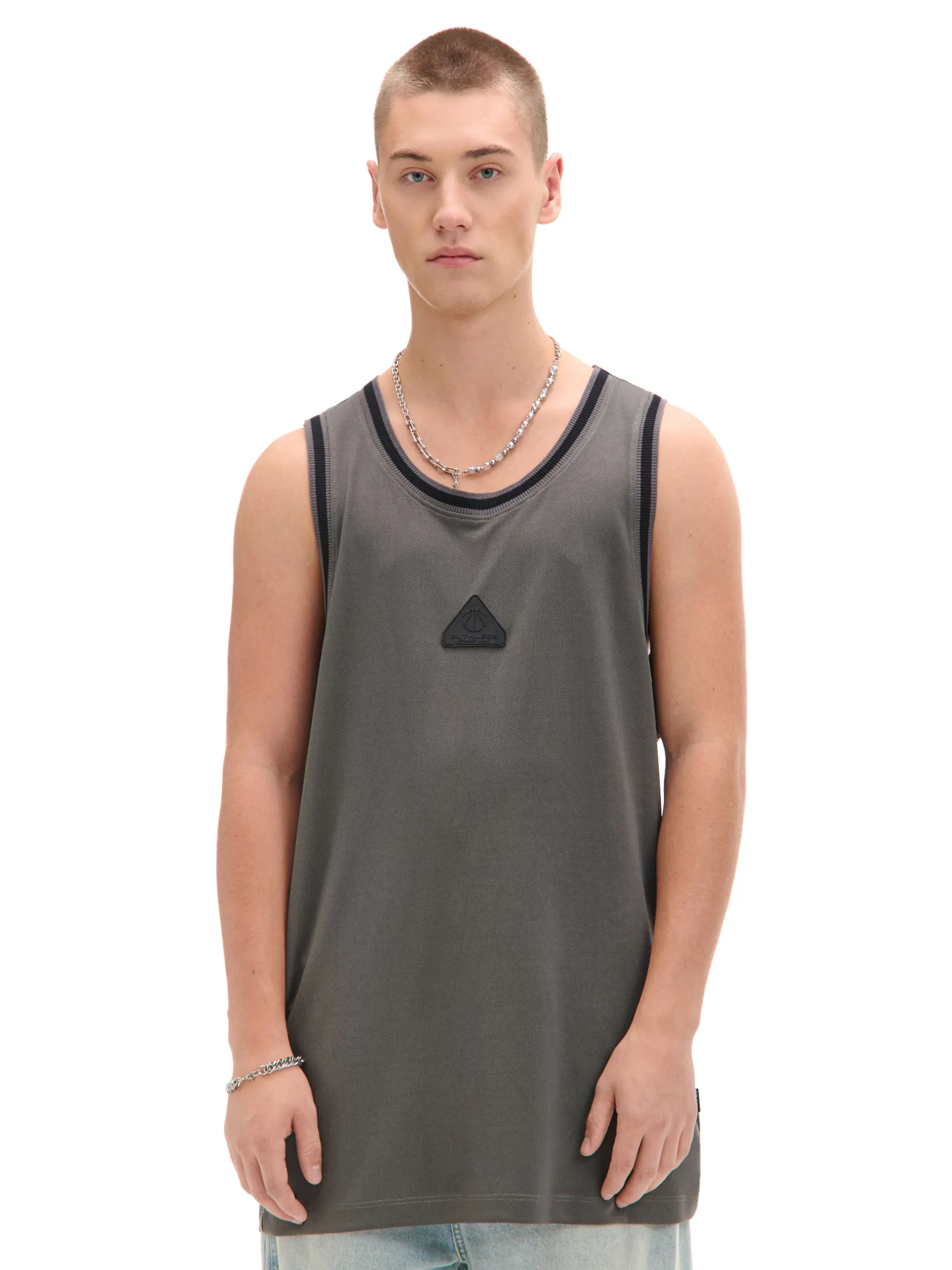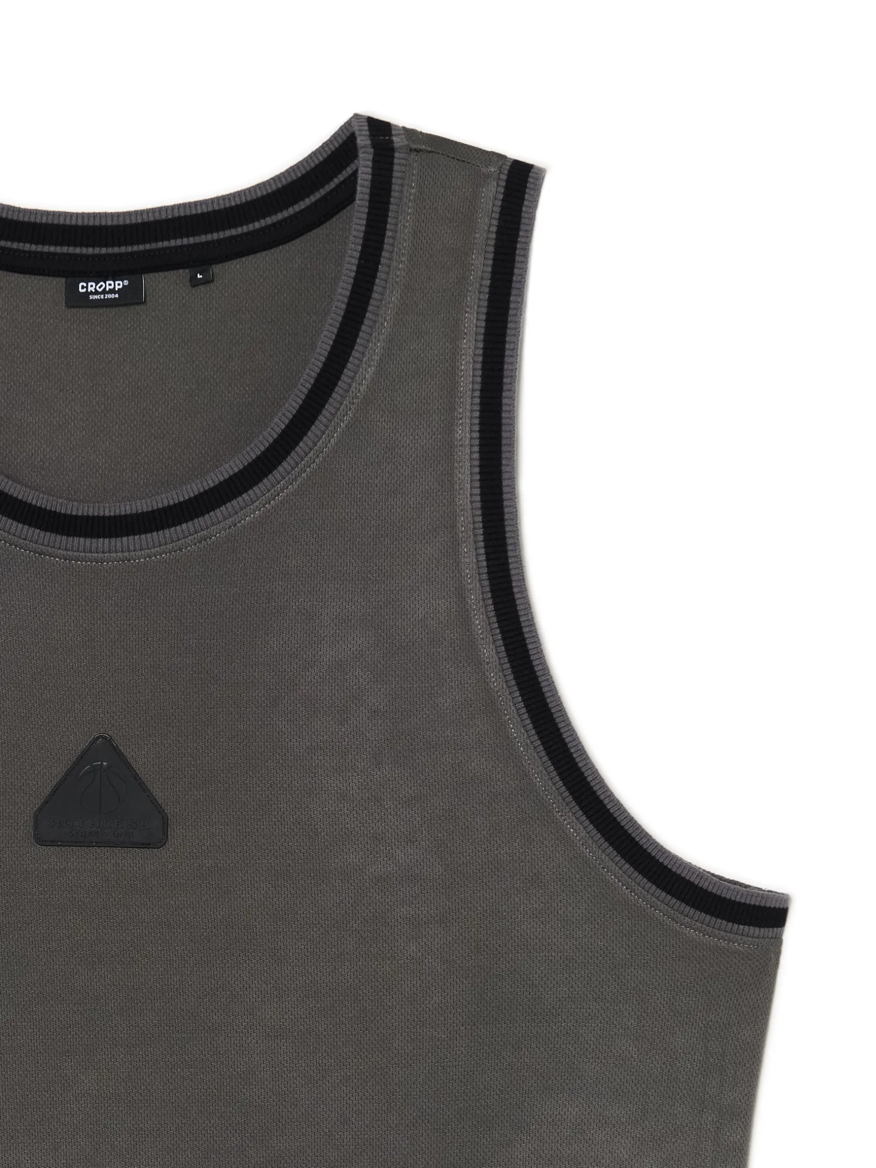 Męska koszulka typu tank top, uszyta z lekkiej dzianiny. Ten sportowy fason sprawdzi się podczas gry w kosza, jazdy na desce czy spacerów z psem. uszyty z lekkiej dzianiny wygodny krój comfort półokrągły dekolt z lamówką szersze ramiączka naszywka z przodu Wzrost modela: 185 cm