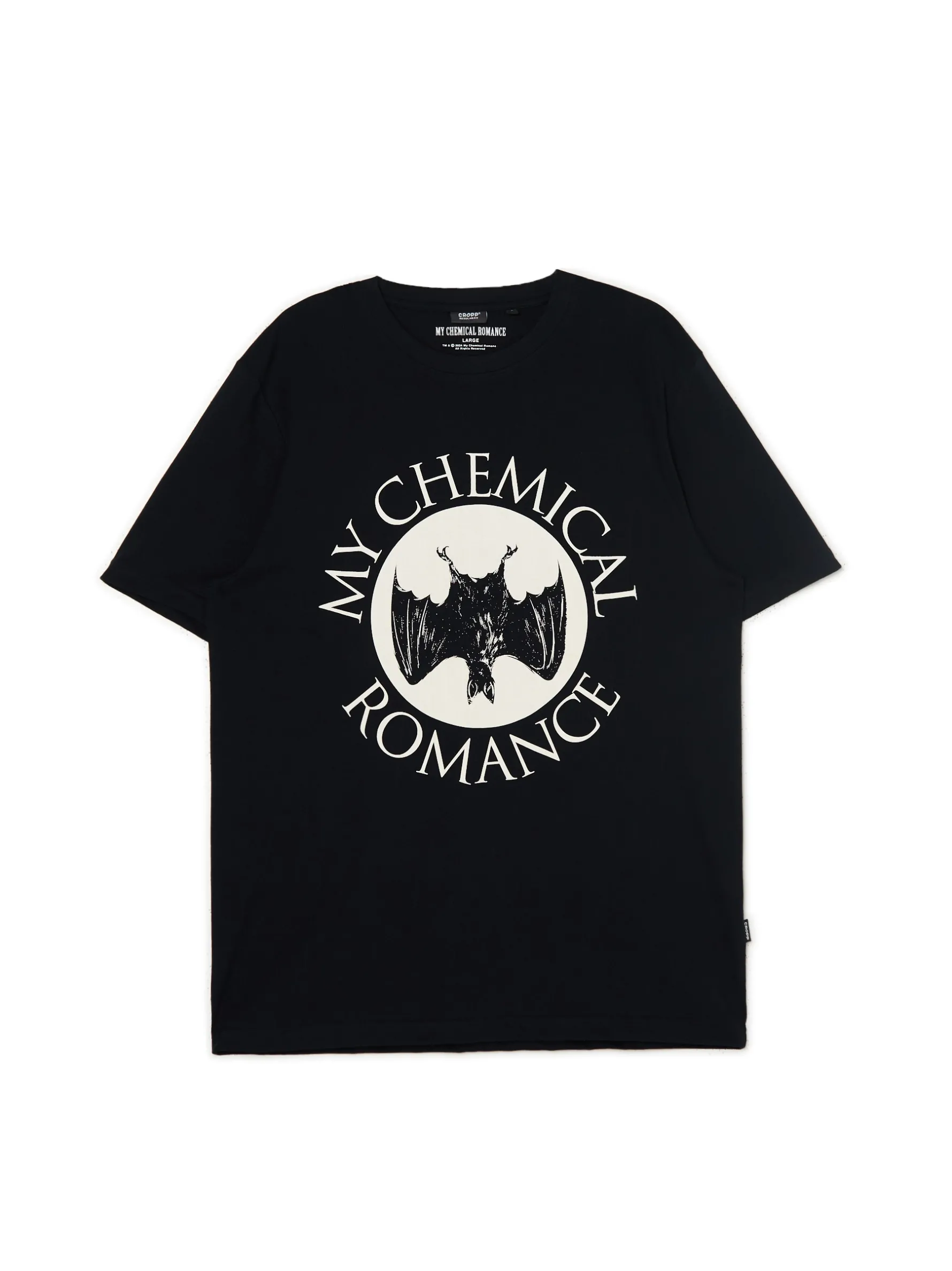 Bawełniana męska koszulka z krótkim rękawem z licencjonowanym nadrukiem zespołu My Chemical Romance na przodzie. 100% bawełny regularny krój okragły dekolt ze ściągaczem krótkie, swobodne rękawy nadruk z muzycznym motywem TM & © 2024 My Chemical Romance. All Rights Reserved.