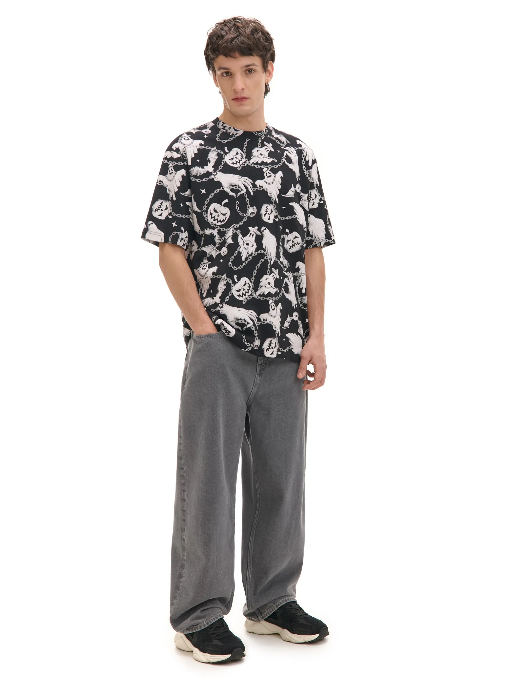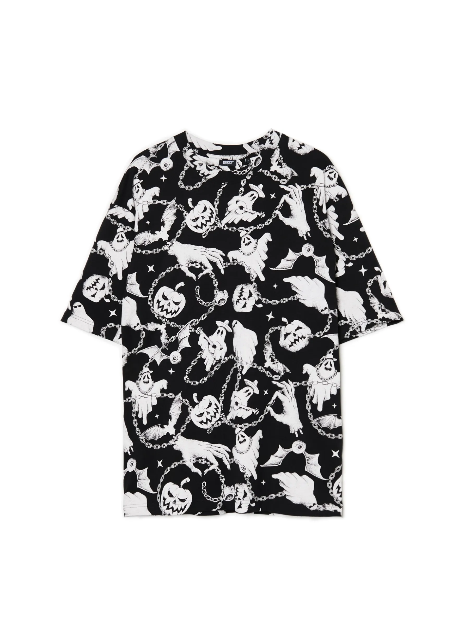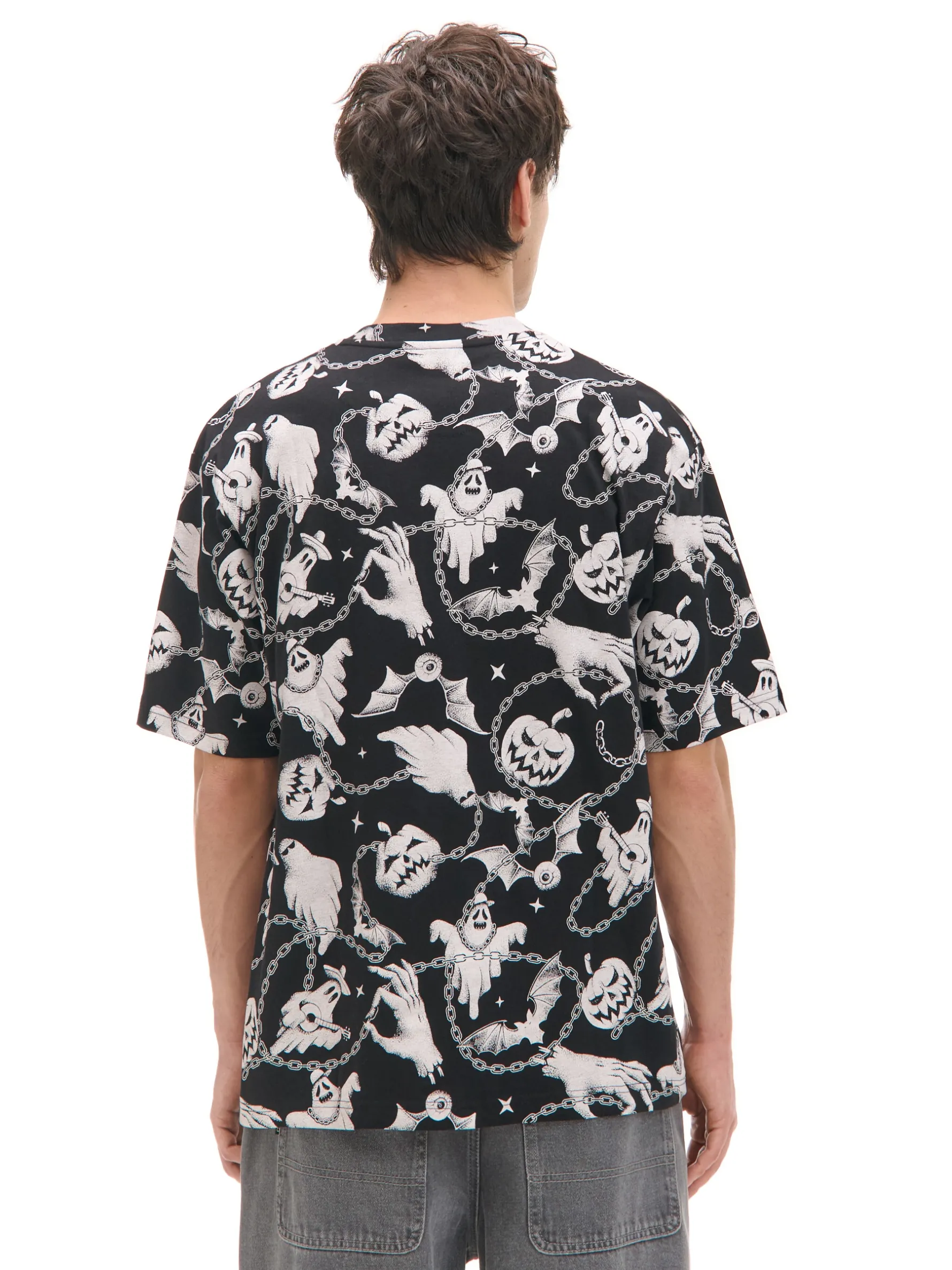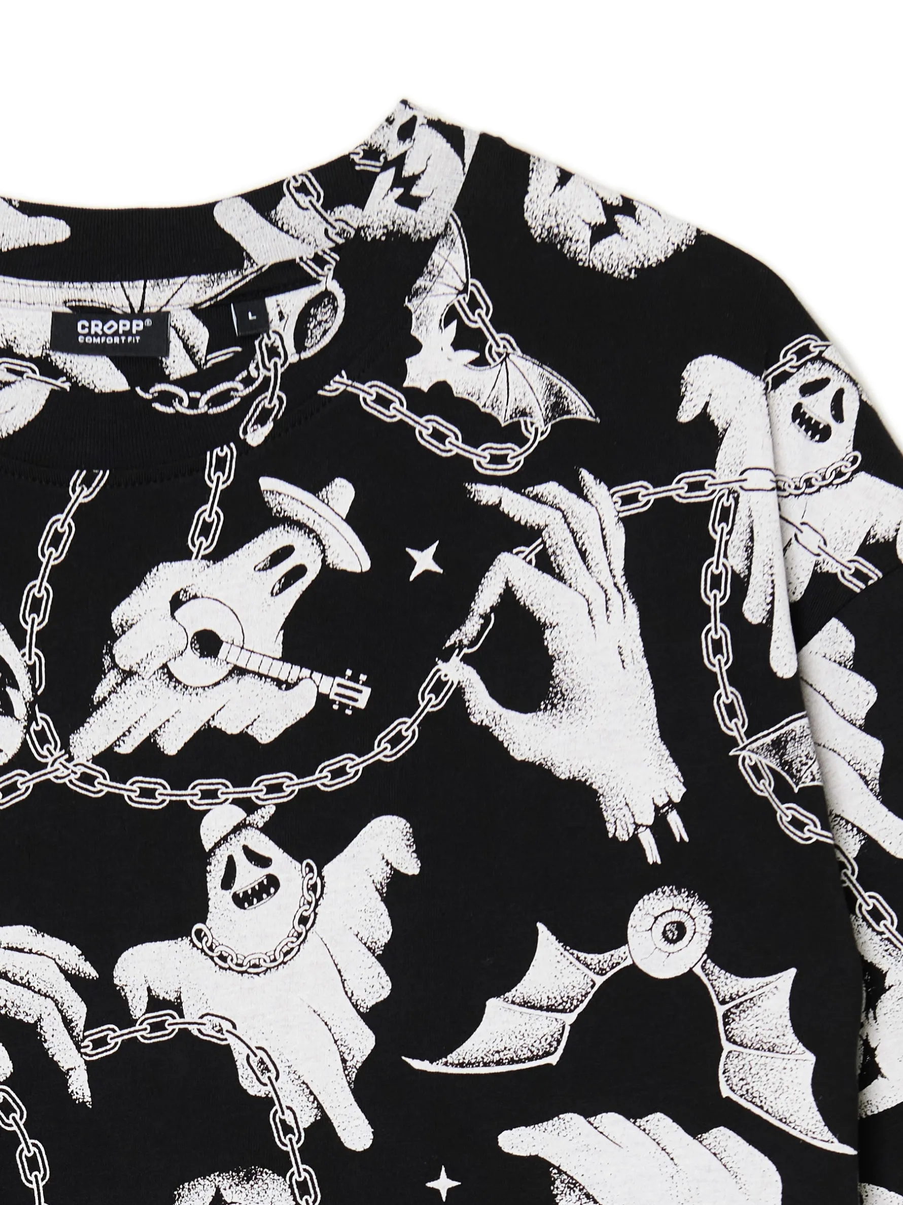 Męski bawełniany T-shirt ze strrrrrasznymi motywami: duchami, nietoperzami, łańcuchami i dyniami – idealnymi na Halloween! wygodny krój comfort krótkie rękawy nadruk z motywem Halloween