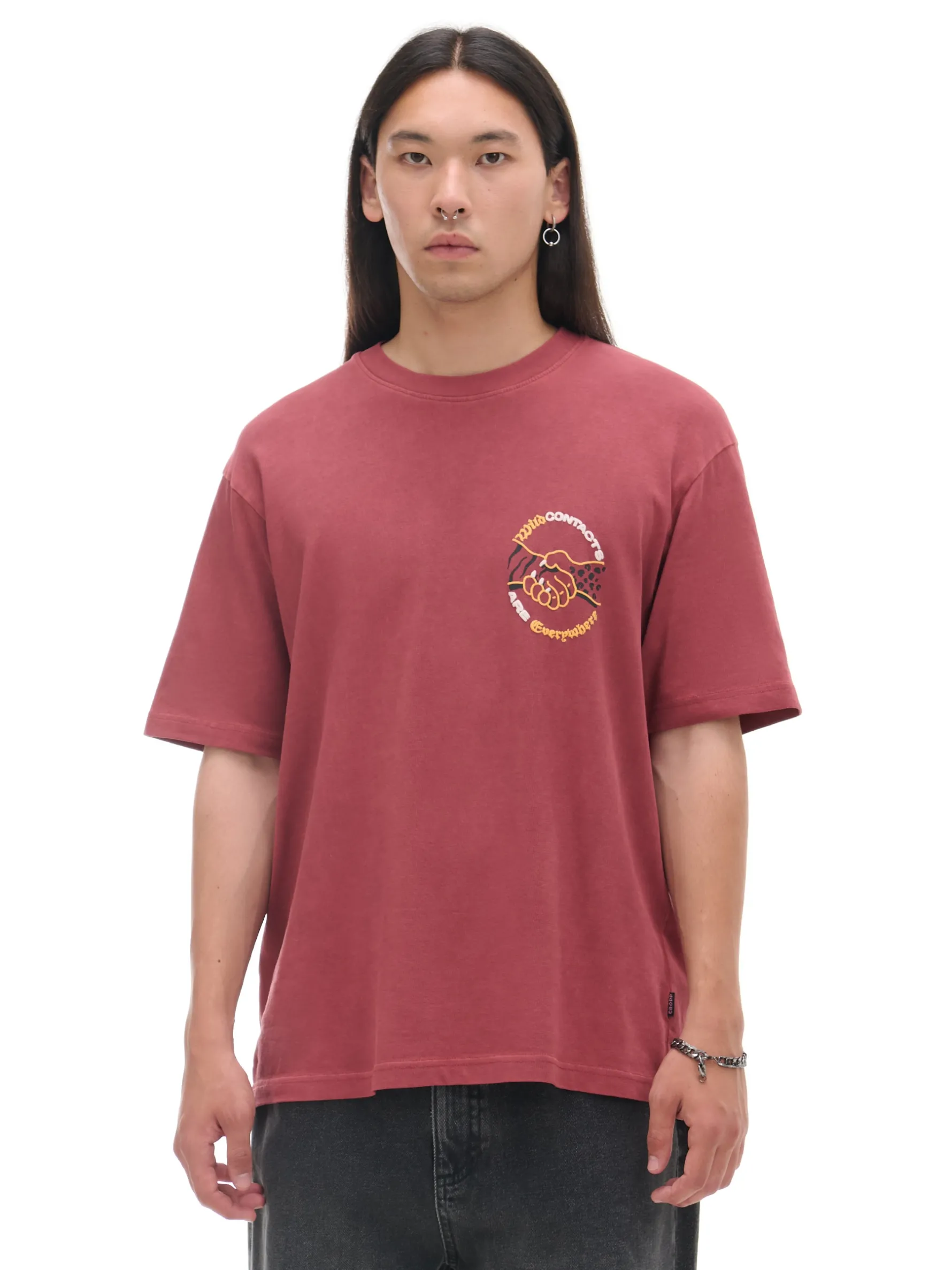 Męski T-shirt z krótkim rękawem, uszyty z bawełnianej dzianiny z małym nadrukiem na piersi. Barwiony karminowym pigmentem dla uzyskania intensywnego koloru materiału. 100% bawełny wygodny krój comfort krótkie, swobodne rękawy okrągły dekolt z lamówką efekt sprania na całości