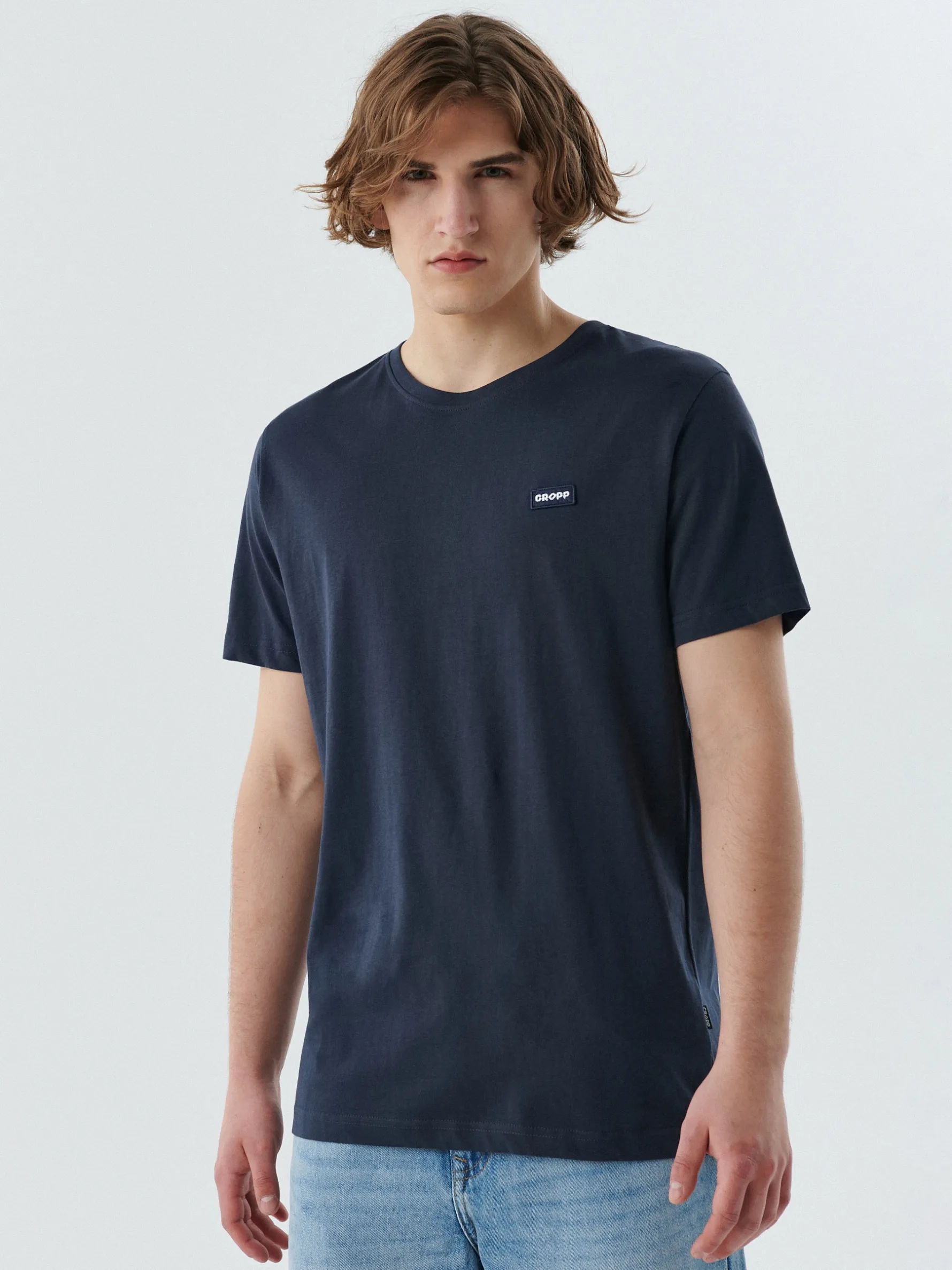 Granatowy męski T-shirt, uszyty w 100% z bawełny. wygodny regularny krój krótkie rękawy niewielka naszywka z przodu dostępny w innych kolorach Wzrost modela: 184 cm