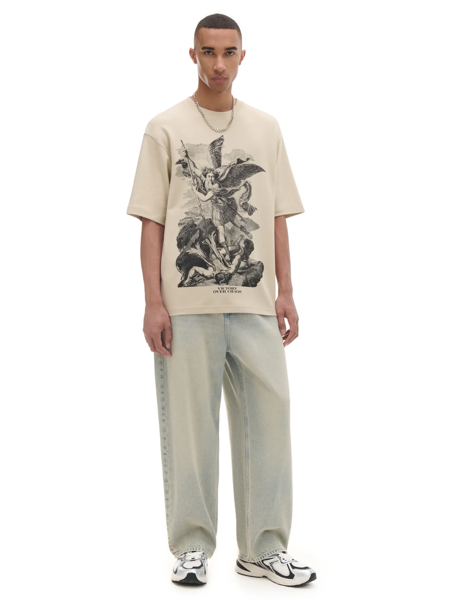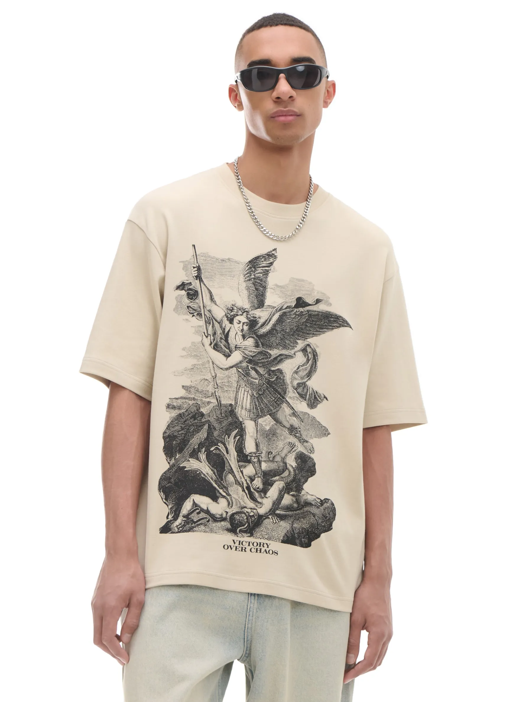 Męska koszulka, uszyta z bawełny w kolorze beżowym. Na przodzie artystyczny nadruk w malarskim stylu. 100% bawełny wygodny krój comfort krótkie rękawy z obniżoną linią ramion oryginalny print Wzrost modela: 185 cm