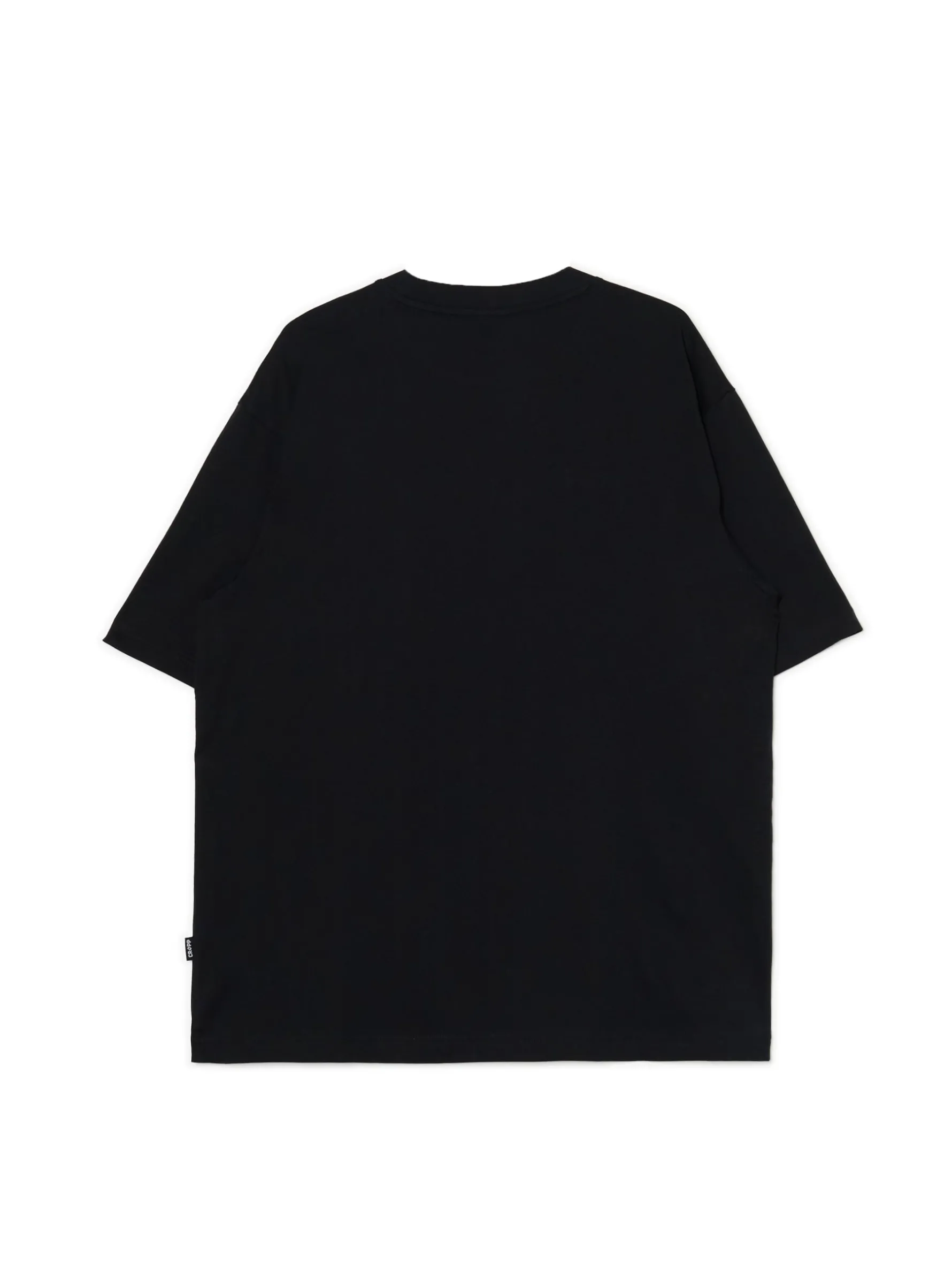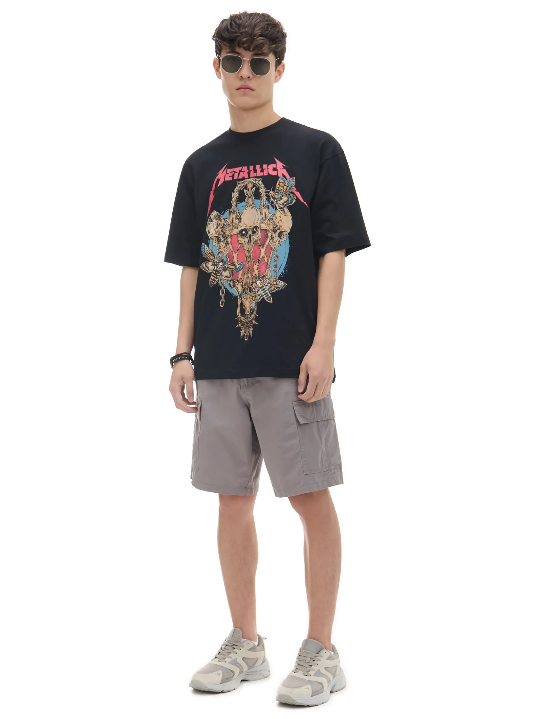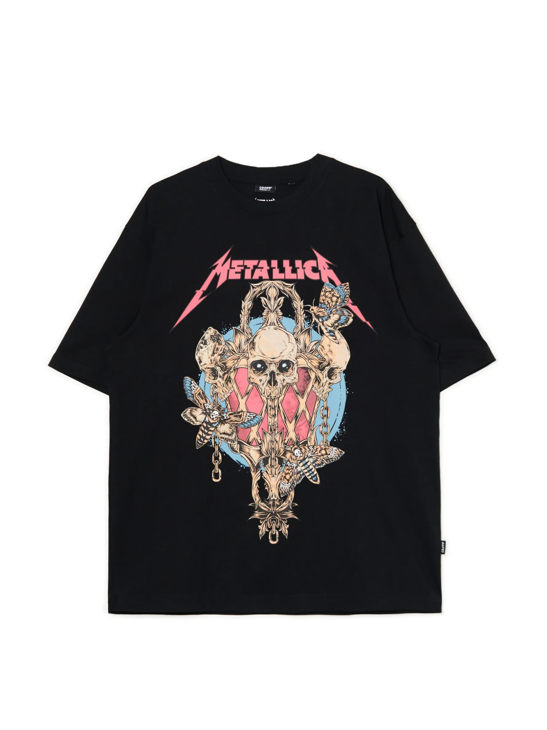 Męski bawełniany t-shirt w kolorze czarnym z krótkim rękawem i licencjonowanym nadrukiem zespołu Metallica. Model prezentuje produkt w rozmiarze M. Wzrost modela: 185 cm © 2024 Metallica Under License To Probity