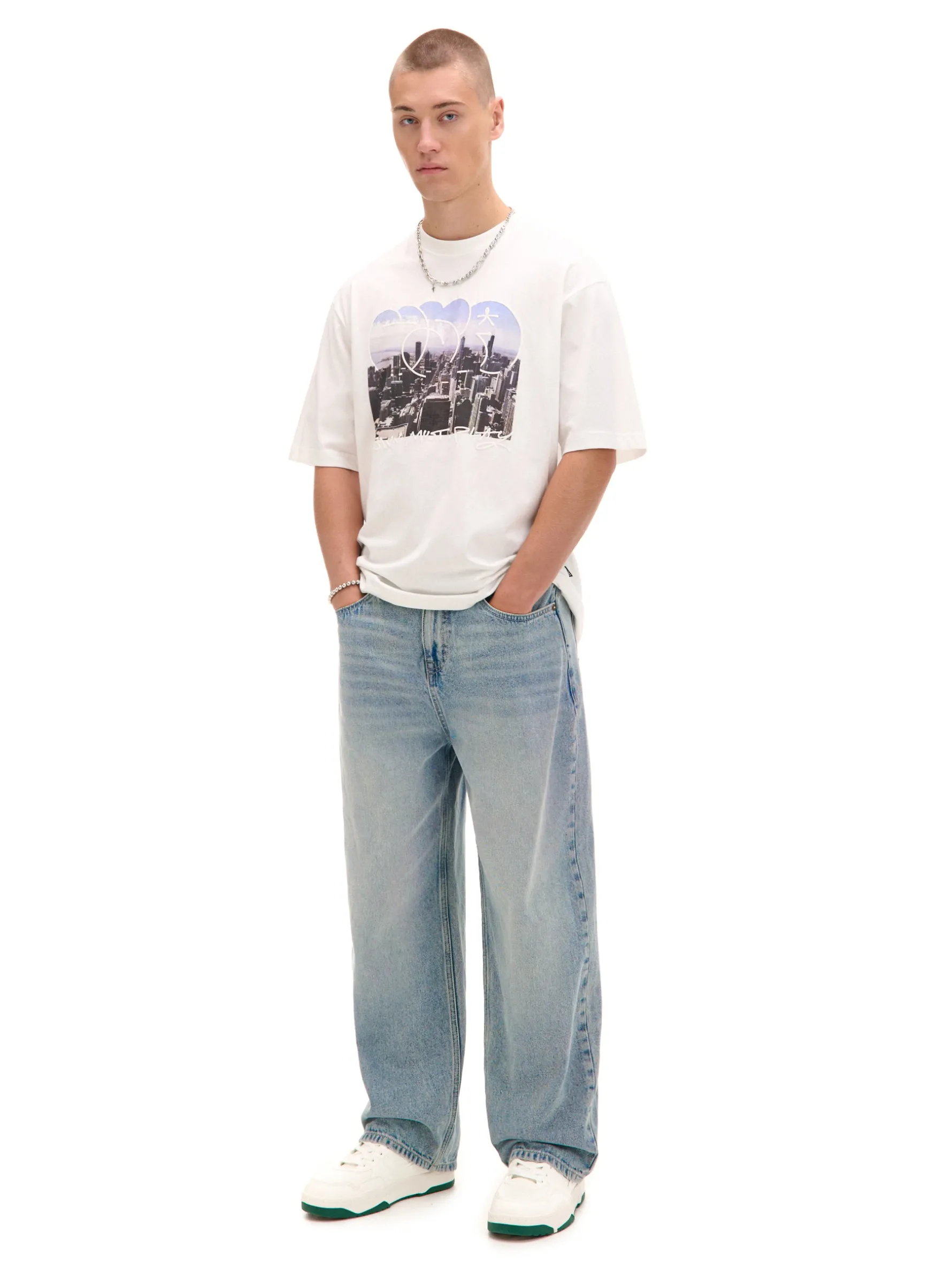 Bawełniany męski T-shirt z krótkim rękawem i fotoprintem amerykańskiego miasta Nowy Jork. 100% bawełny wygodny krój comfort okrągły dekolt z lamówką krótkie, swobodne rękawy kontrastowy fotoprint z przodu Wzrost modela: 185 cm