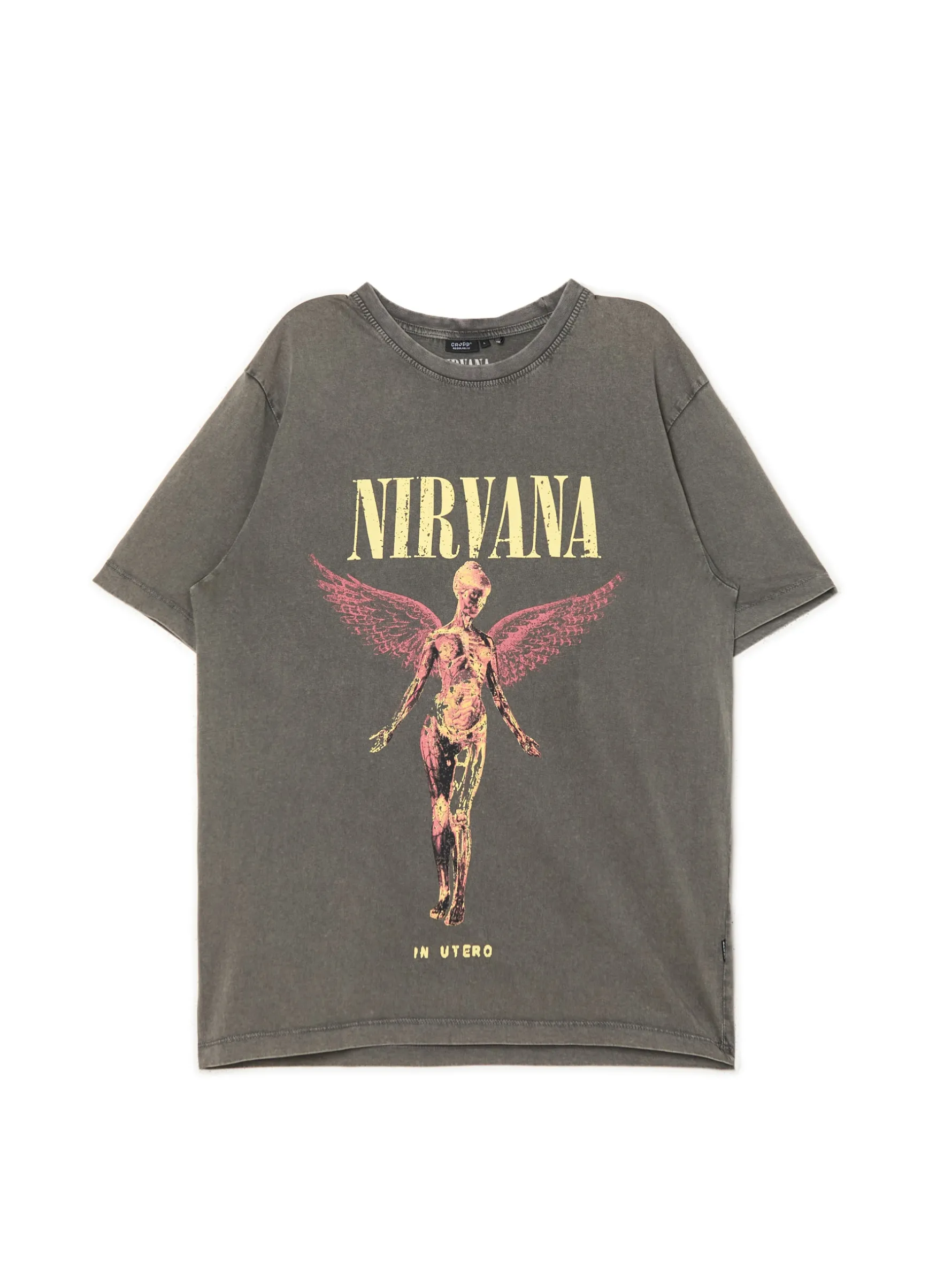Męski T-shirt o kroju regular, uszyty z bawełnianej dzianiny. Na przodzie duży, licencjonowany nadruk z grafiką okładki ostatniego albumu studyjnego zespołu Nirvana. 100% bawełny regularny krój krótkie, swobodne rękawy nadruk z muzycznym motywem Wzrost modela: 185 cm
