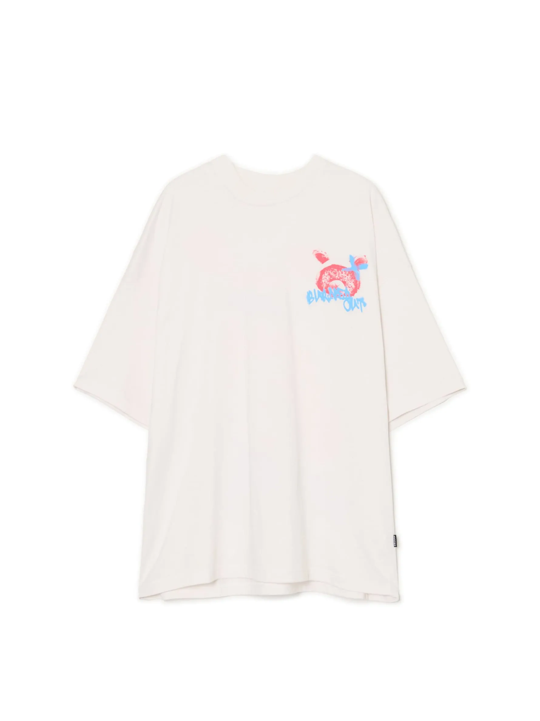 Bawełniany męski T-shirt z krótkim rękawem i unikalnym nadrukiem po obu stronach. 100% bawełny obszerny krój boxy krótkie, szerokie rękawy mały nadruk na piersi, duży nadruk na plecach oryginalny print Wzrost modela: 185 cm