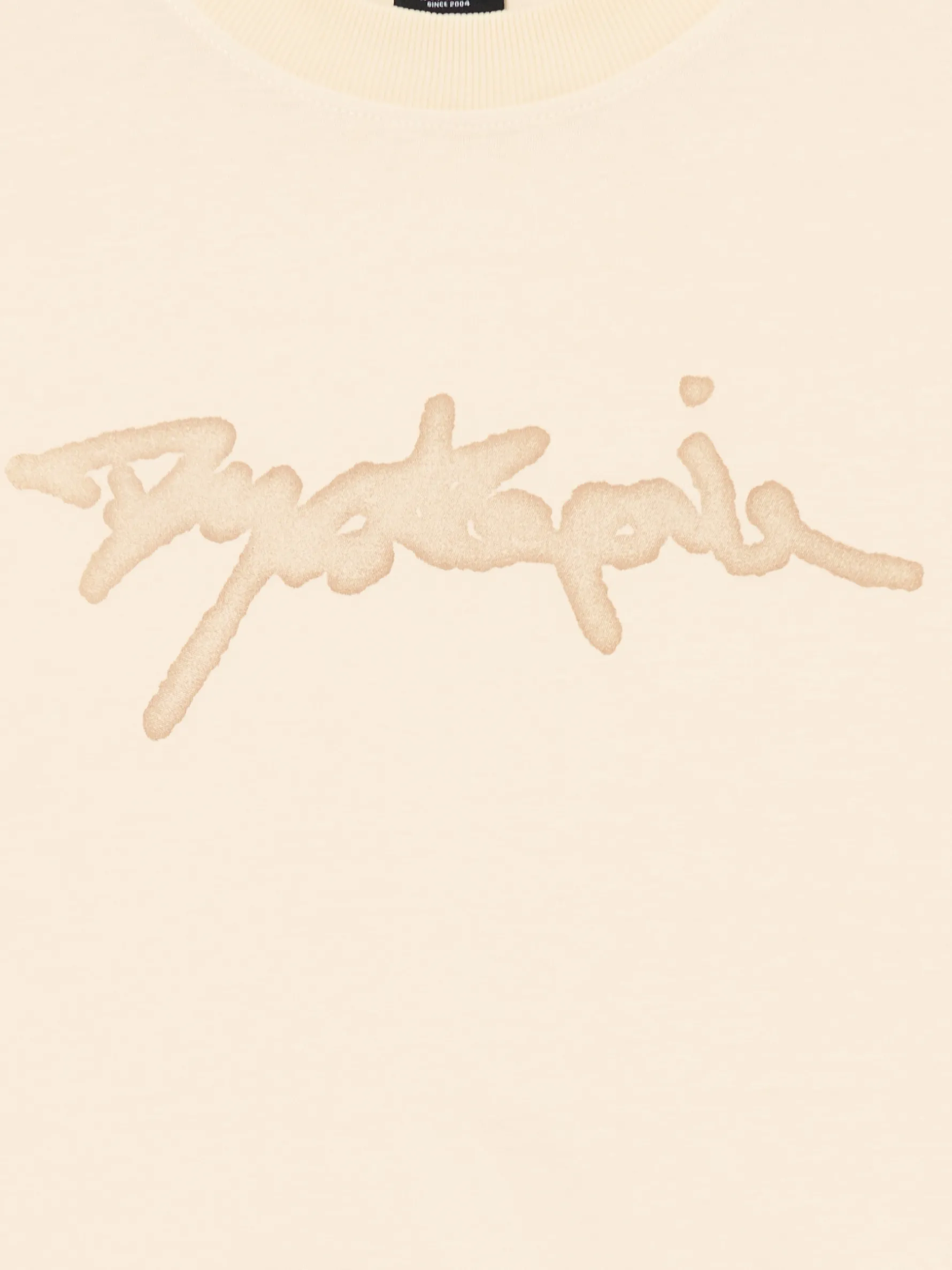 Męska koszulka w kroju boxy, uszyta z bawełny w kolorze kremowym z nadrukiem tekstowym. Fituje z każdym rodzajem spodni! 100% bawełny obszerny krój boxy krótkie, szerokie rękawy obniżona linia ramion napis z przodu efekt sprania na całości Wzrost modela: 185 cm