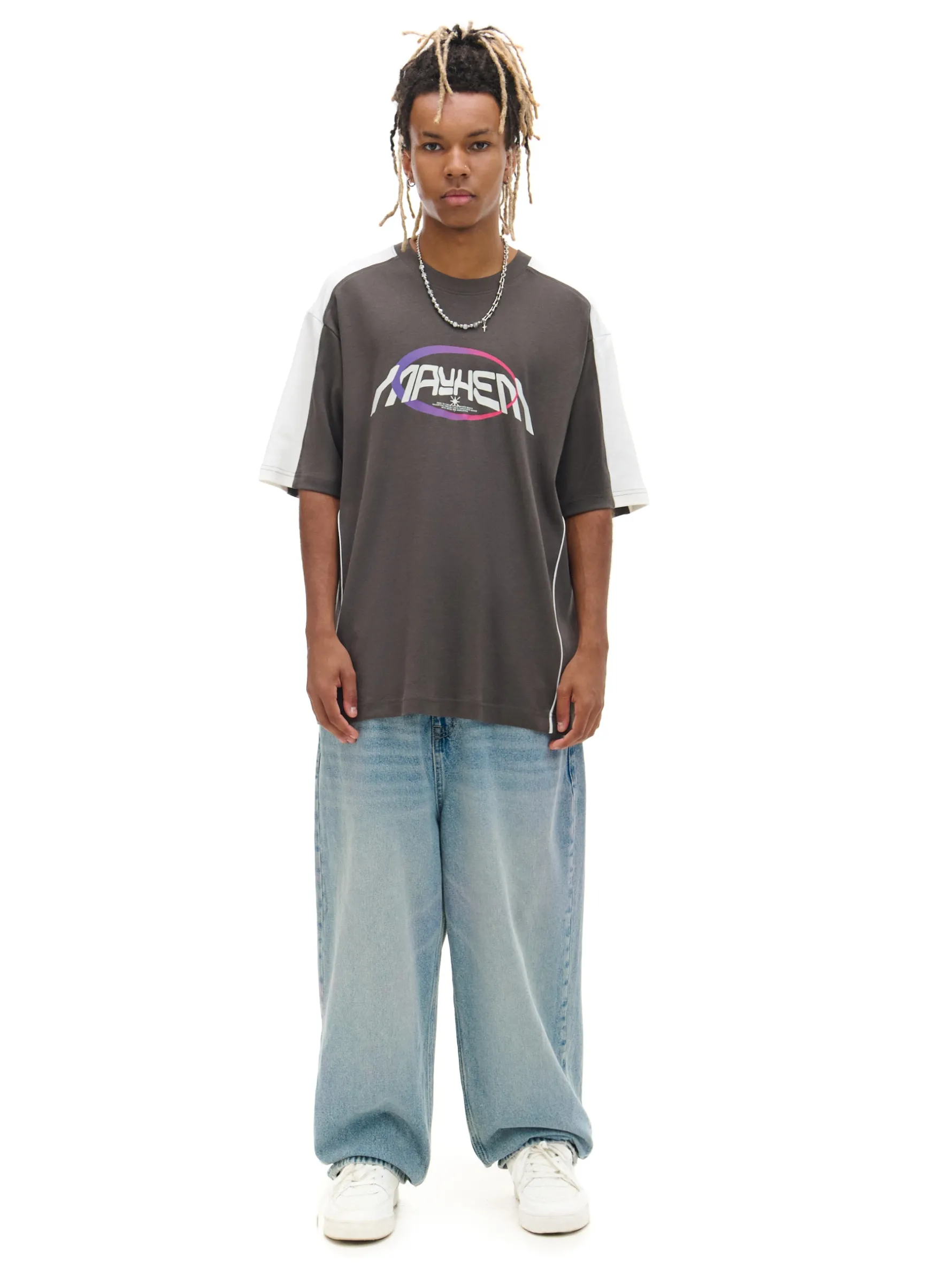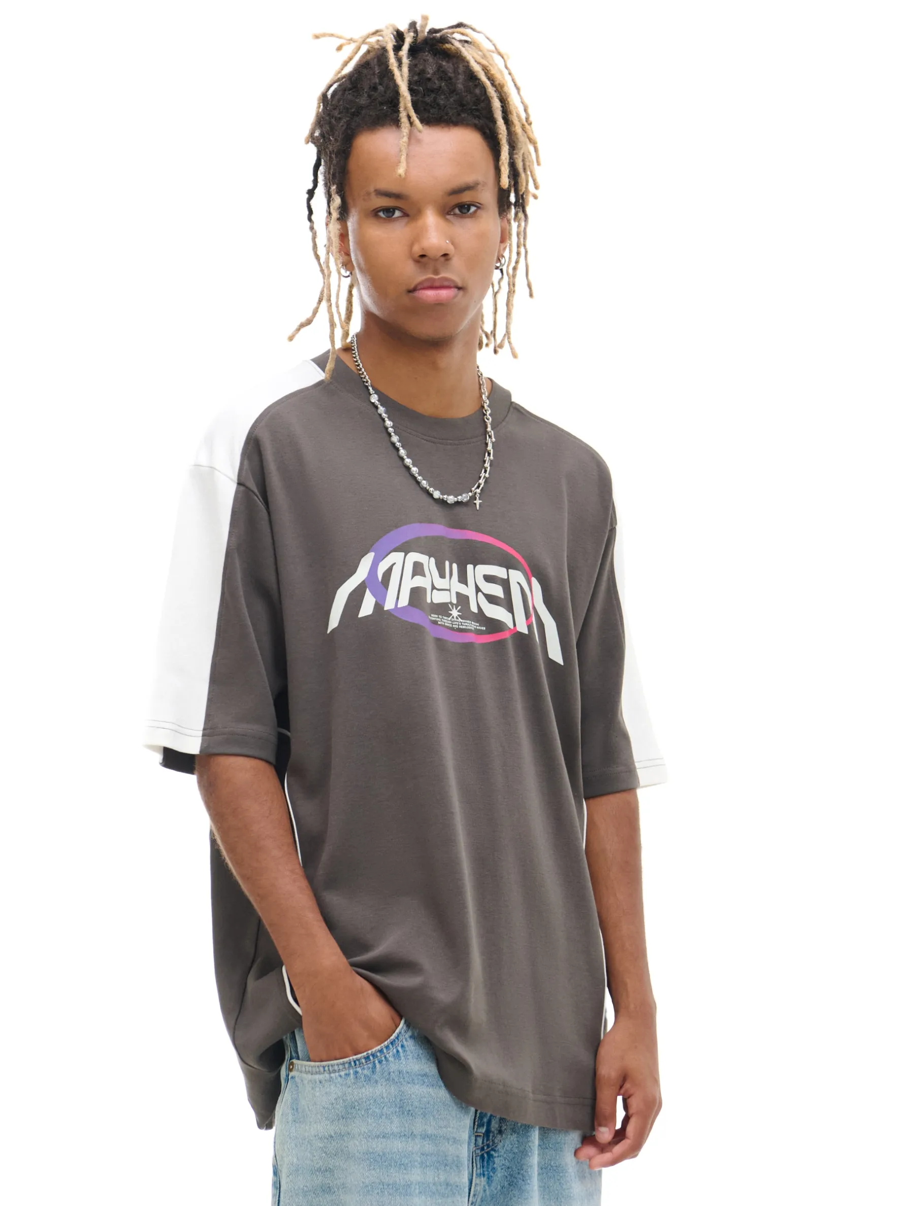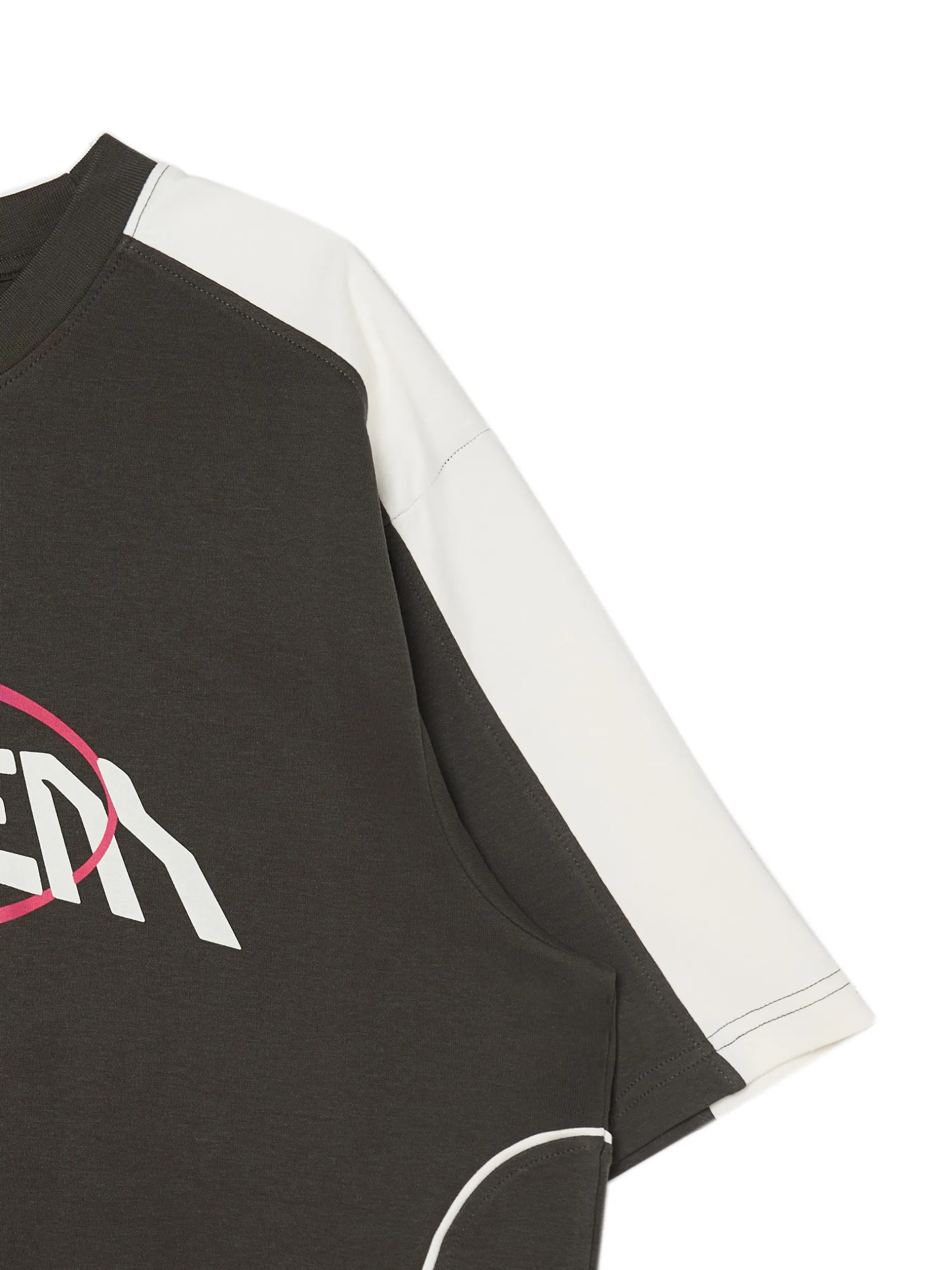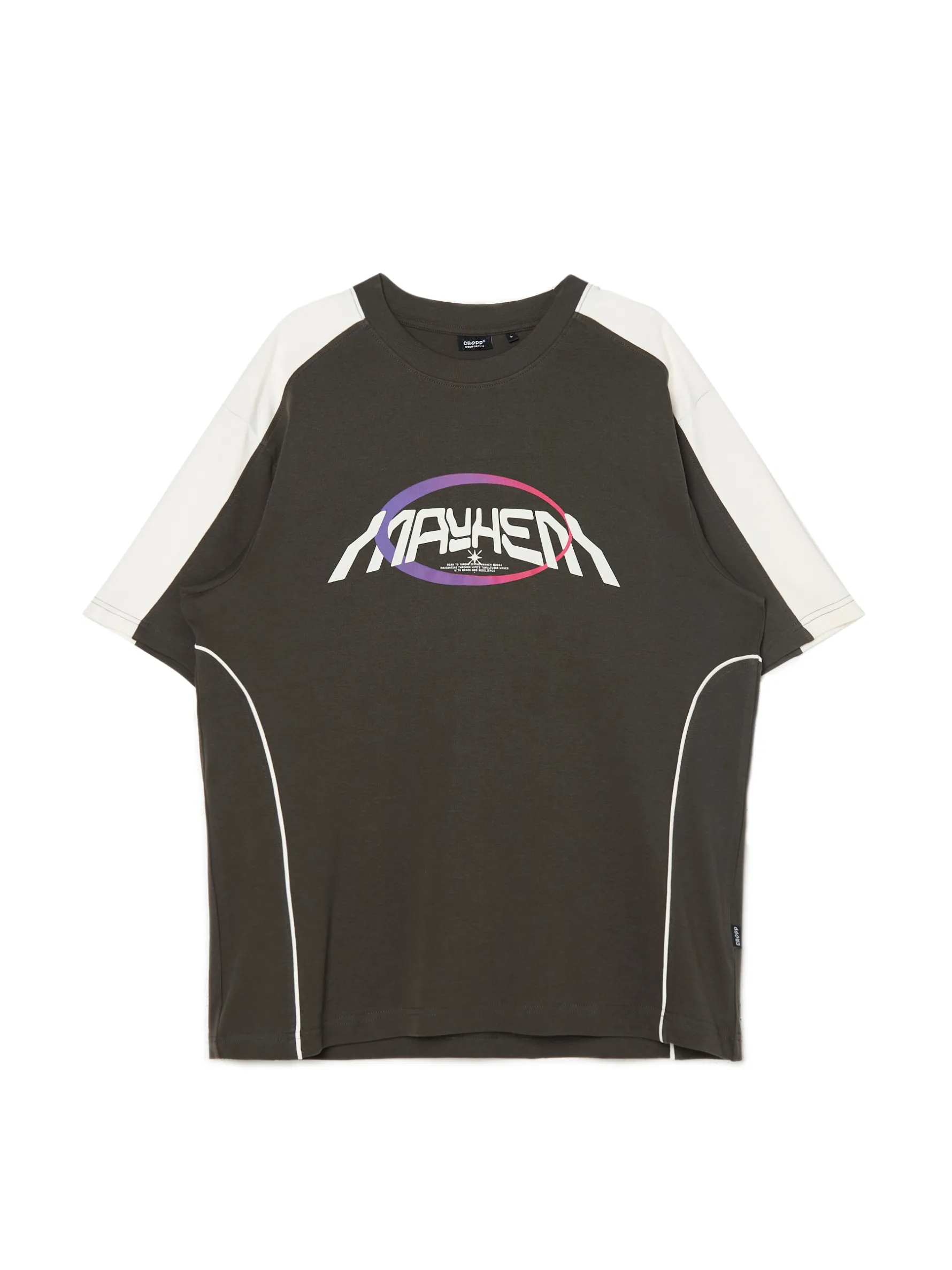Męska koszulka z krótkim rękawem uszyta z oddychającej, bawełnianej dzianiny. Idealna na rower, deskę, czy spontaniczne wypady z ekipą. 100% bawełny wygodny krój comfort okrągły dekolt z lamówką krótkie rękawy kontrastowy nadruk z przodu ozdobne przeszycia