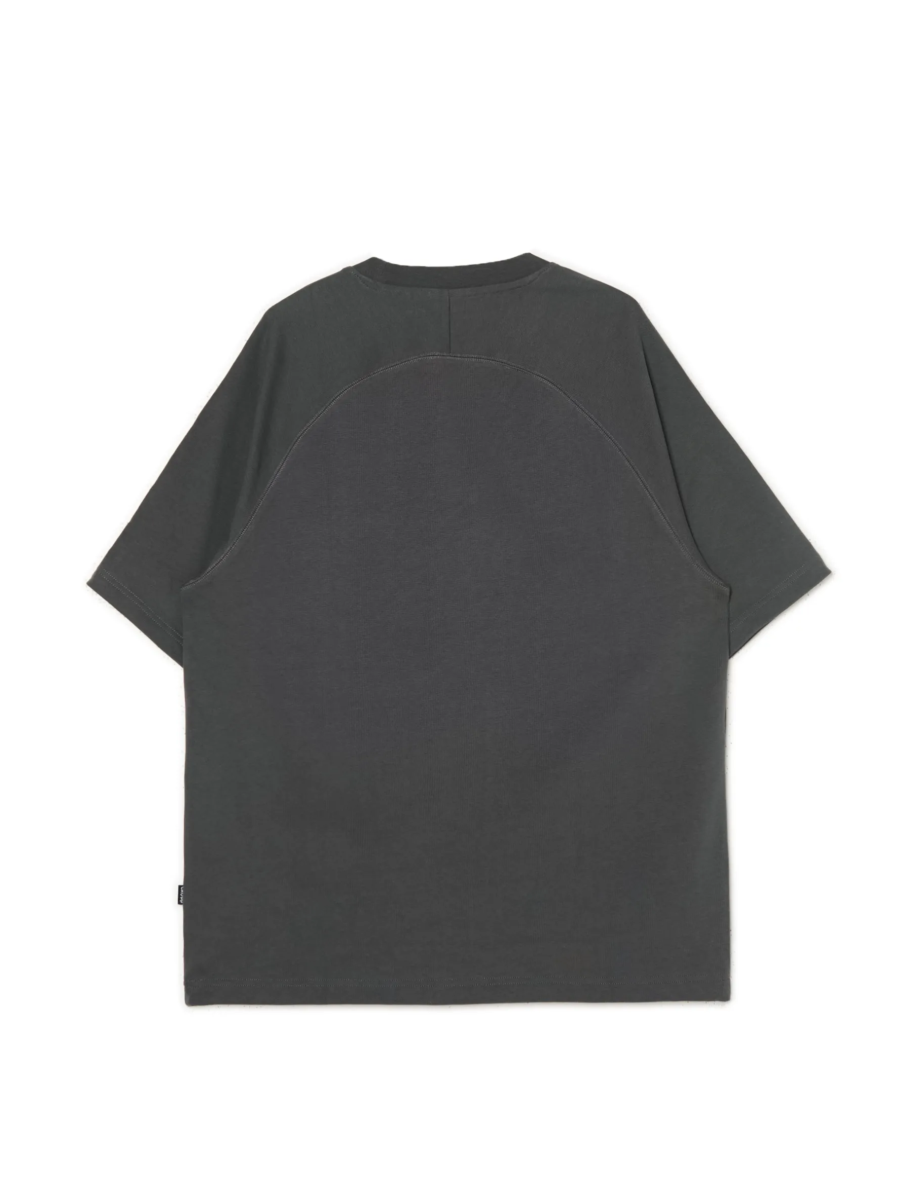 T-shirt męski w kolorze szarym, uszyty z bawełnianego materiału. Wyróżnikiem tego modelu jest kieszonka typu cargo na przodzie zapinana na zamek. 100% bawełny wygodny krój comfort krótkie, raglanowe rękawy półokrągły dekolt ze ściągaczem kieszeń piersiowa z krytym zamkiem Wzrost modela: 185 cm