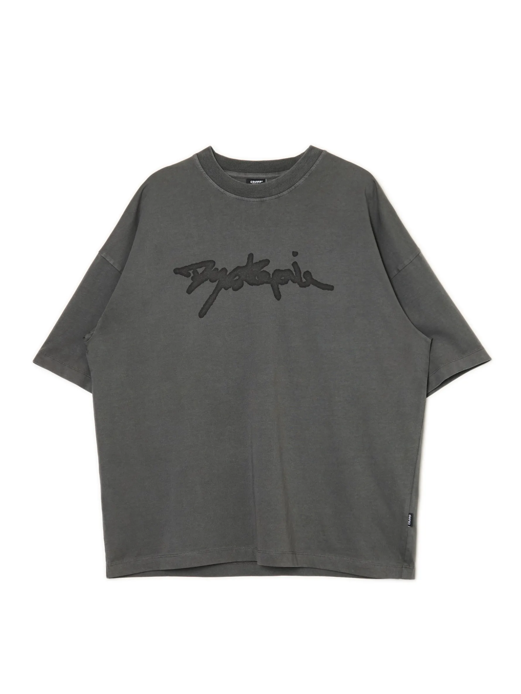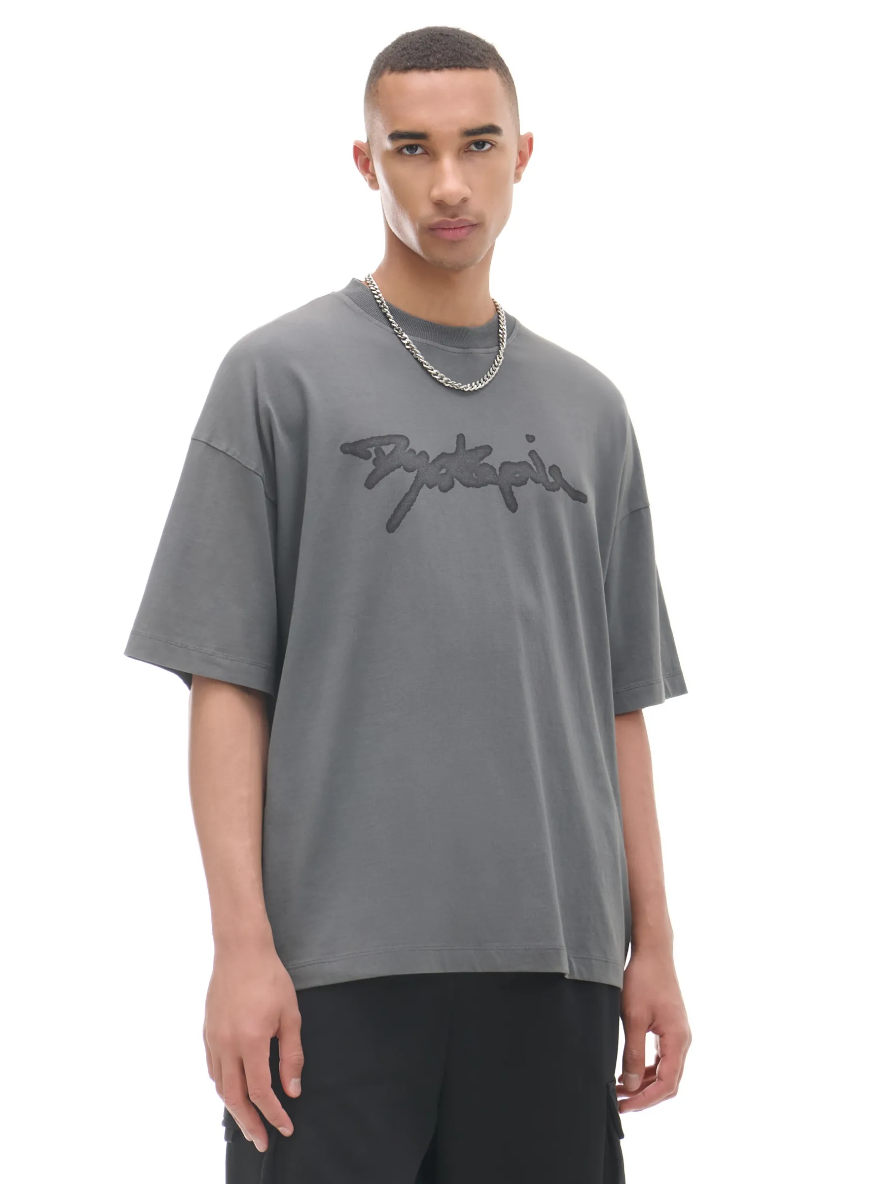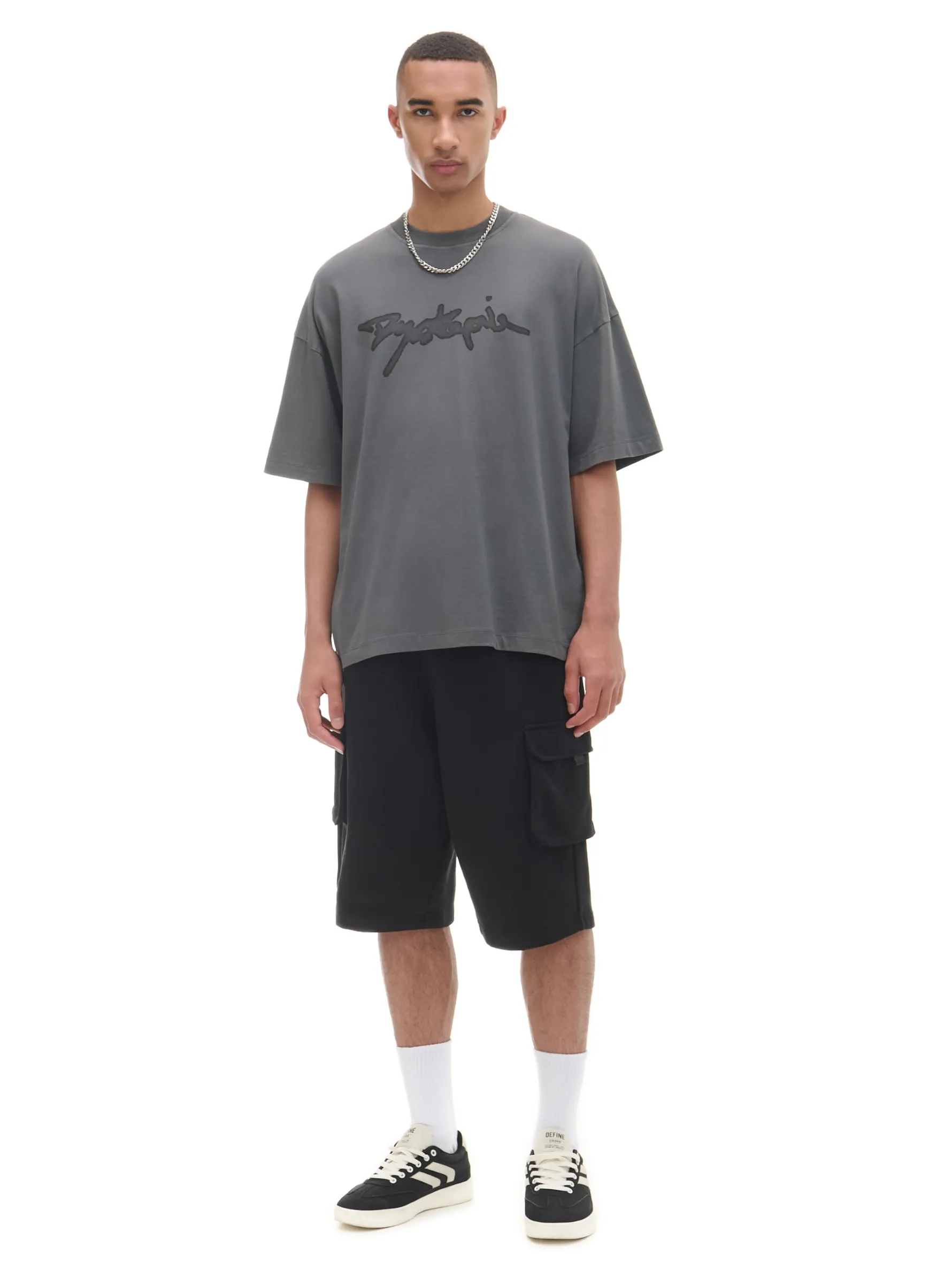 Męska koszulka w kroju boxy, uszyta z bawełny w kolorze szarym z nadrukiem tekstowym. Fituje z każdym rodzajem spodni! 100% bawełny obszerny krój boxy krótkie, szerokie rękawy obniżona linia ramion napis z przodu efekt sprania na całości Wzrost modela: 185 cm