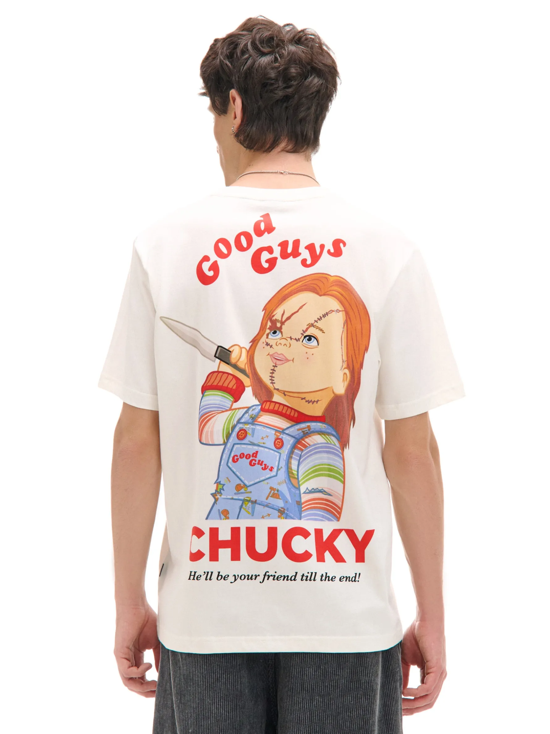 Męska kremowa koszulka, uszyta w 100% z bawełny. Idealna, jeśli kochasz horrory, Halloween, serię o demonicznej Laleczce Chucky, straszenie swoich znajomych… albo wszystko to na raz! regularny krój krótkie rękawy z przodu niewielka okrągła aplikacja z podobizną Laleczki Chucky z tyłu duży nadruk z motywem Chucky i napisami CHUCKY FRANCHISE © UNIVERSAL CITY STUDIOS LLC. ALL RIGHTS RESERVED