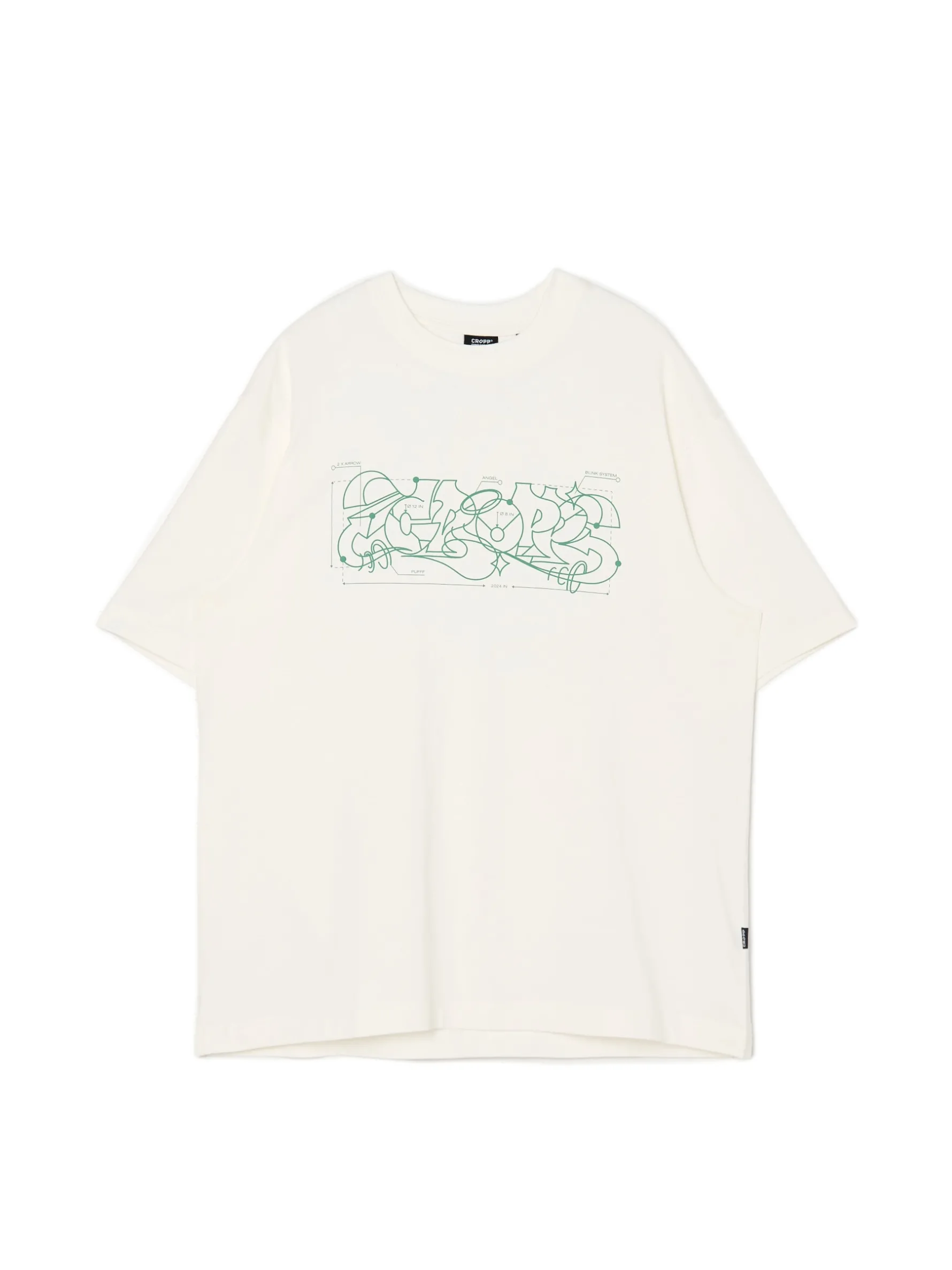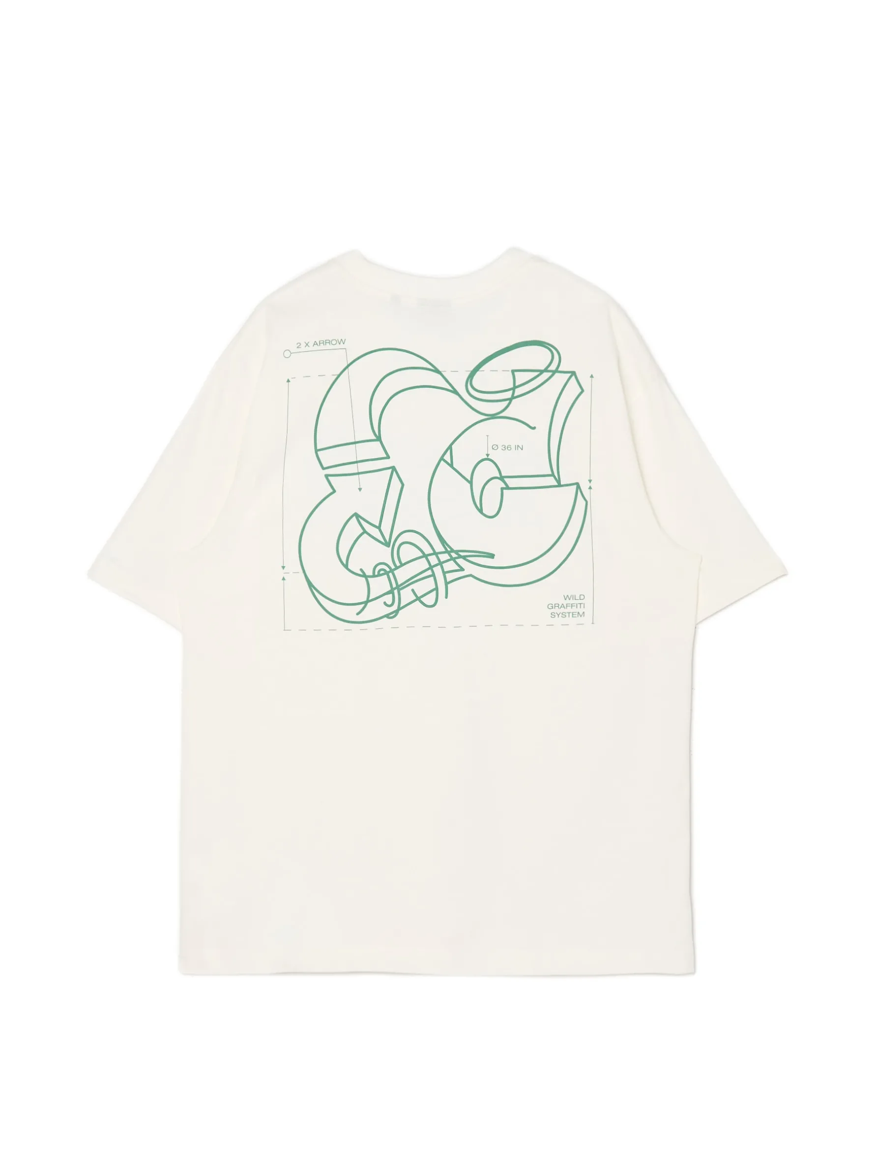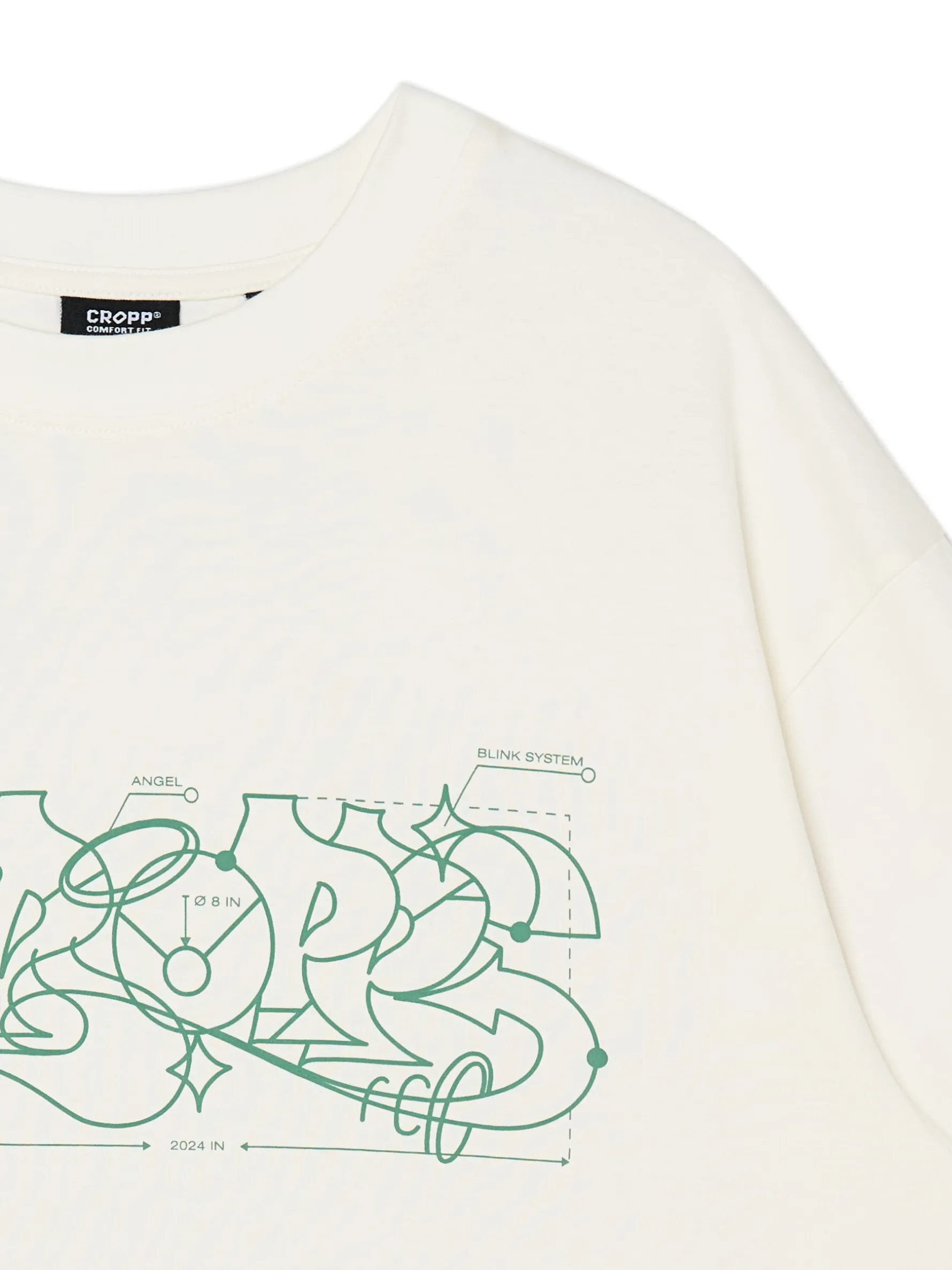 Męska koszulka w kolorze kremowym, uszyta z dzianiny zawierającej 100% bawełny. Podstawa do streetwearowej stylóweczki! wygodny krój comfort krótkie rękawy z przodu i z tyłu nadruki inspirowane futurystycznym graffiti Model prezentuje produkt w rozmiarze M/L. Wzrost modela: 185 cm