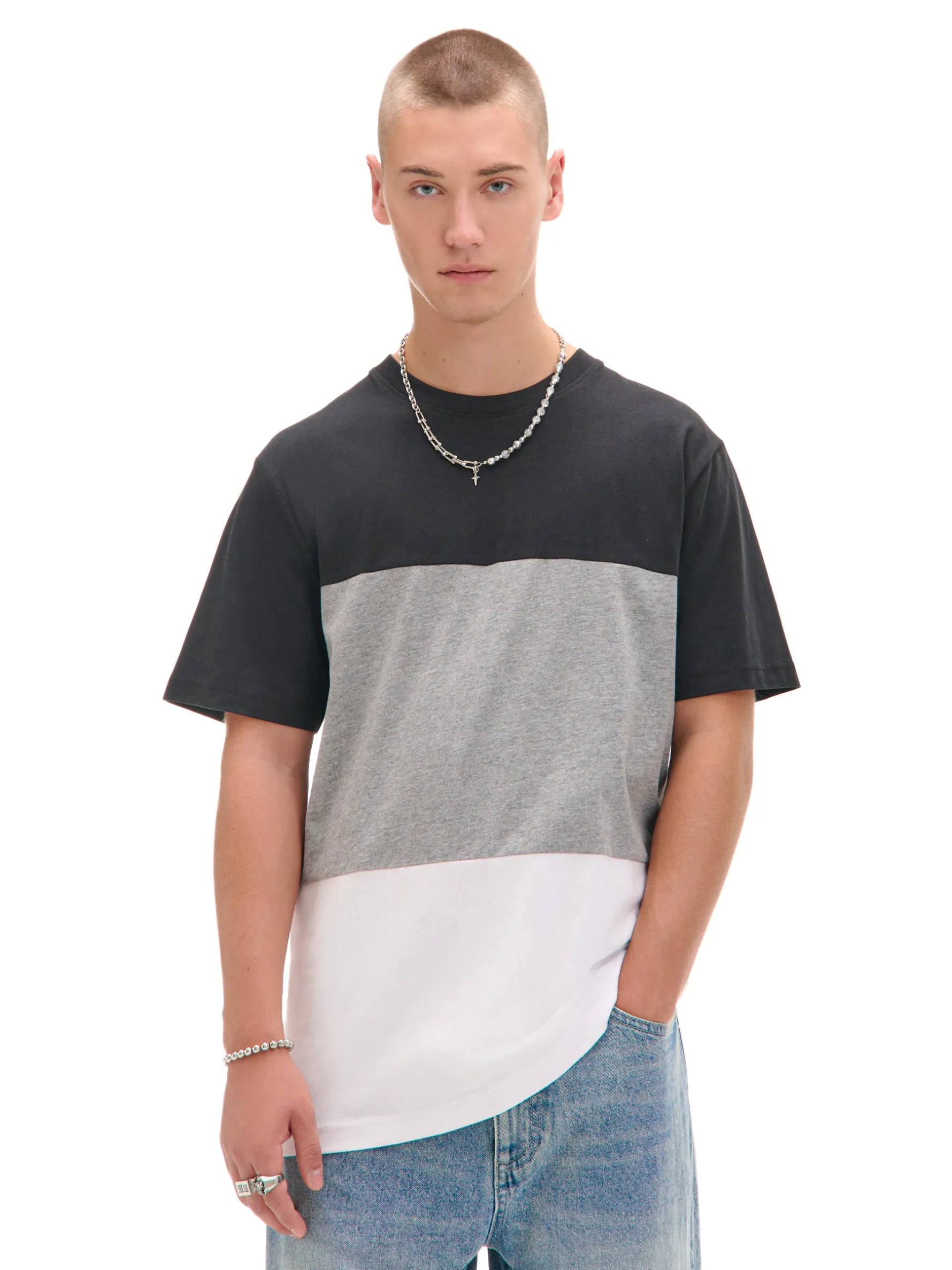 Męski T-shirt w pasy (czarne, szare i białe), uszyty w 100% z bawełny. regularny krój krótkie rękawy ciekawy wzór w szerokie pasy Wzrost modela: 185 cm
