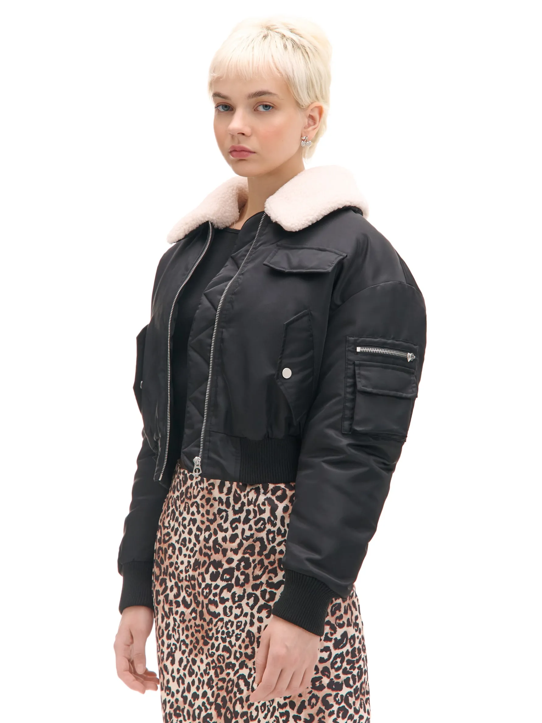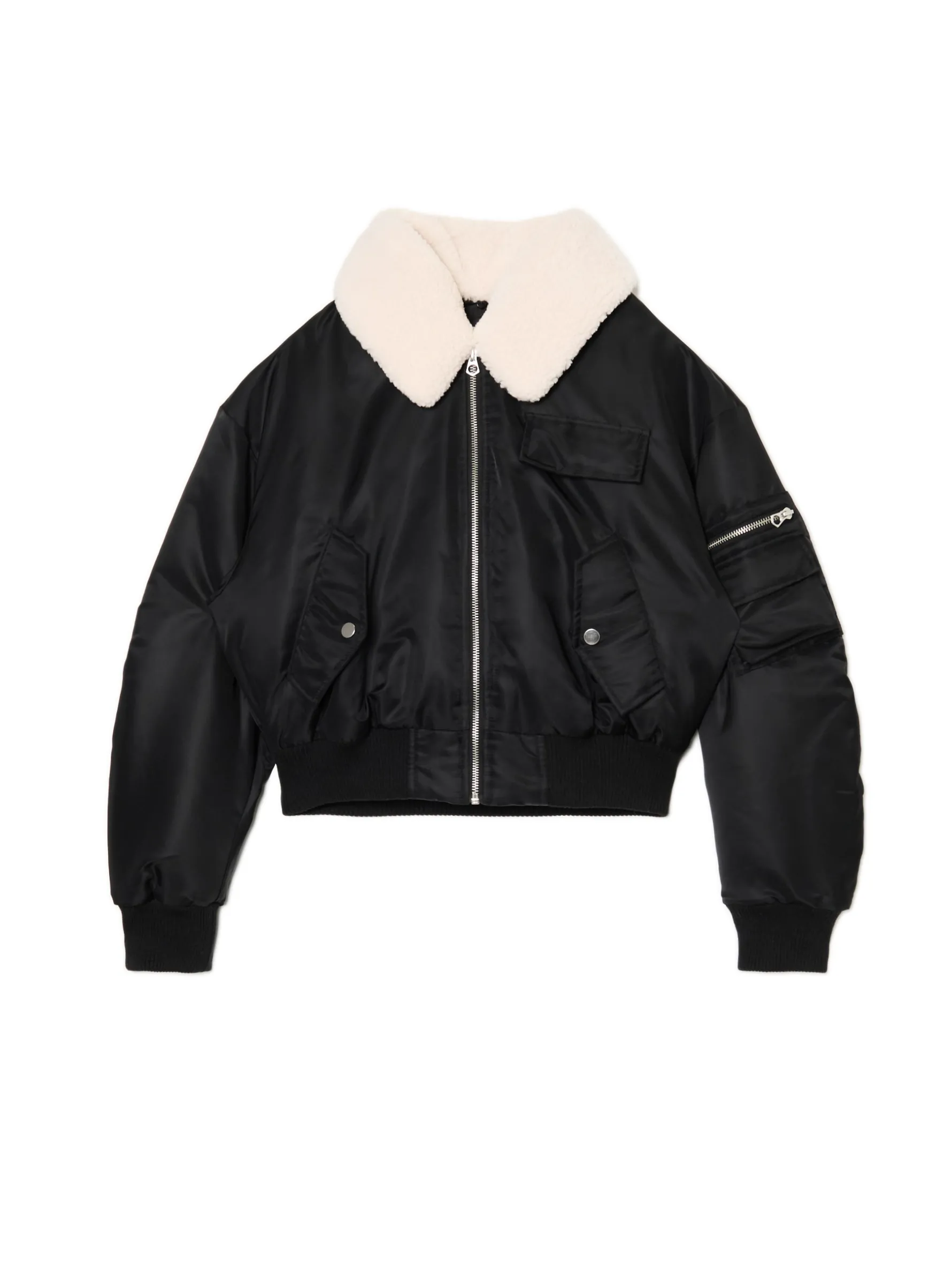 Kurtka damska typu pilotka uszyta z nylonowej tkaniny z efektem sprania. W zestawie odpinany kołnierz z obszyciem. Idealna basic przejściówka na różne okazje. regularny, nieco krótszy krój zapięcie na suwak odpinany kołnierz z miękkiego sztucznego baranka dół i rękawy wykończone ściągaczem imitacja kieszeni z patką na piersi dwie kieszenie z patkami i zapięciem na zatrzaski dwie dodatkowe kieszonki na rękawie – zapinane na suwak i na rzep efekt sprania