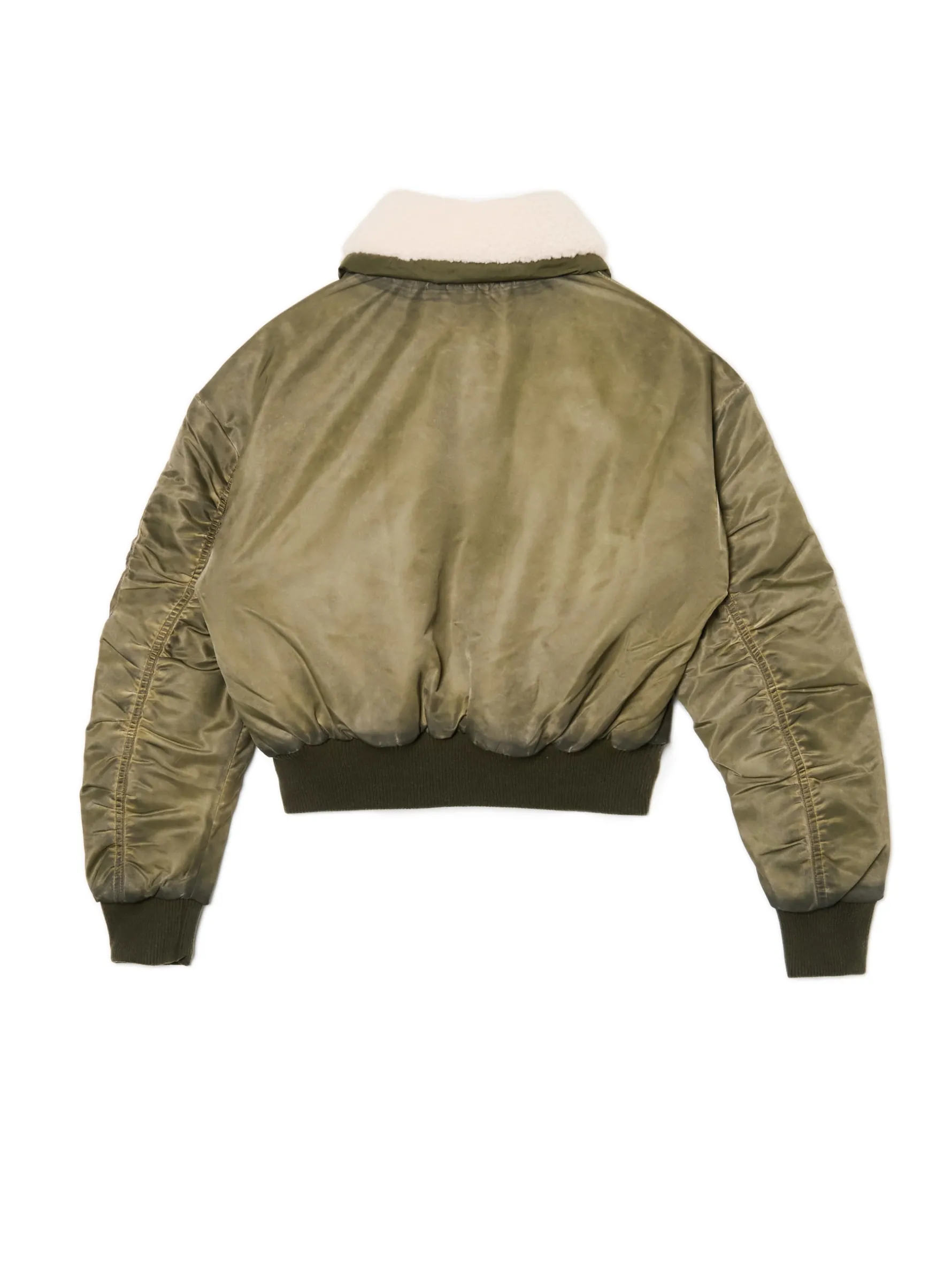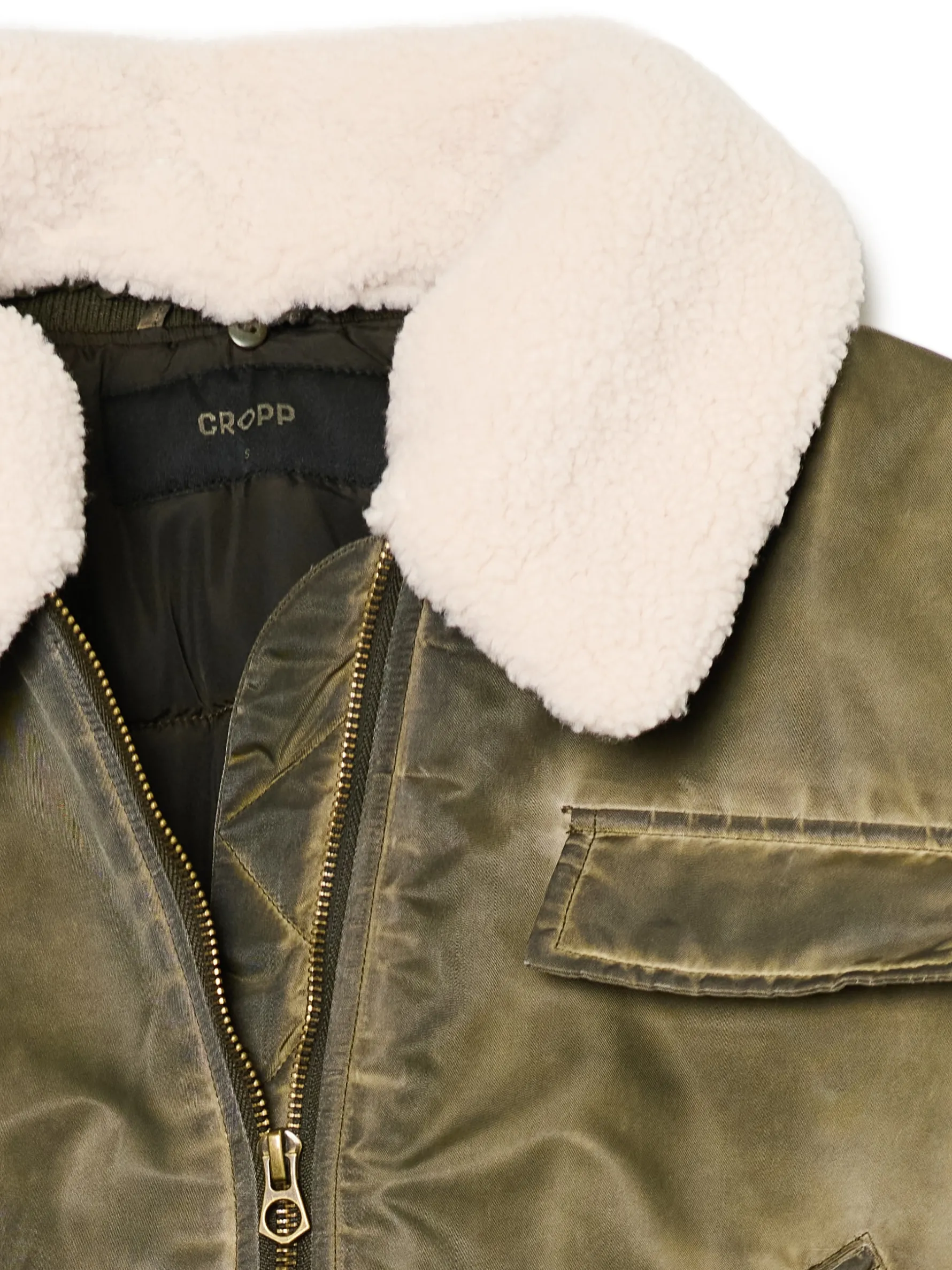 Kurtka damska typu pilotka uszyta z nylonowej tkaniny z efektem sprania. W zestawie odpinany kołnierz z obszyciem. Idealna basic przejściówka na różne okazje. regularny, nieco krótszy krój zapięcie na suwak odpinany kołnierz z miękkiego sztucznego baranka dół i rękawy wykończone ściągaczem imitacja kieszeni z patką na piersi dwie kieszenie z patkami i zapięciem na zatrzaski dwie dodatkowe kieszonki na rękawie – zapinane na suwak i na rzep efekt sprania