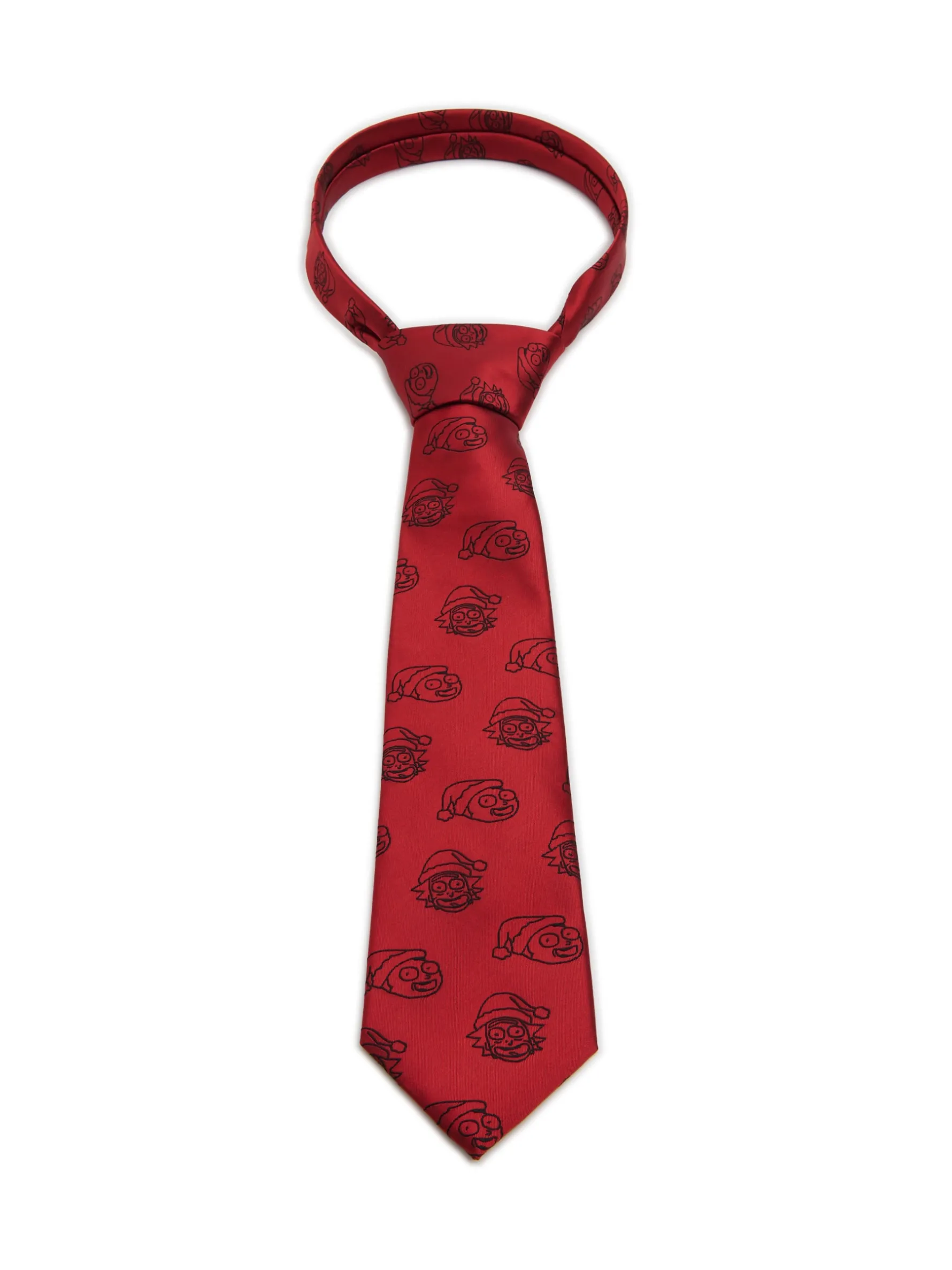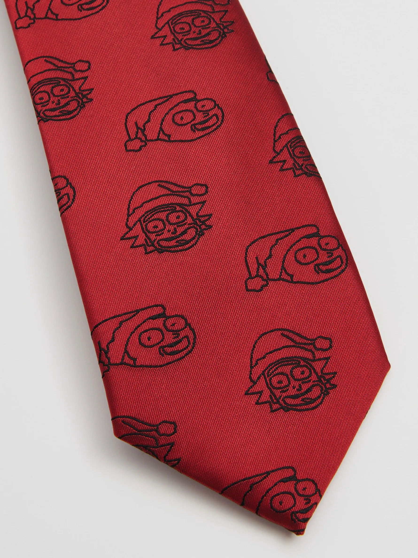 Męski krawat uszyty z trwałej tkaniny w świątecznym, czerwonym kolorze. Na całej powierzchni nadruki z postaciami serii Rick i Morty. Matchuj z ulubionymi koszulami! RICK AND MORTY and all related characters and elements © & TM CN. (s24)