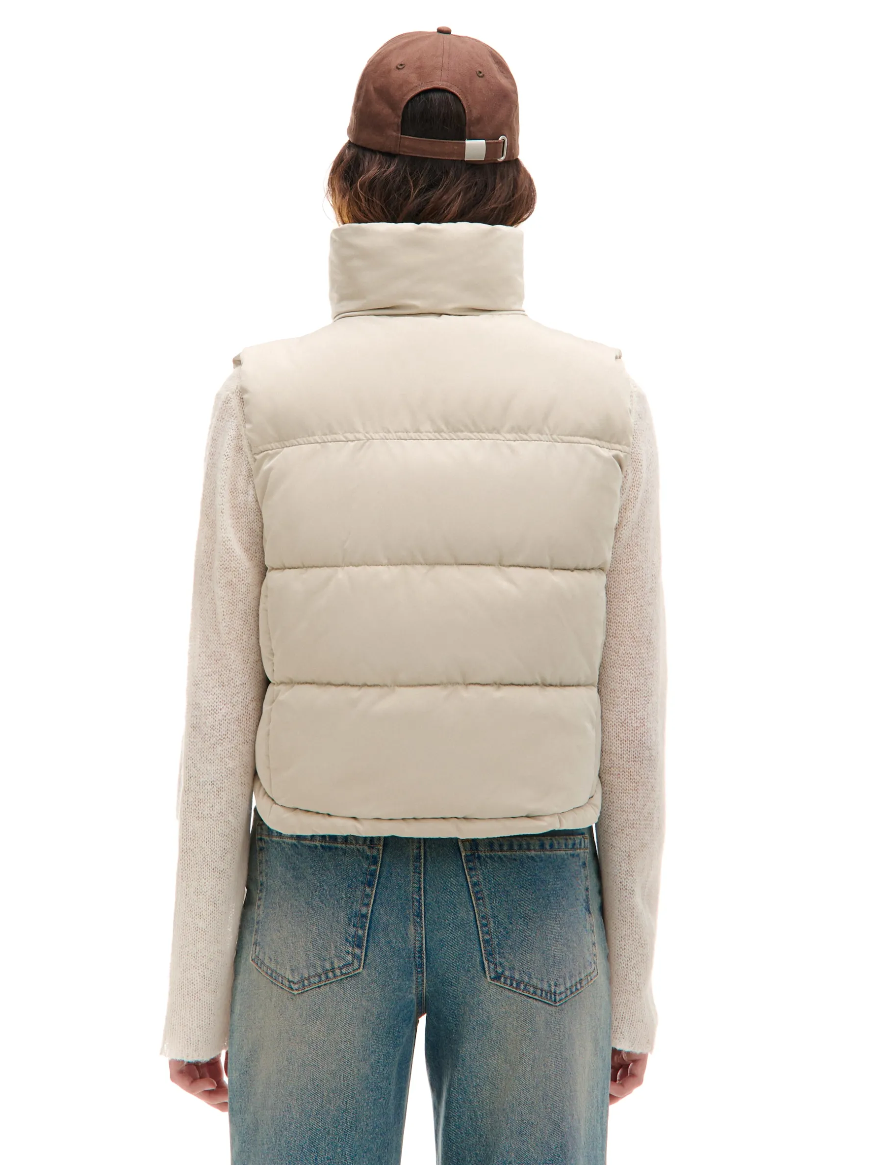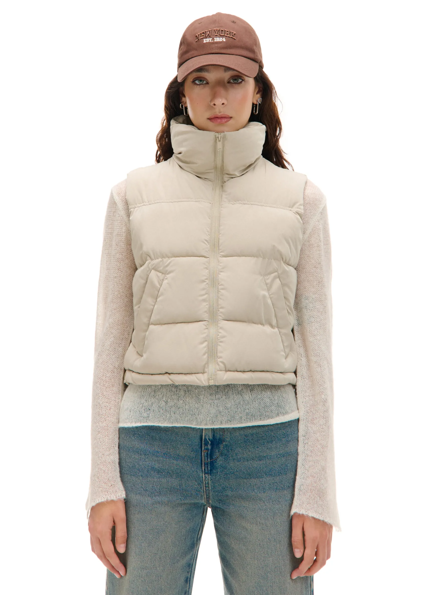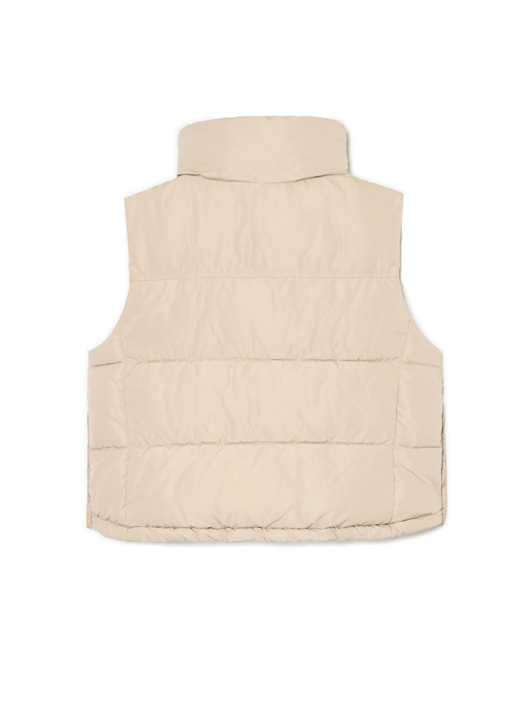 Beżowa pikowana kamizelka damska o regularnym kroju, wykonana z trwałej tkaniny. zapięcie na zamek na całej długości kołnierz w formie stójki, wyłożony ocieplającym trykotem dwie kieszenie boczne rozcięcie z boku zapinane na zatrzaski syntetyczne wypełnienie