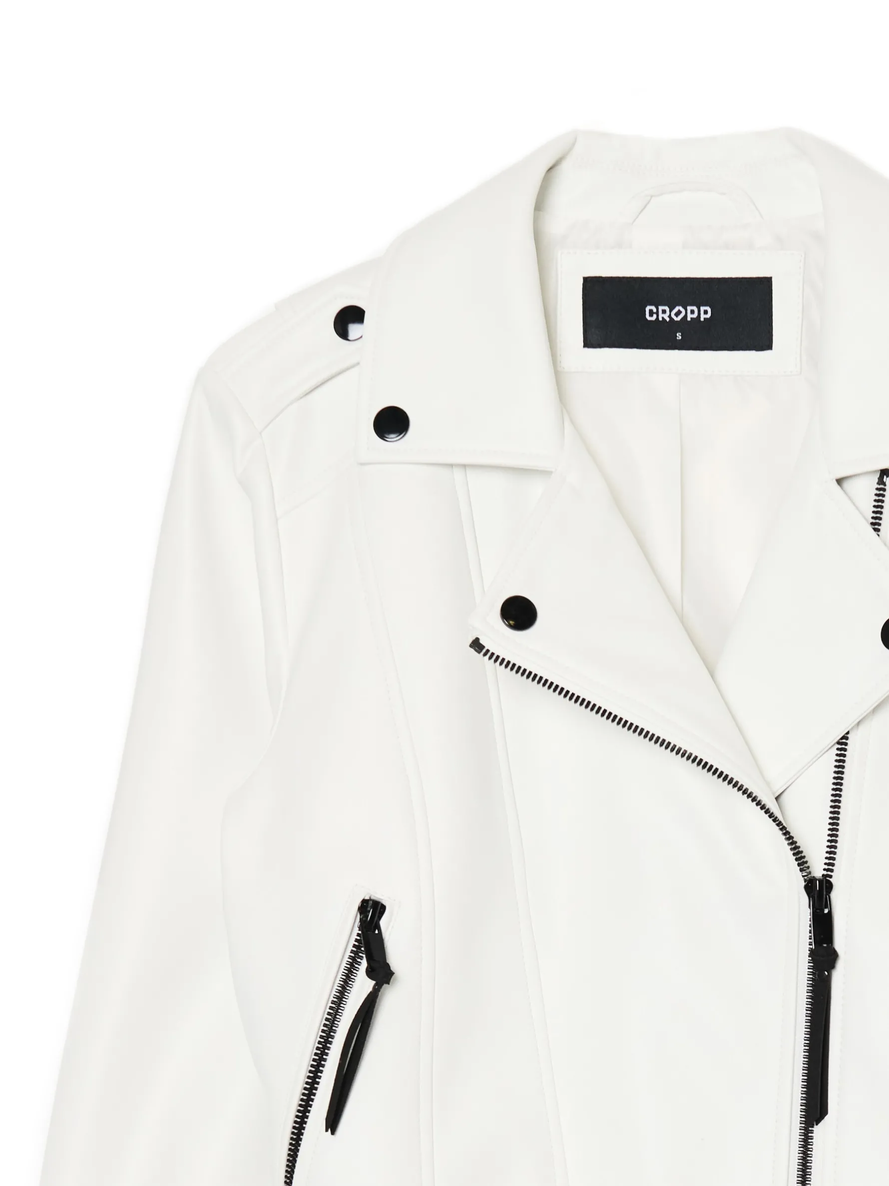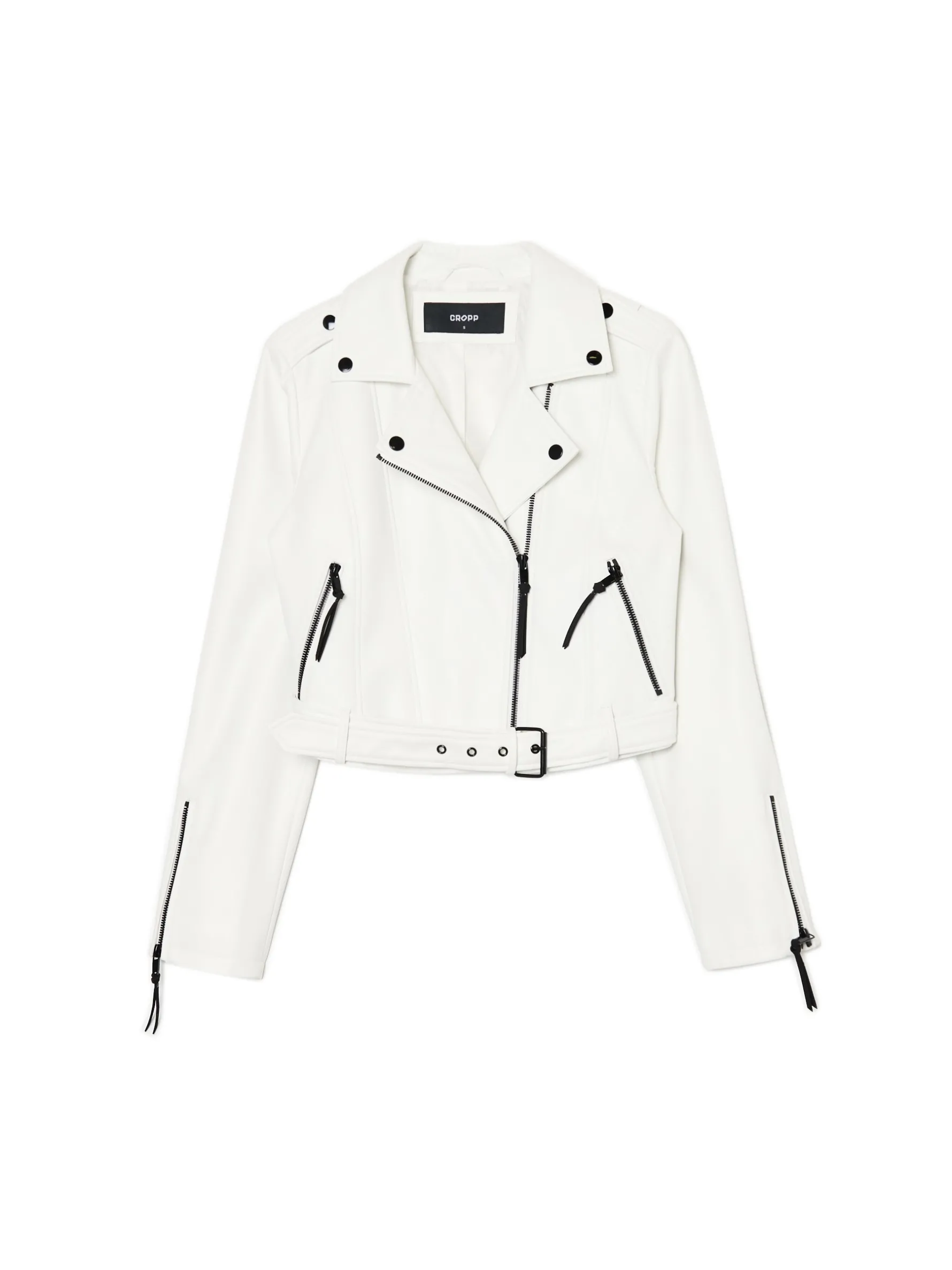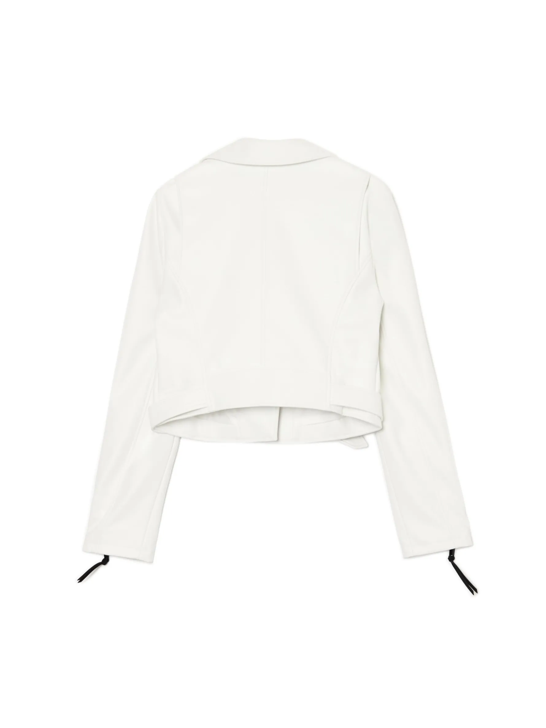 Damska kurtka typu biker, wykonana z sztucznej skóry. Ten biały model będzie idealnym dodatkiem do Twoich stylizacji. kurtka typu biker z imitacji skóry zapinana na zamek na całej długości dół wykończony paskiem z metalową sprzączką długie rękawy z suwakiem przy mankiecie kołnierz z otwartymi klapami góra zapinana na zatrzaski dwie kieszenie z zamkami po bokach ozdobne pullery przy rękawach