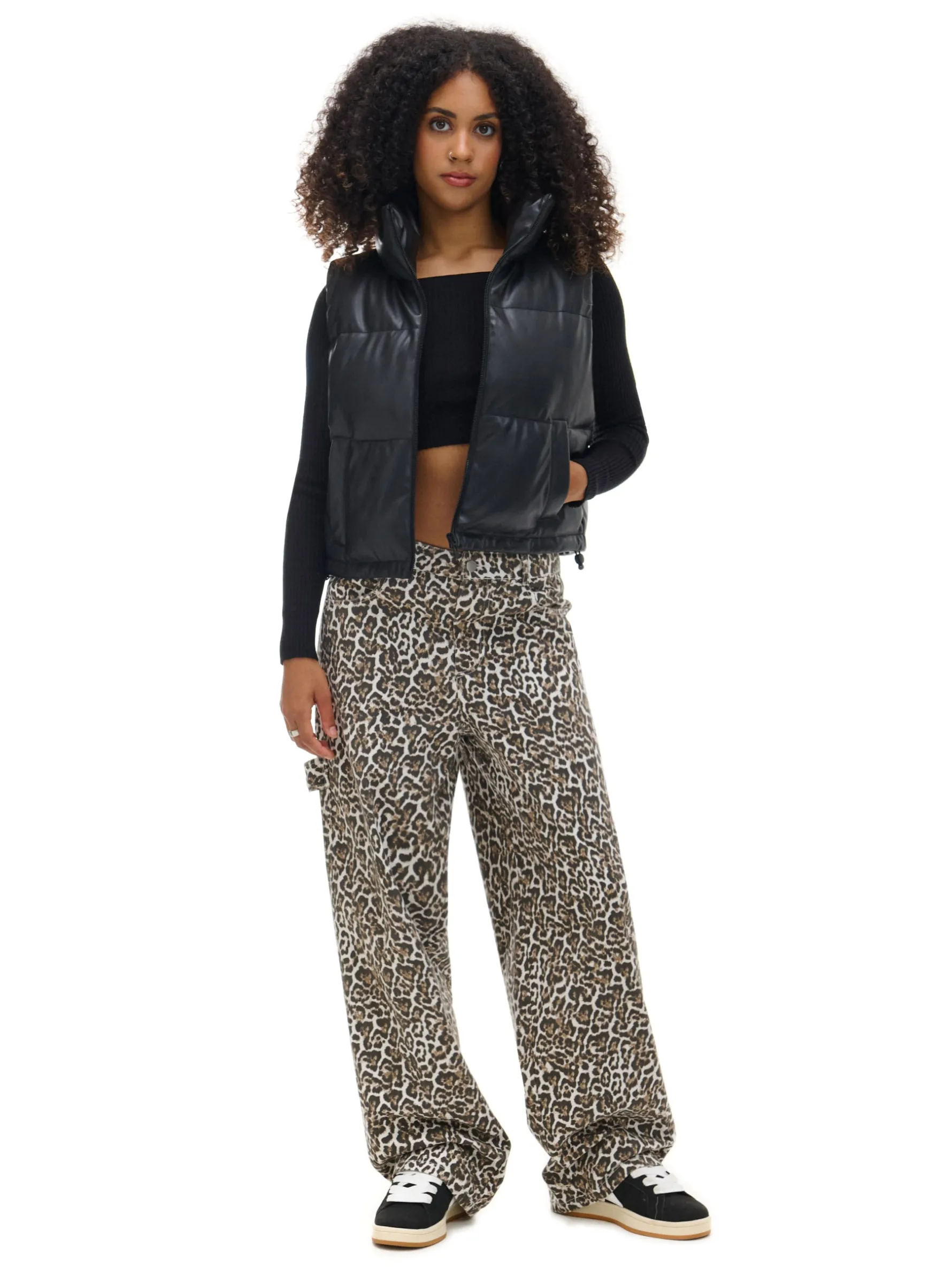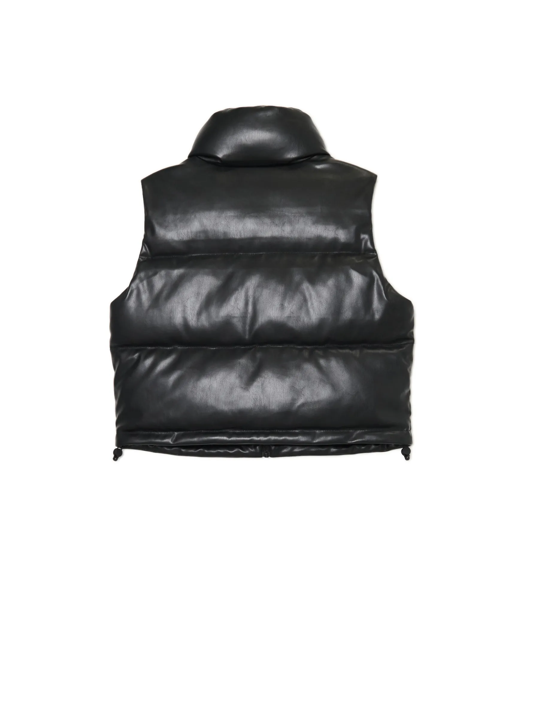 Damska pikowana kamizelka typu puffer o krótszym kroju, uszyta z imitacji skóry. Idealna na sezon przejściowy, dzięki delikatnemu wypełnieniu. kamizelka o krótszym kroju pikowanie na całości wewnątrz wykończenie na podszewce syntetyczne wypełnienie zapięcie na zamek na całej długości wysoka stójka bez rękawów dwie kieszenie po bokach regulacja dołu za pomocą gumek ze stoperami