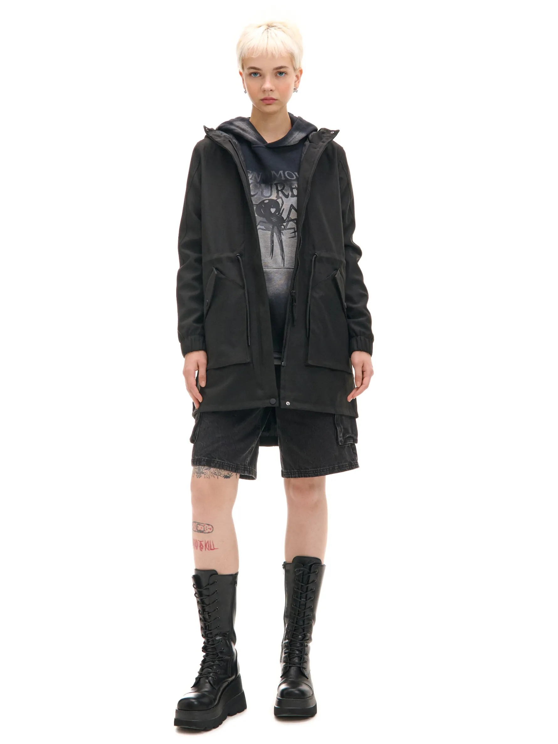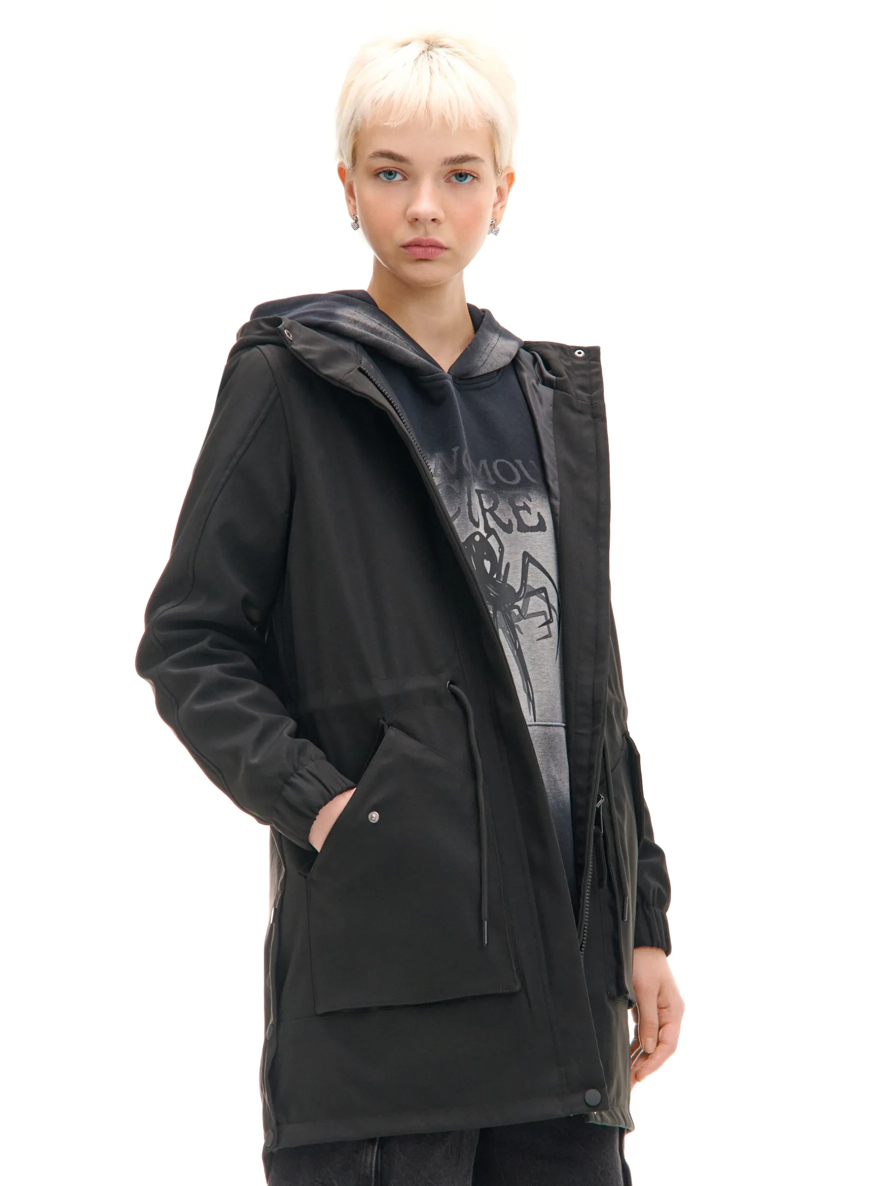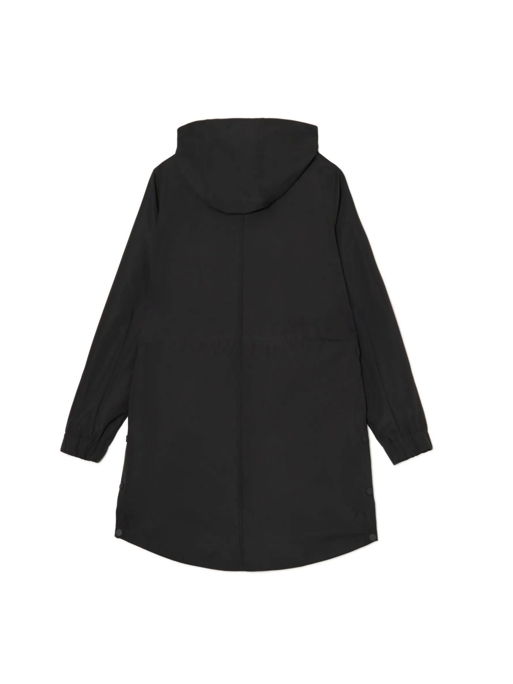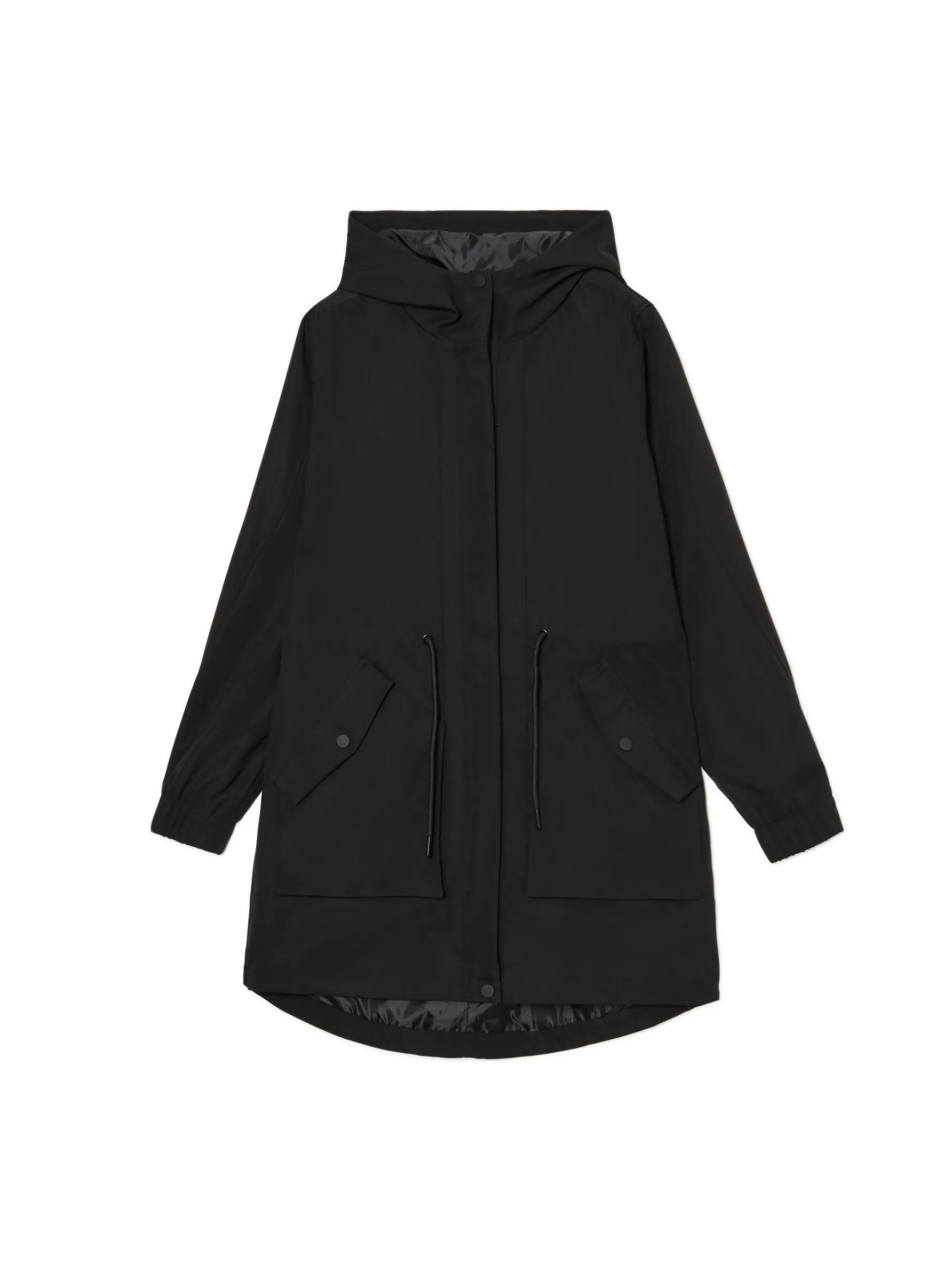 Damski płaszcz typu parka, uszyty z gładkiej czarnej tkaniny. Idealny na deszczowe jesienne dni i nie tylko! regularny krój wewnątrz wykończenie na gładkiej podszewce zapięcie na zamek ukryty pod listwą z napami obszerny kaptur długie rękawy ze ściągaczem wewnątrz mankietów regulacja w talii za pomocą sznurka kieszenie boczne z zatrzaskami dekoracyjne taśmy na ramionach