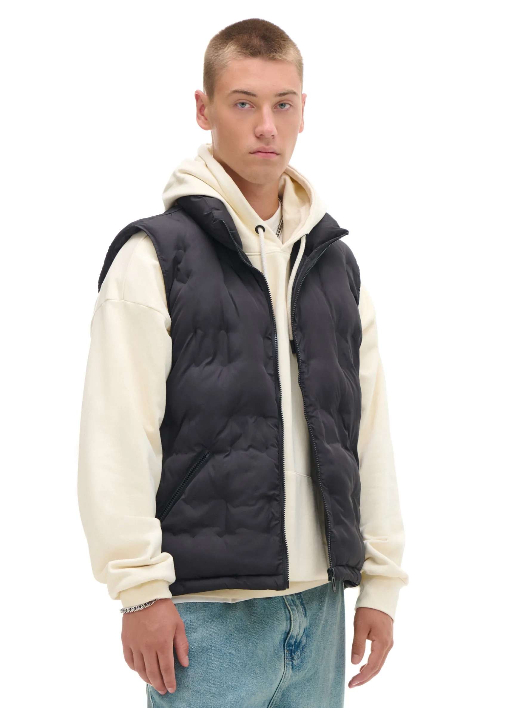 Czarna męska kamizelka uszyta z pikowanej tkaniny w unikatowym wzorze. Wszyte gumki przy ramionach dopasowują materiał do sylwetki. Dzięki kieszeniom na zamek Twój portfel i komórka będą bezpieczne. ocieplana kamizelka z pikowanej tkaniny zapinana na zamek na całej długości wysoka stójka szerokie ramiączka elastyczne gumy przy ramionach kieszenie boczne z zamkami Wzrost modela: 185 cm PROTECTION LEVEL 2rn Kurtka uszyta z tkaniny z lekkim wypełnieniem, której właściwości zapewnią Ci ochronę przed wiatrem i deszczem. Doskonale sprawdzi się w sezonie przejściowym.