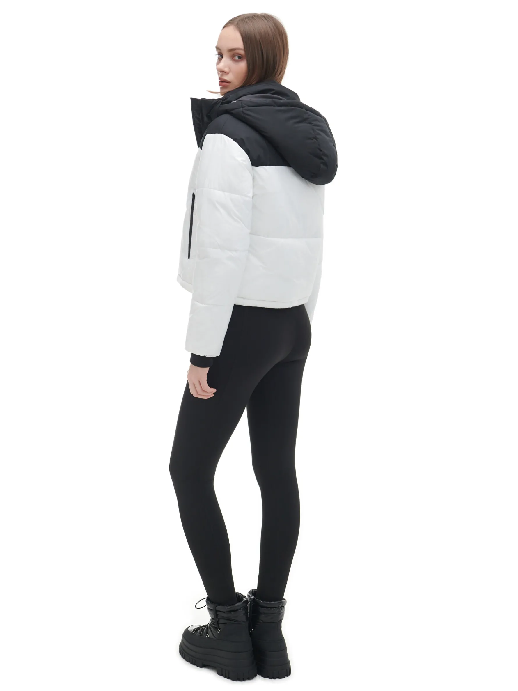 Damska zimowa kurtka puffer, uszyta z wododpornej tkaniny. krótki fason zapięcie na suwak odpinany kaptur z regulacją, pod szyją stójka rękawy zakończone wewnętrznymi dzianinowymi ściągaczami dolny brzeg z możliwością regulacji za pomocą elastycznej gumki ze stoperami dwie kieszenie zapinane na suwaki syntetyczne wypełnienie, podszewka