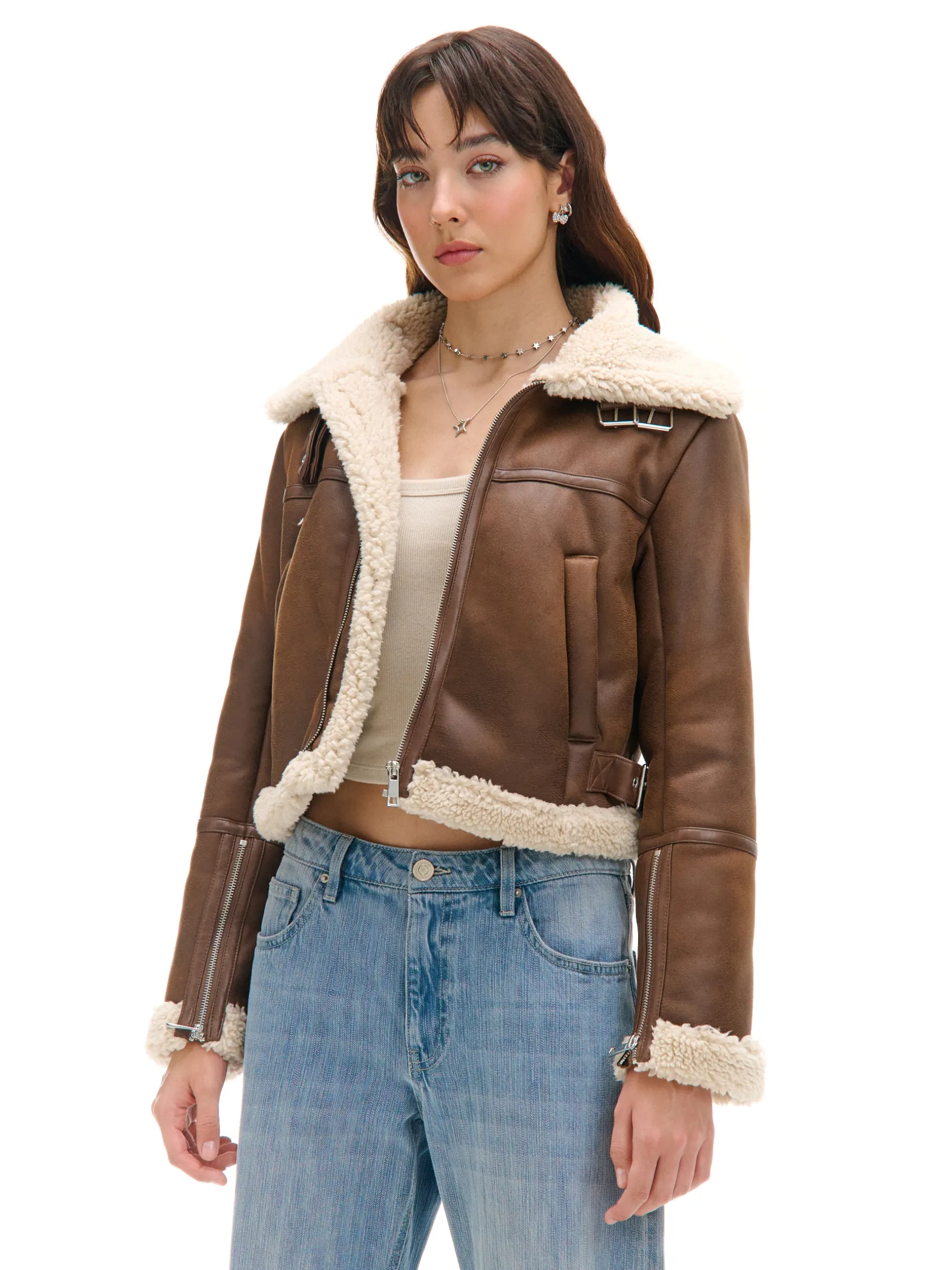 Damska kurtka typu biker ze sztucznego zamszu z kontrastowym wykończeniem z miękkiego materiału imitującego kożuch. Idealna na jesienny sezon przejściowy. regularny krój zapięcie na suwak kołnierz ze sztucznego futerka, możliwość spięcia w stójkę ze pomocą dwóch pasków rękawy i dół zakończone futerkiem przy rękawach suwaki regulacja talii za pomocą pasków z klamrami dwie kieszenie boczne