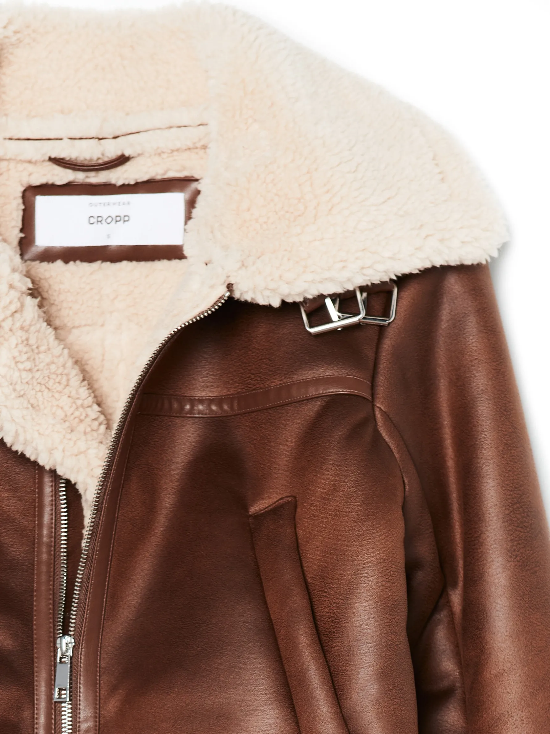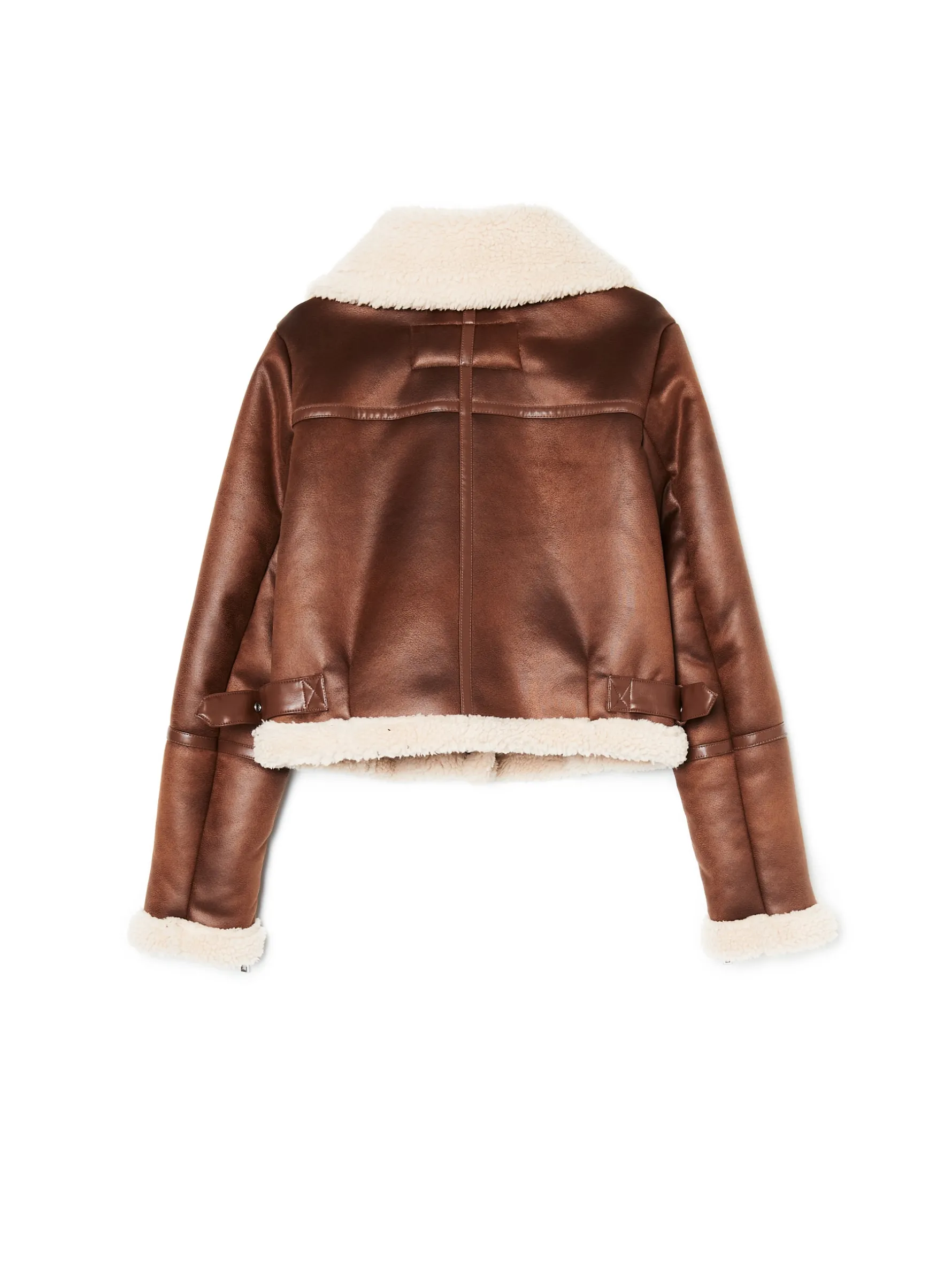 Cropp Kurtki, Płaszcze|Kożuszki, Futerka*Brązowa kurtka biker z kożuchem beżowy