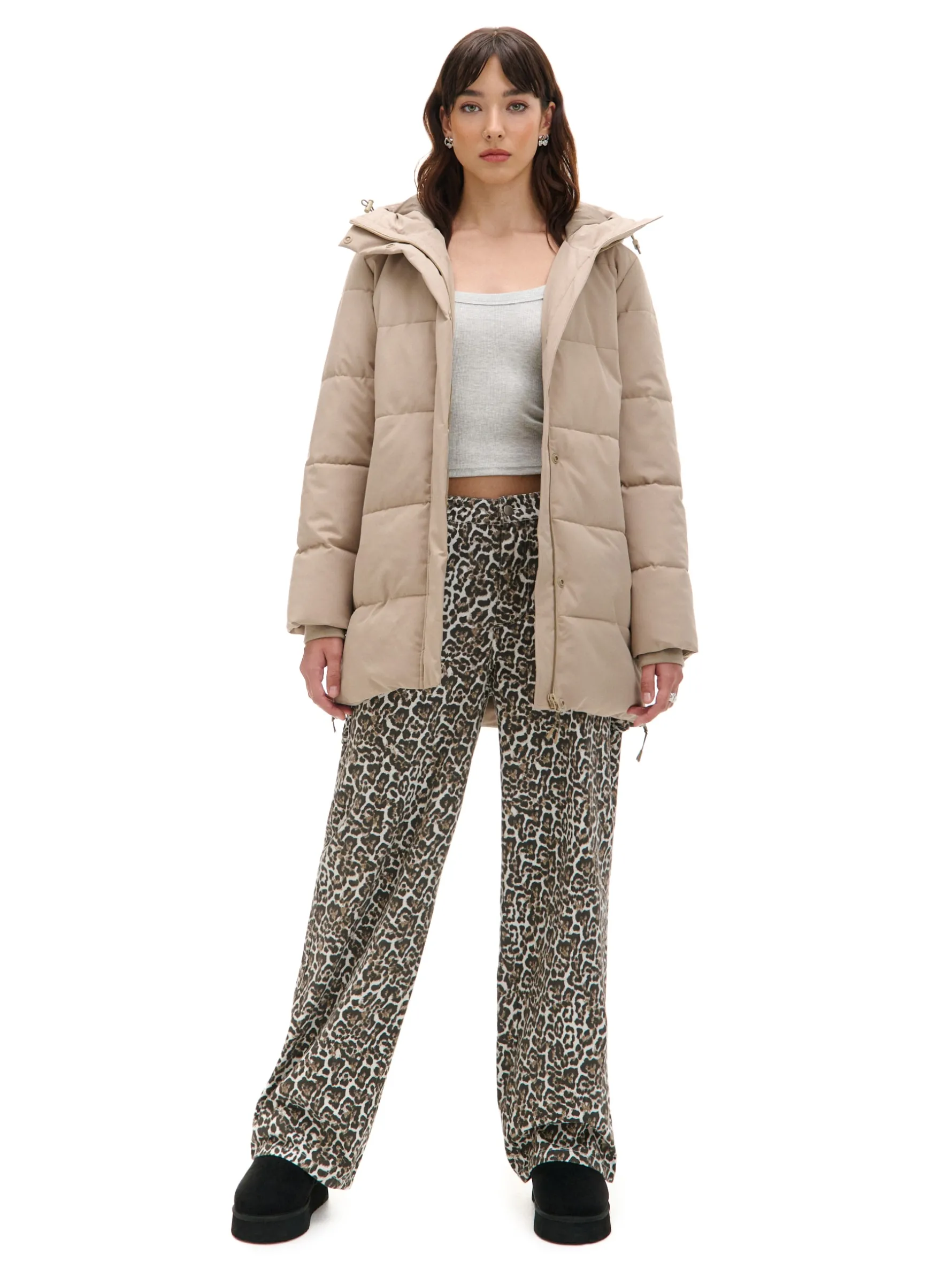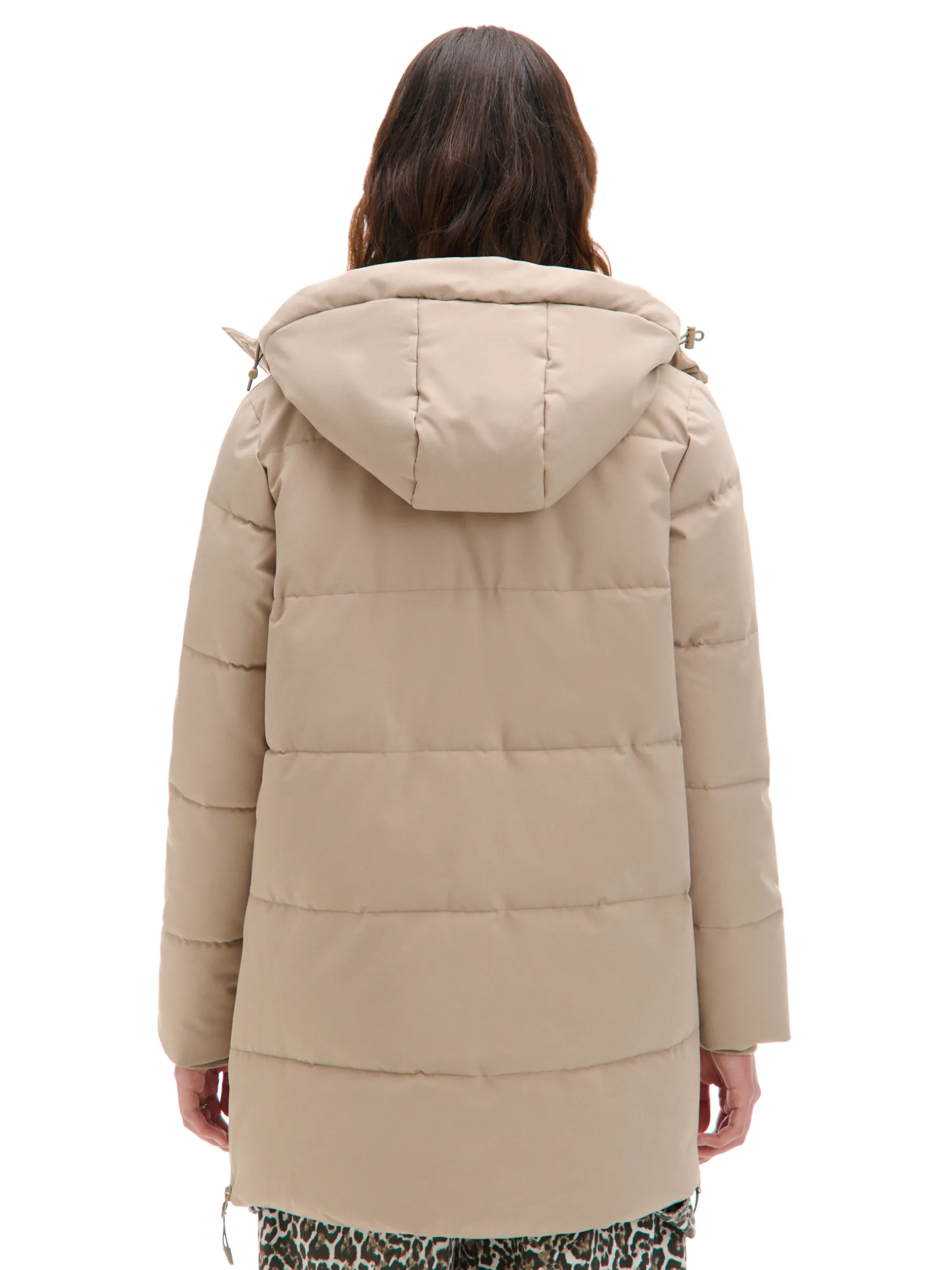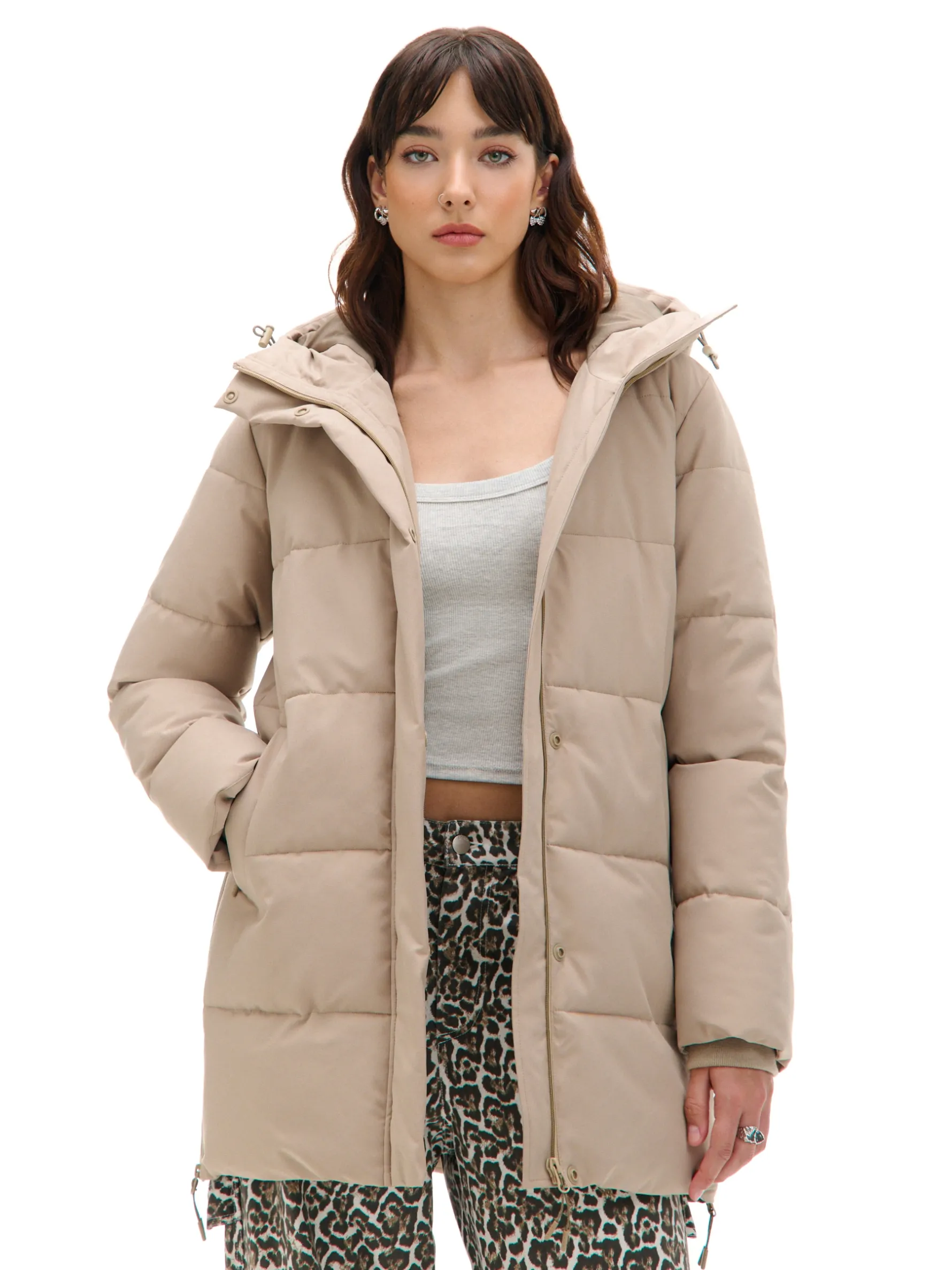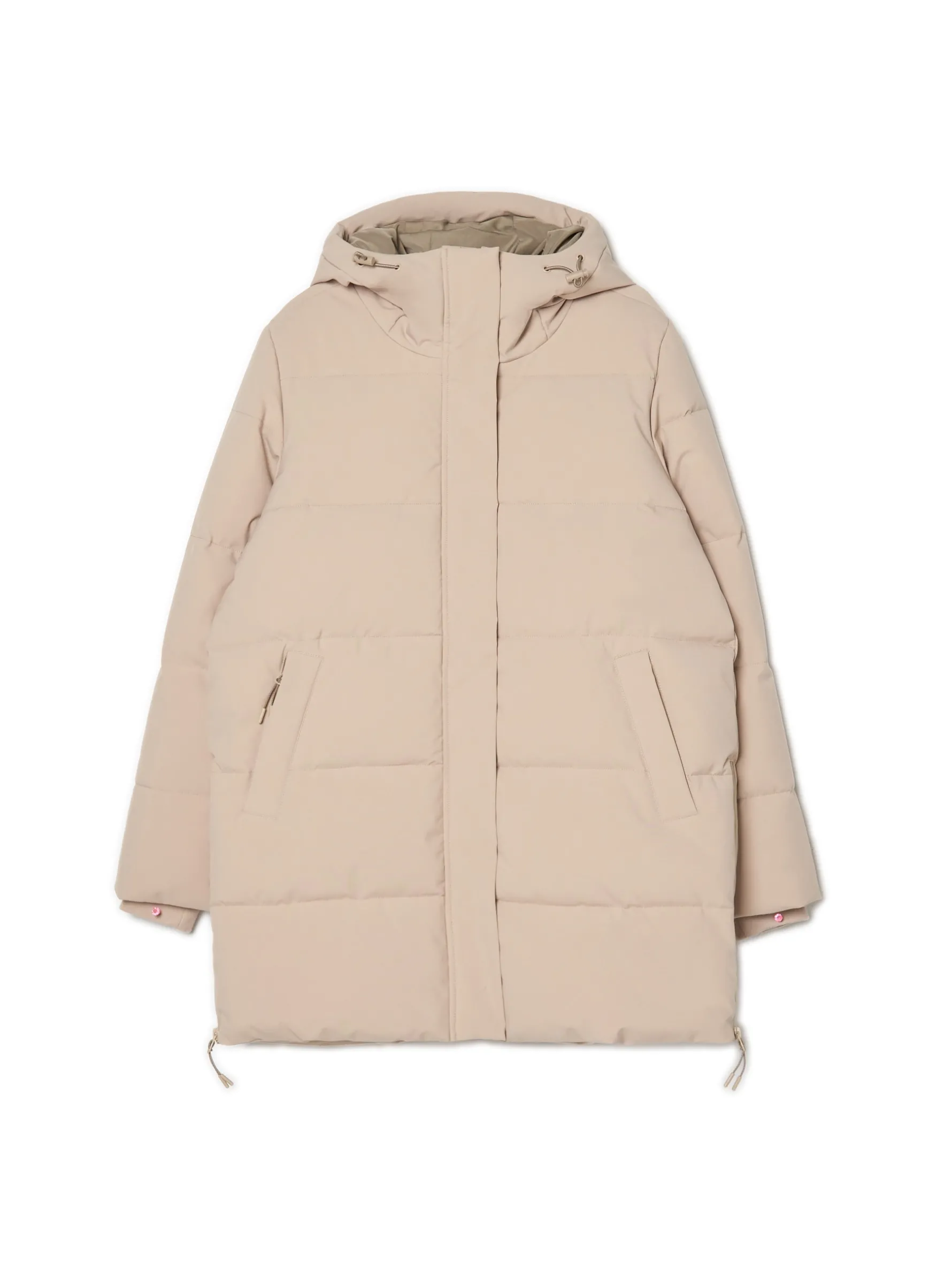 Damski beżowy płaszcz typu puffer, idealny na zimę. regularny krój, pikowanie na całej powierzchni zapięcie na suwak, kryte panelem zapinanym na zatrzaski kaptur regulowany ściągaczami ze stoperami, stójka pod szyją dwie kieszenie, zapinane na suwaki syntetyczne wypełnienie oraz podszewka