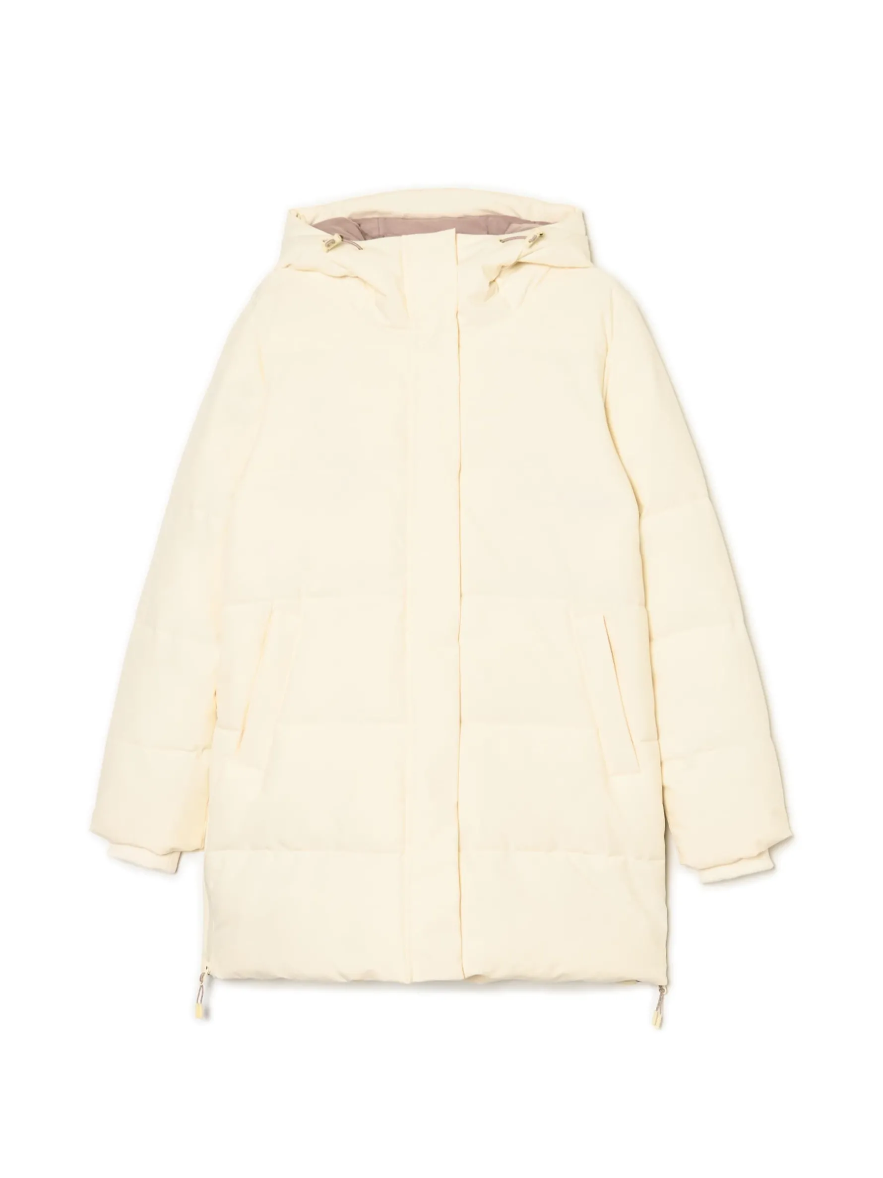 Damski kremowy płaszcz typu puffer, idealny na zimę. regularny krój, pikowanie na całej powierzchni zapięcie na suwak, kryte panelem zapinanym na zatrzaski kaptur regulowany ściągaczami ze stoperami, stójka pod szyją dwie kieszenie, zapinane na suwaki syntetyczne wypełnienie oraz podszewka