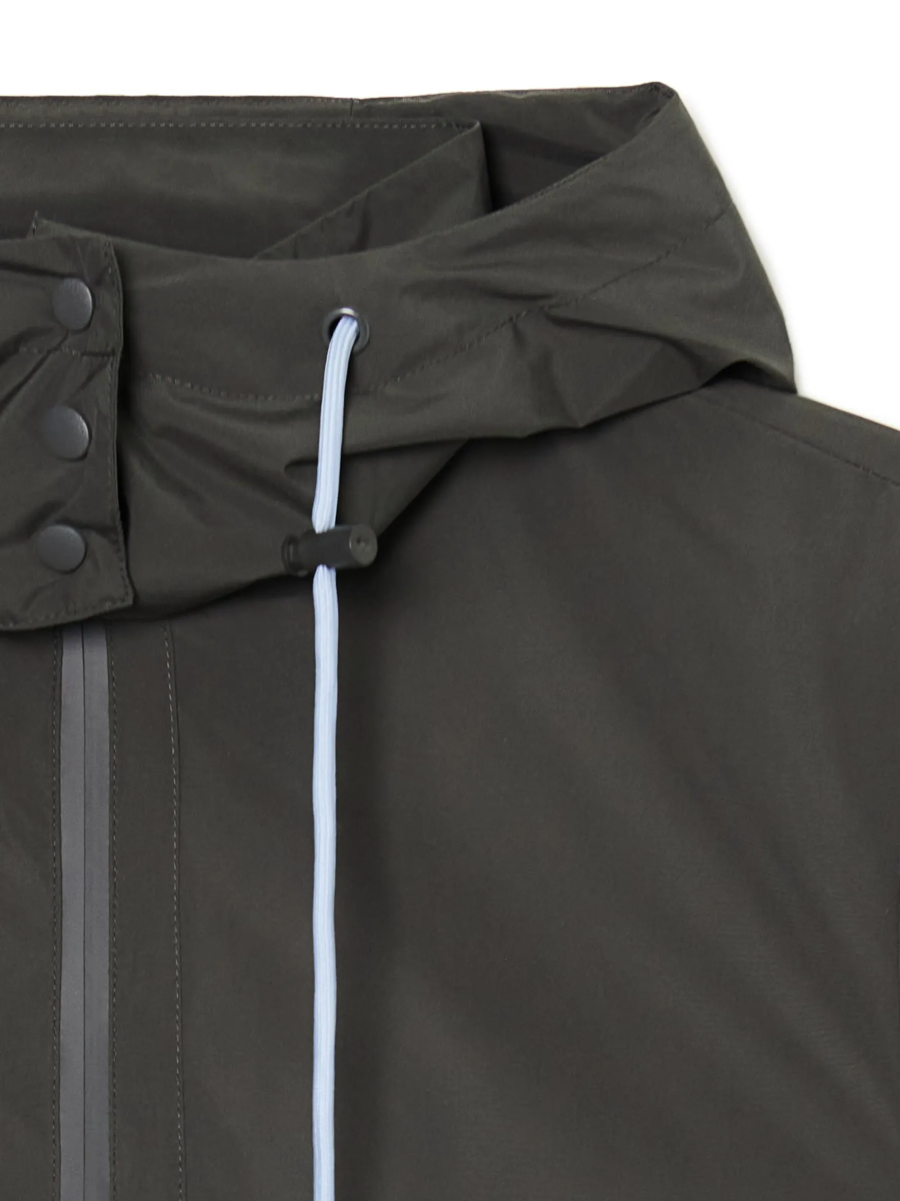 Damska kurtka, uszyta z gładkiej, lekkiej tkaniny w stonowanym szarym kolorze. regularny krój z przodu zapięcie na suwak kaptur regulowany sznurkami ze stoperami klapy kaptura zapinane na zatrzaski dolny brzeg i rękawy zakończone wszytą elastyczną gumką dwie kieszenie
