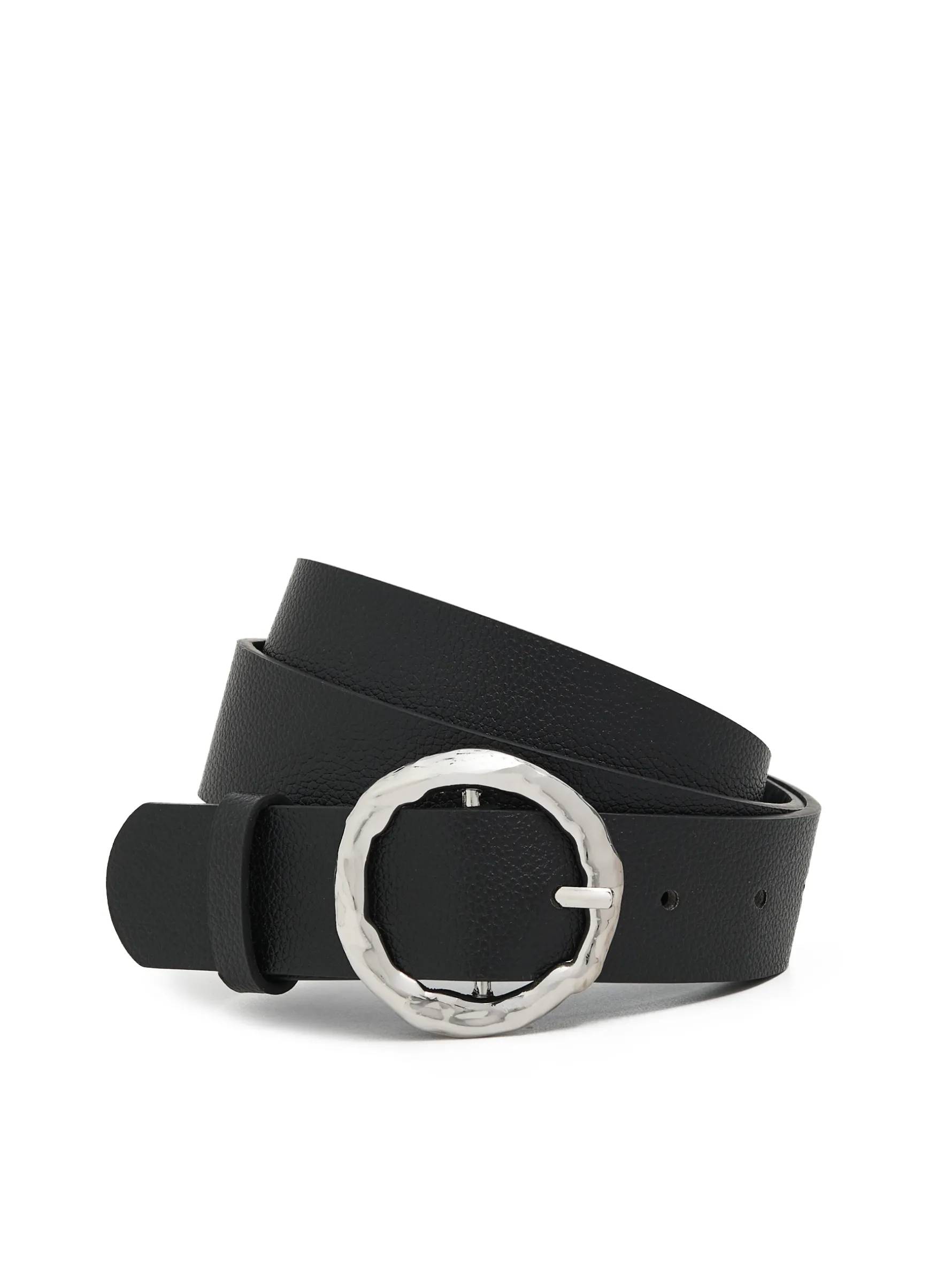 Szeroki damski pasek do spodni z ozdobną okrągłą klamrą. Wykonany z czarnej imitacji skóry.
