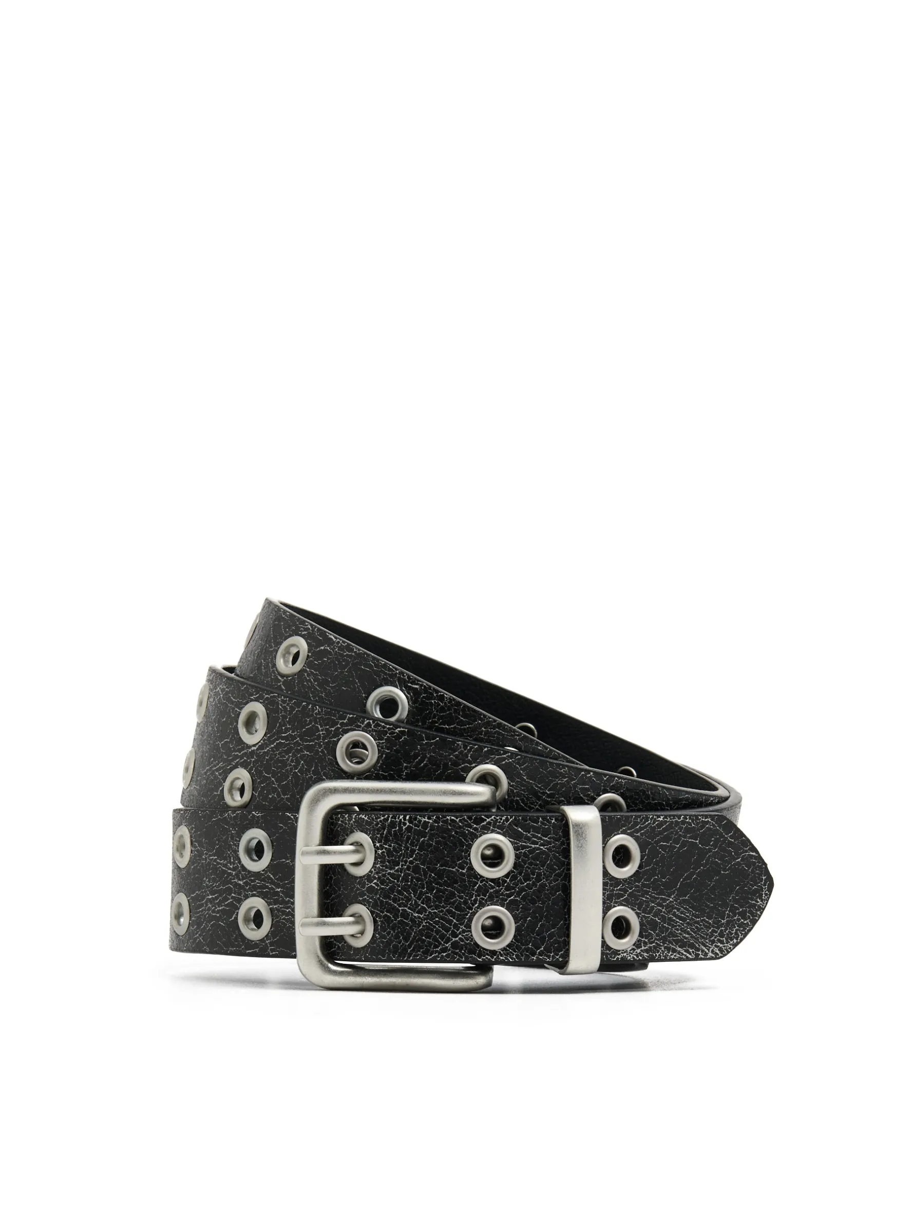 Damski pasek uszyty z materiału ze sztucznej skóry z efektem pęknięć. Klamra, przelotki i dodatkowa szlufka w srebrnym kolorze nadają im wyjątkowego vibe’u. Idealny dodatek do jeansów i materiałowych spodni. Długość paska: S/M 75cm Długość paska: M/L 85cm