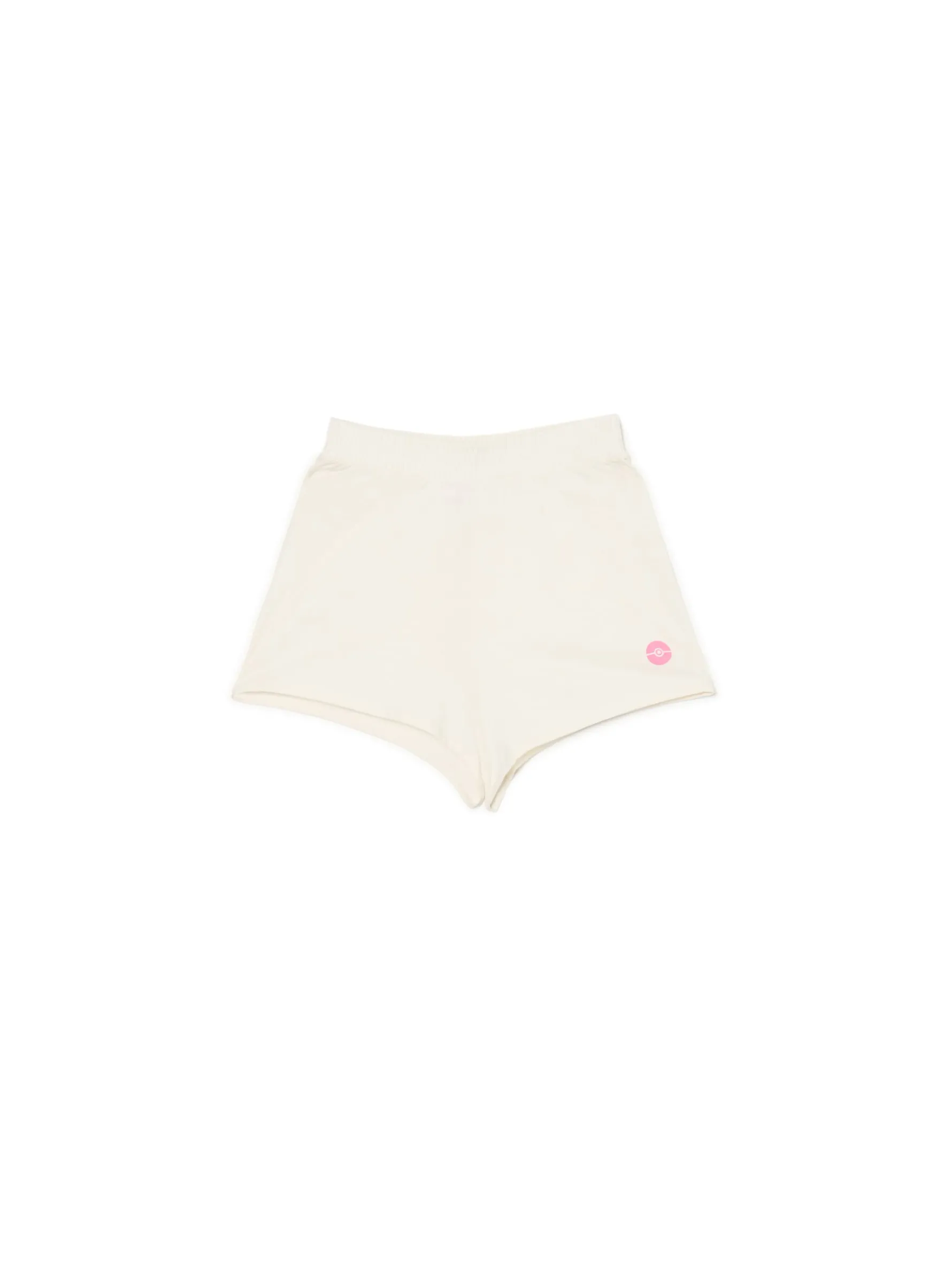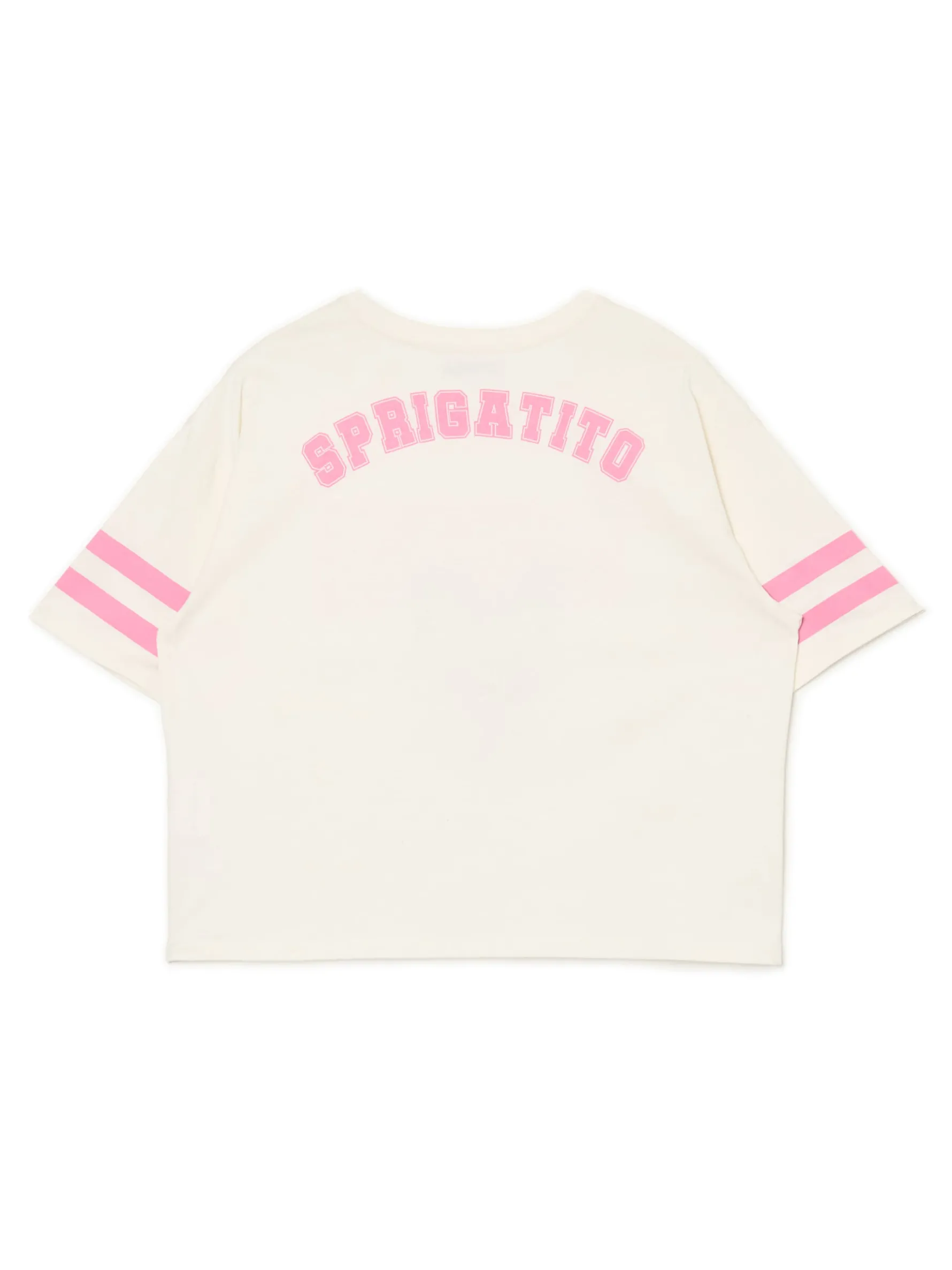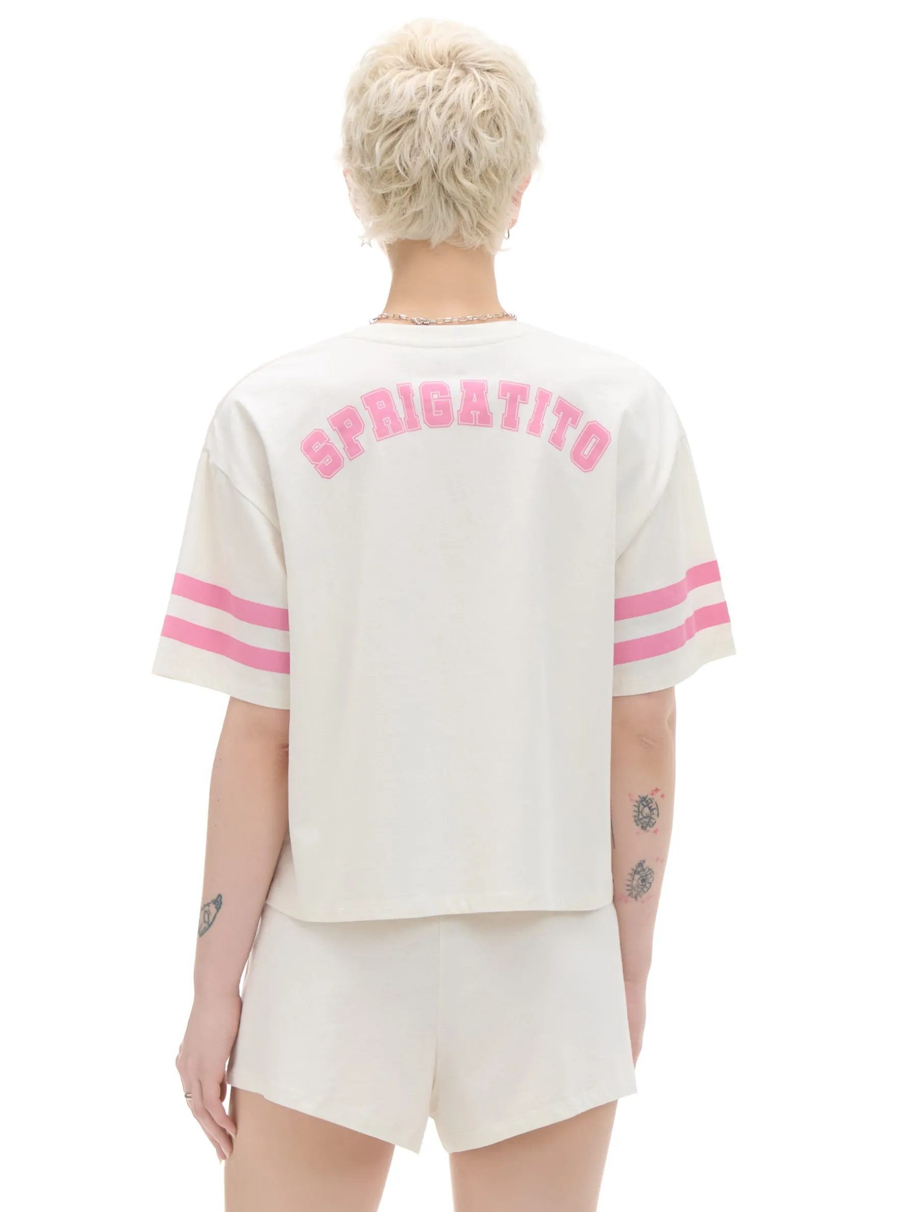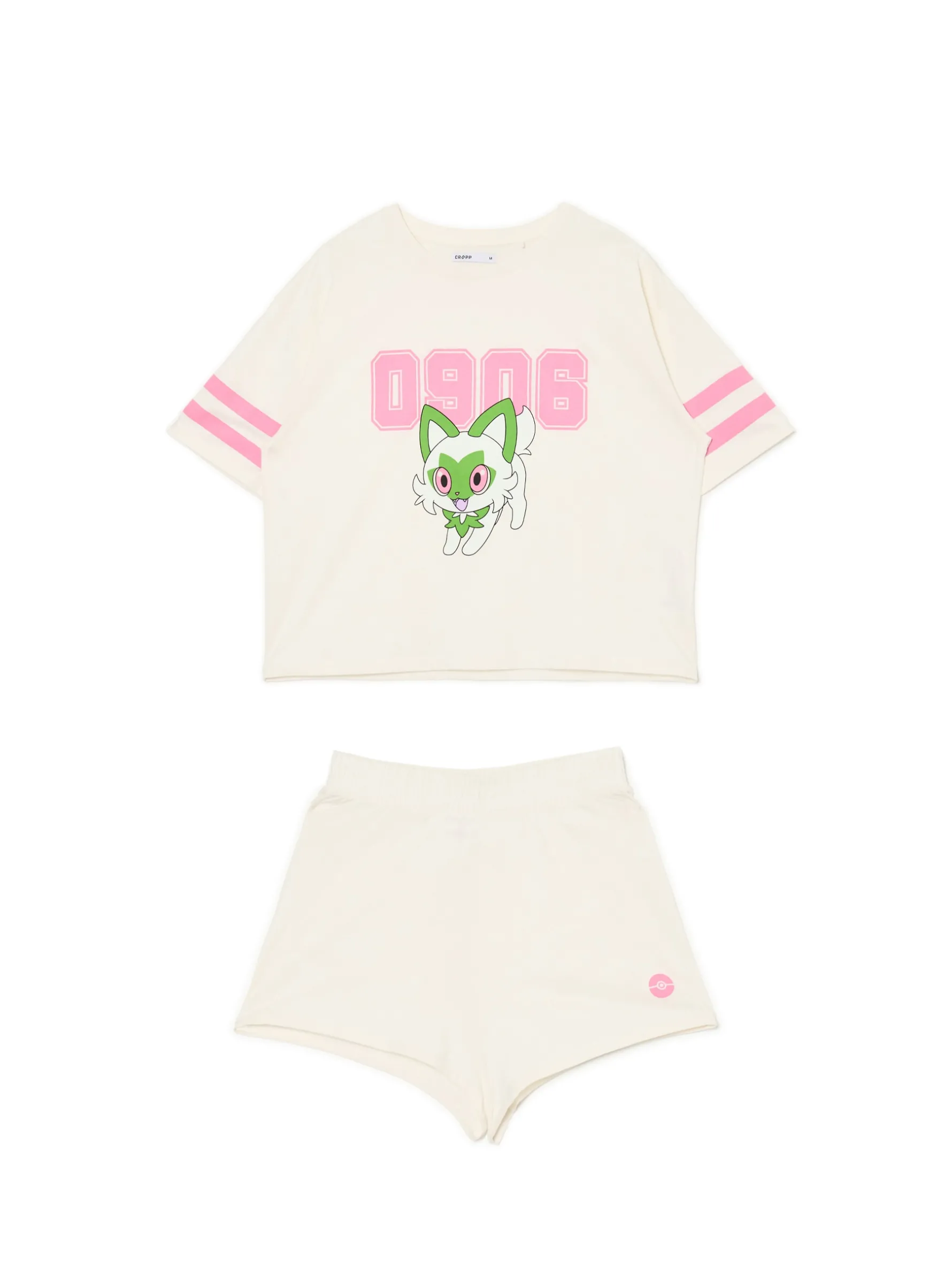 Krótka kremowo-różowa piżamka, uszyta z lekkiej bawełny. luźna koszulka, ozdobiona paskami na rękawach nadruki z motywem Sprigatito szorty z gumką w pasie i krótkimi nogawkami © 2024 Pokémon. TM, ® Nintendo