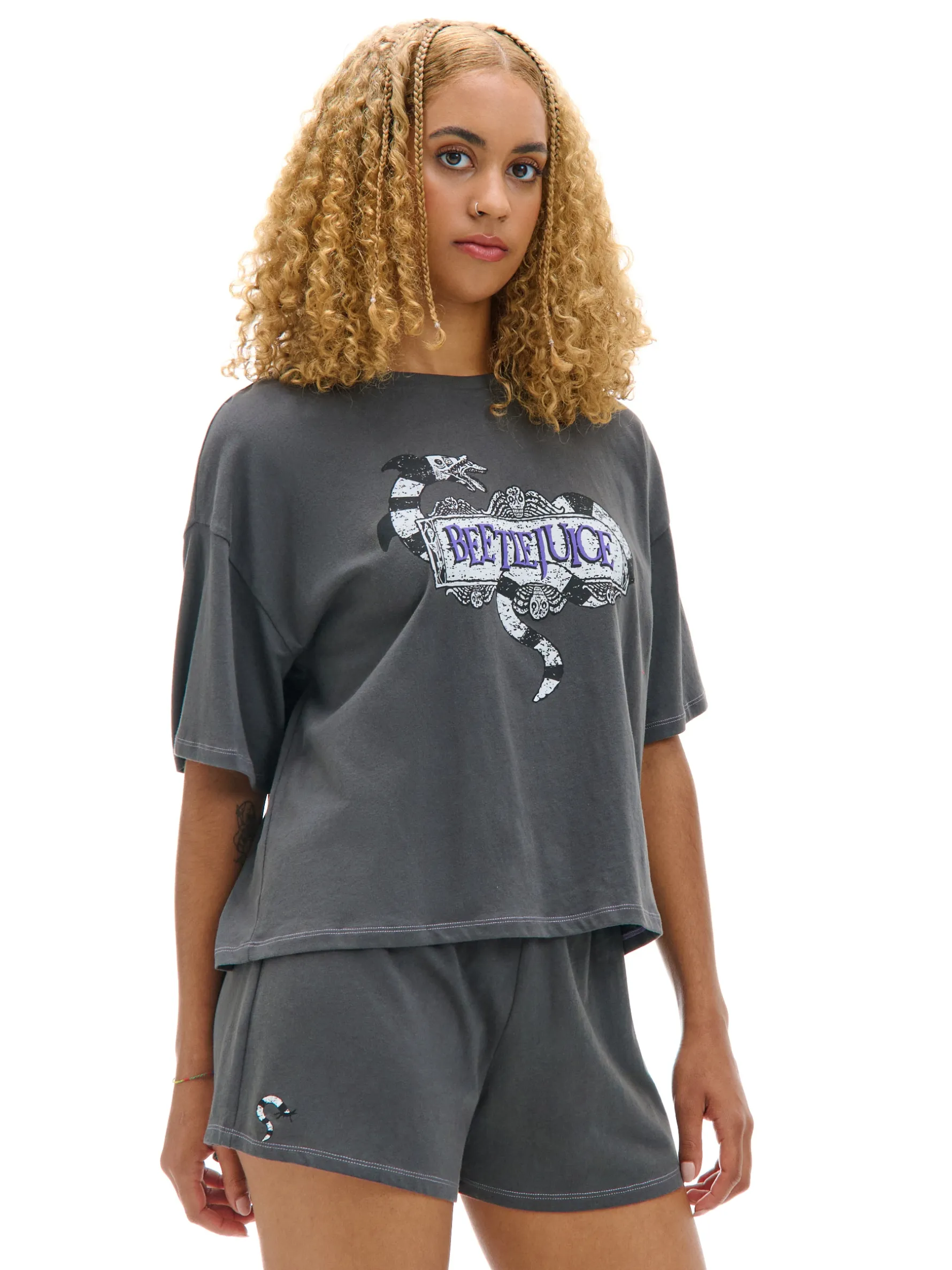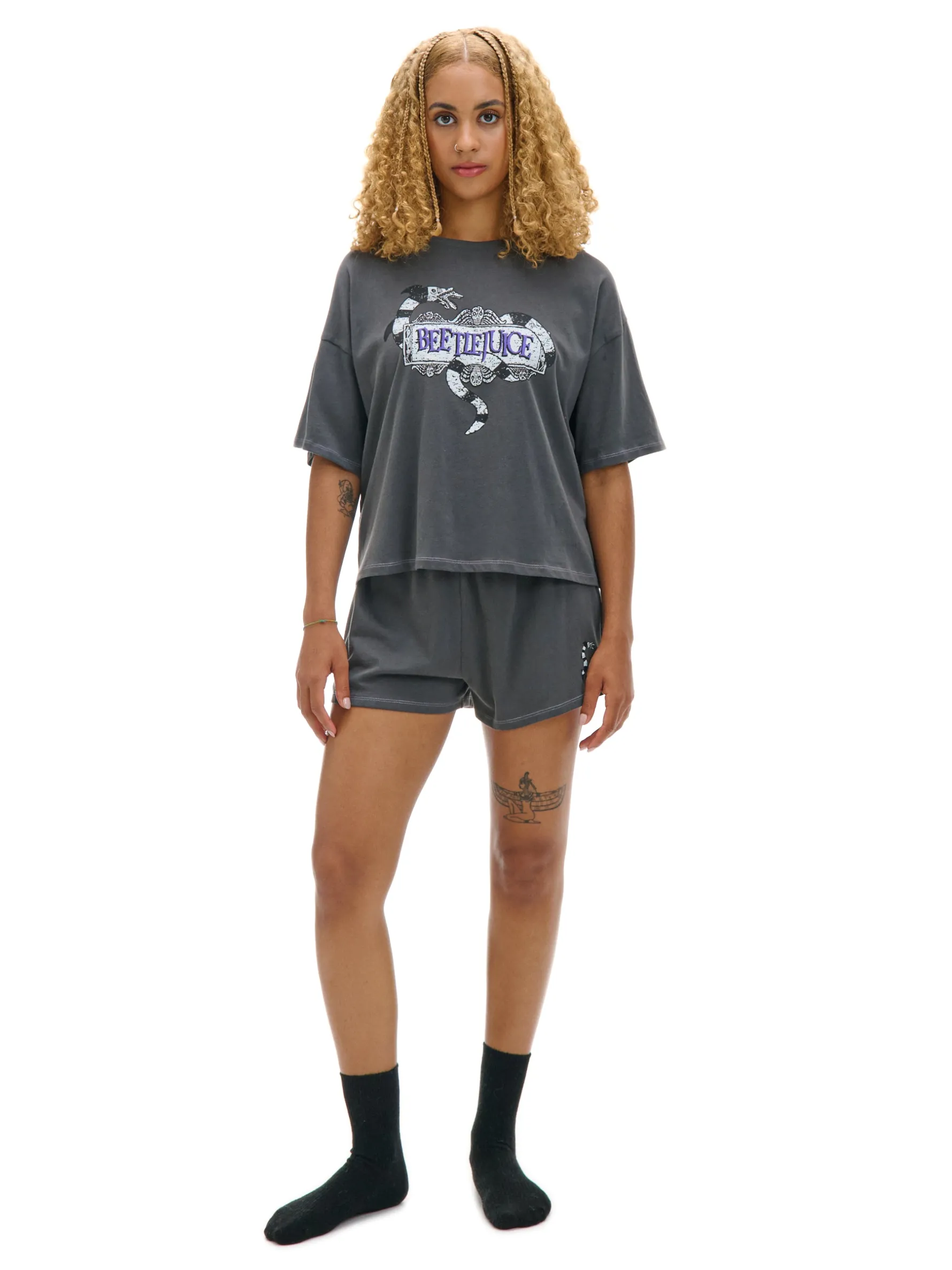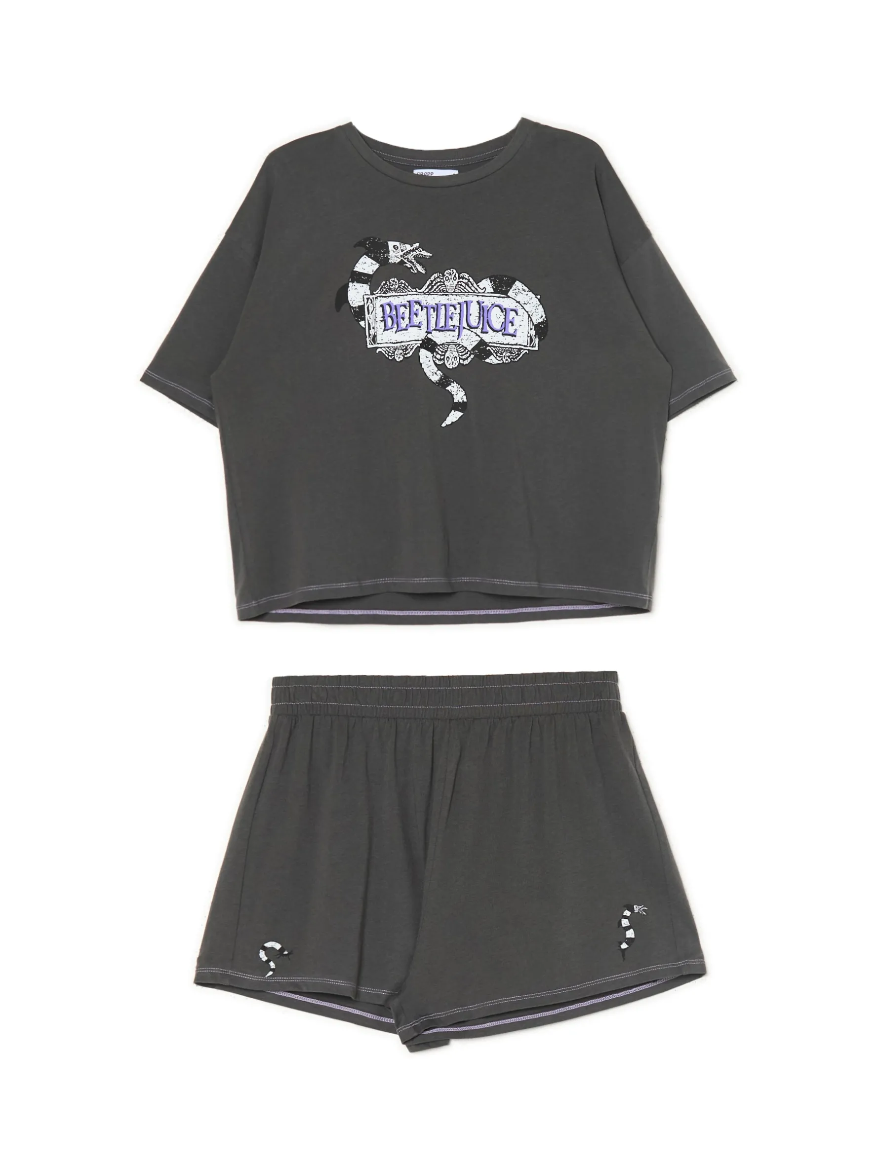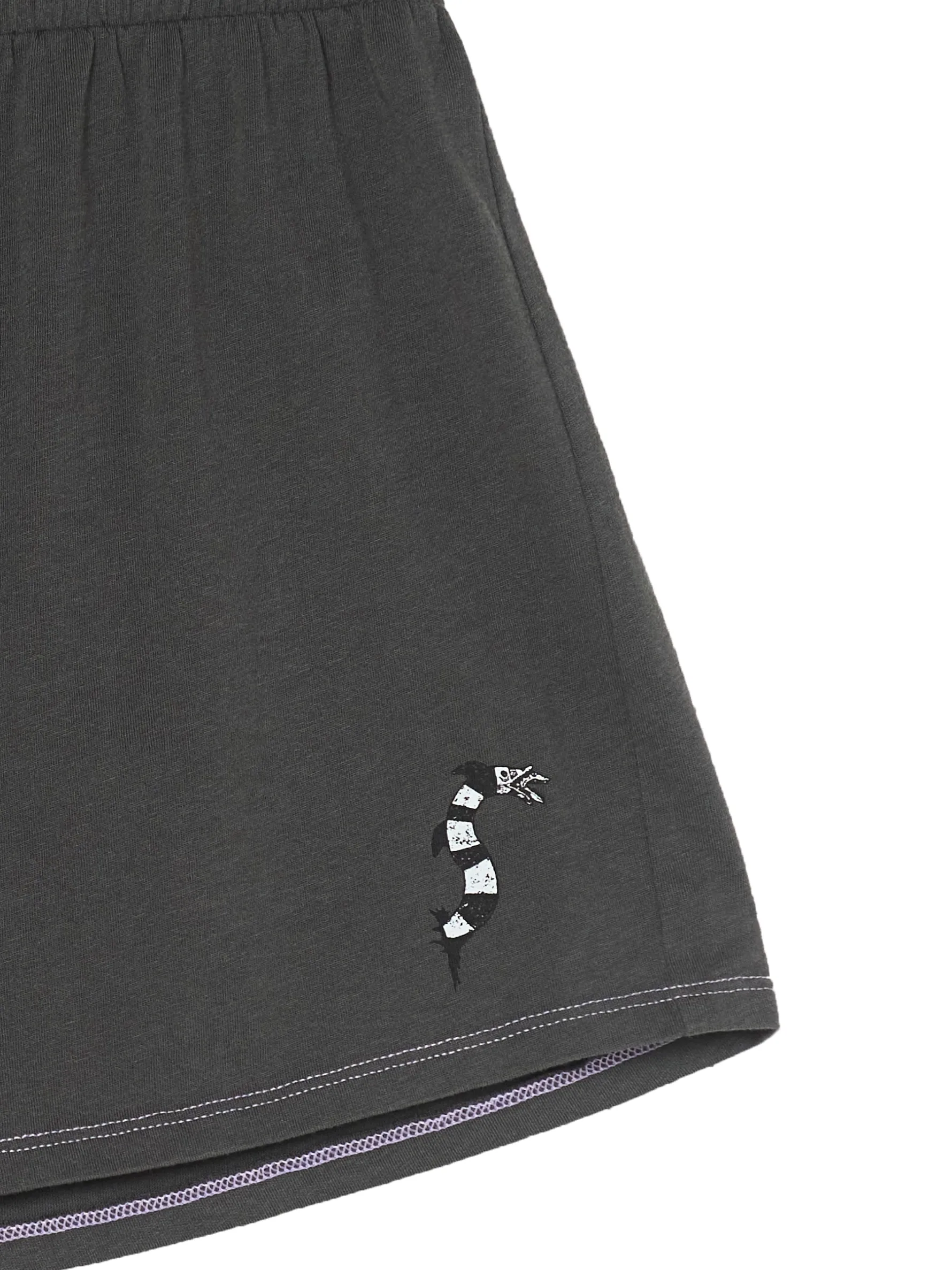 Dwuczęściowa damska piżama o krótszym kroju, uszyta z bawełny. Zestaw składa się z koszulki i spodenek o luźnym kroju. Na całości nadruki nawiązujące do serii filmowej 'Sok z Żuka’. 100% bawełny swobodny krój krótkie rękawy elastyczna gumka w pasie krótkie, swobodne nogawki nadruk z motywem Halloween BEETLEJUICE and all related characters and elements © & TM Warner Bros, Entertainment Inc. WB SHIELD: © & TM WBEI. (s24)
