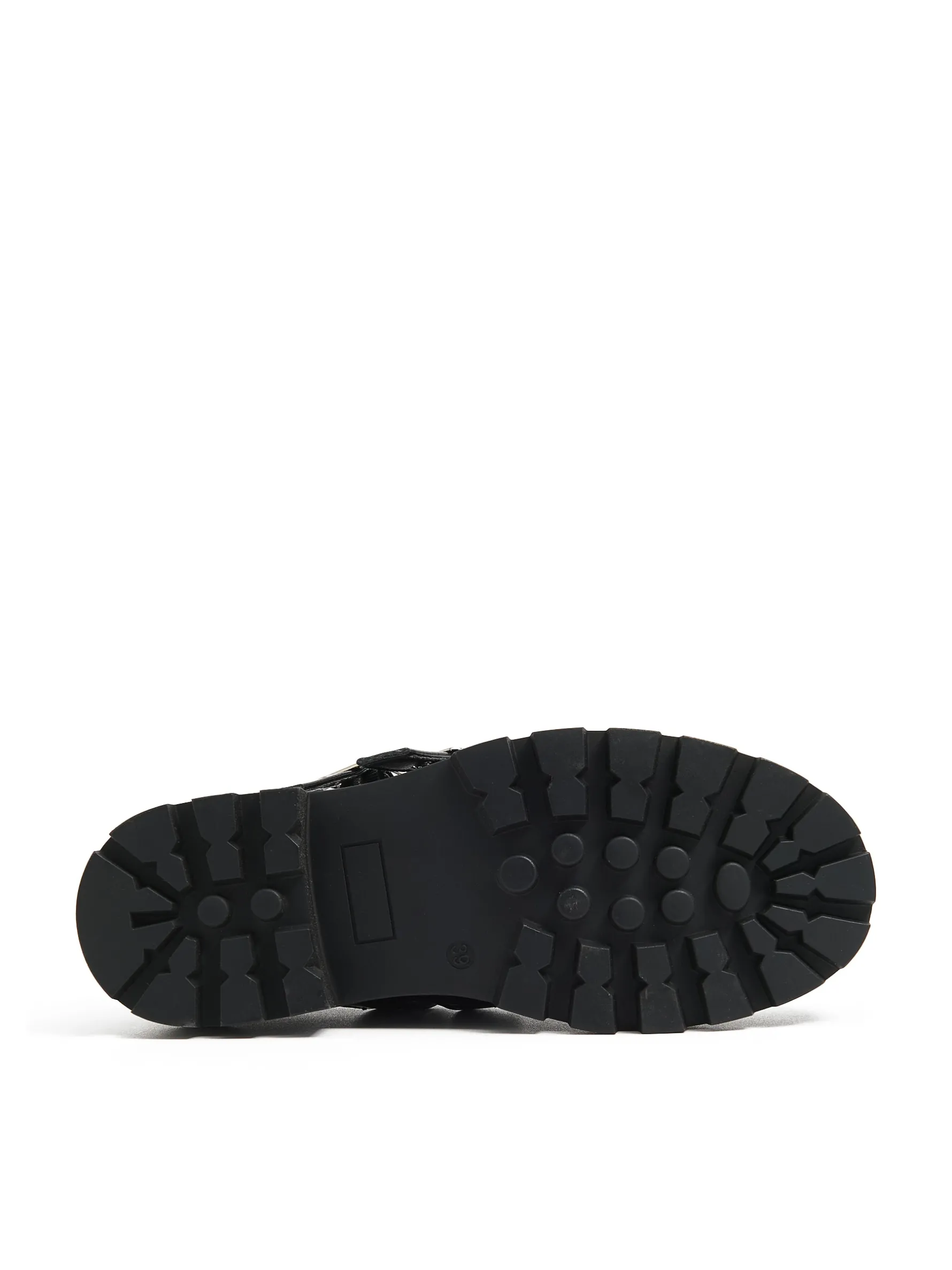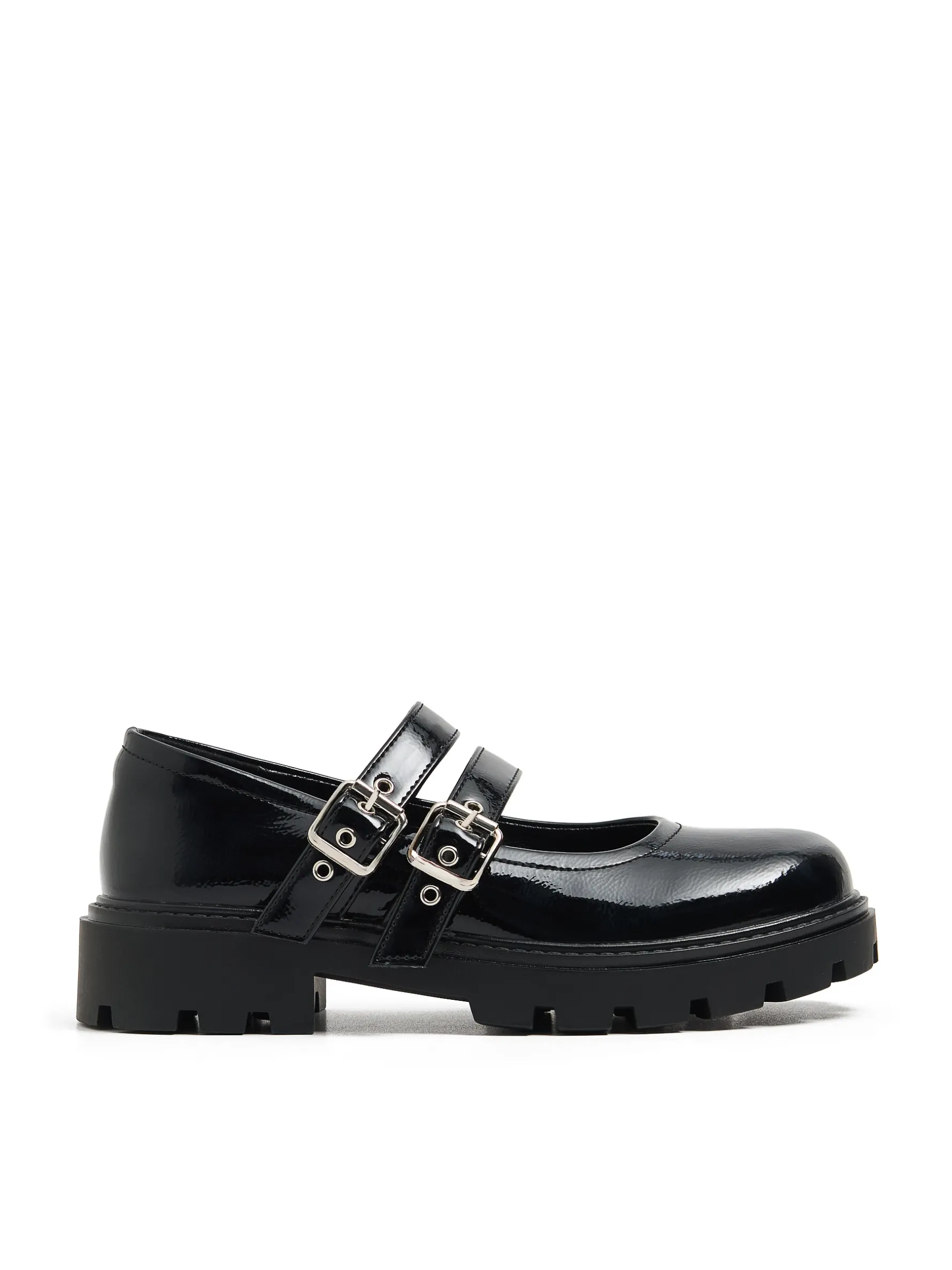 Damskie lakierowane półbuty typu Mary Jane z ozdobnymi regulowanym paskami i wygodną, solidną podeszwą. W tym klasycznym, czarnym kolorze fitują z wieloma stylizacjami! lakierowana imitacja skóry wykonane z łączonych materiałów obcas i traktorowa podeszwa z gumy termoplastycznej dwa wąskie, regulowane paski metalowe wykończenia w srebrnym kolorze