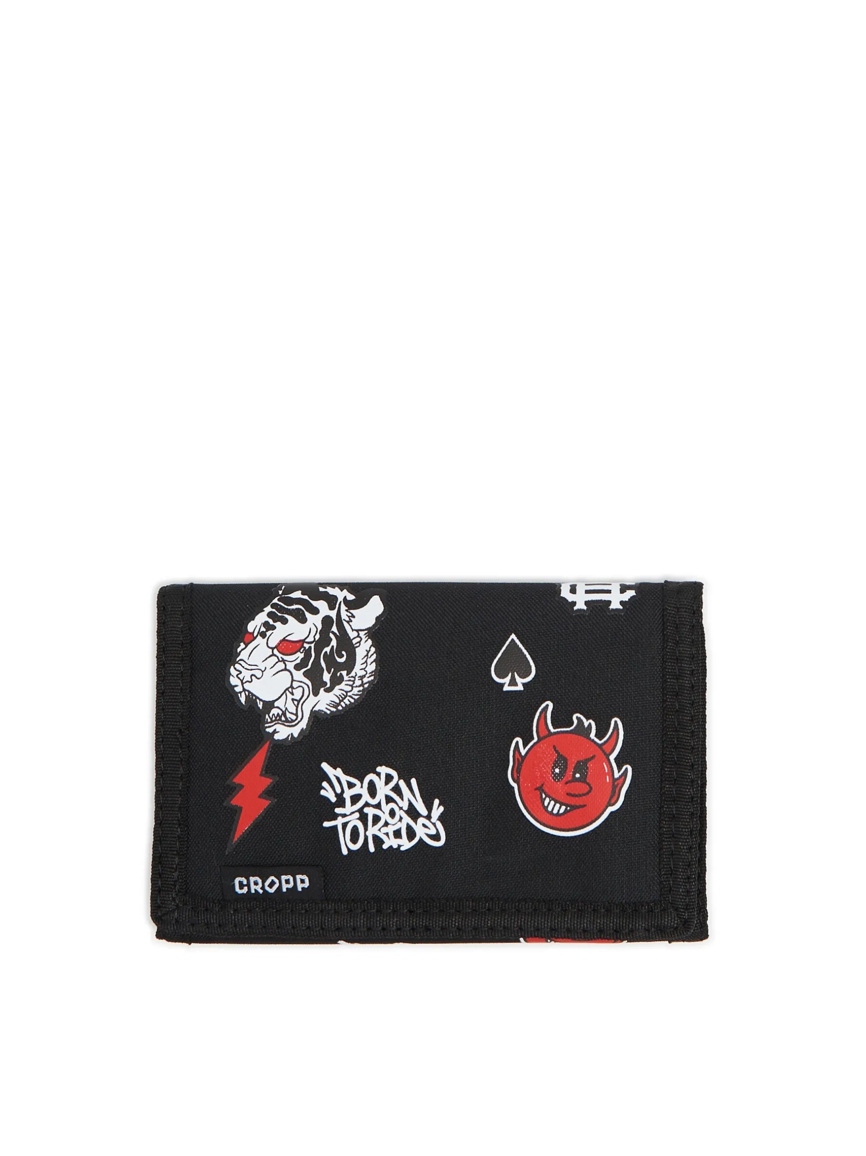 Portfel męski z przegrodami, wykonany z tkaniny. Na całości nadruki z różnymi motywami. Dostępny w innych wersjach kolorystycznych. Wymiary produktu: 10 x 14 cm
