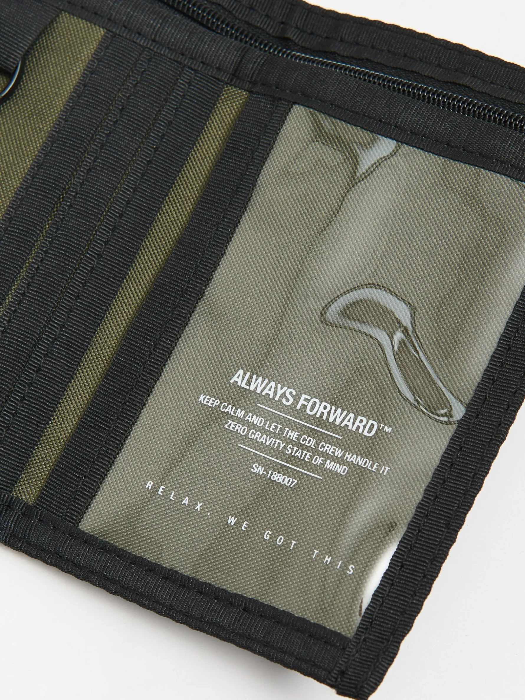 Duży męski portfel, z gładkiego oliwkowego tworzywa z brzegami obszytymi tkaniną. zapinane na suwak komory na monety liczne przegródki na banknoty i dokumenty niewielka funkcjonalna pętla oraz kółko do kluczy ozdobne wytłoczenie Wymiary produktu: 10 x 14 cm