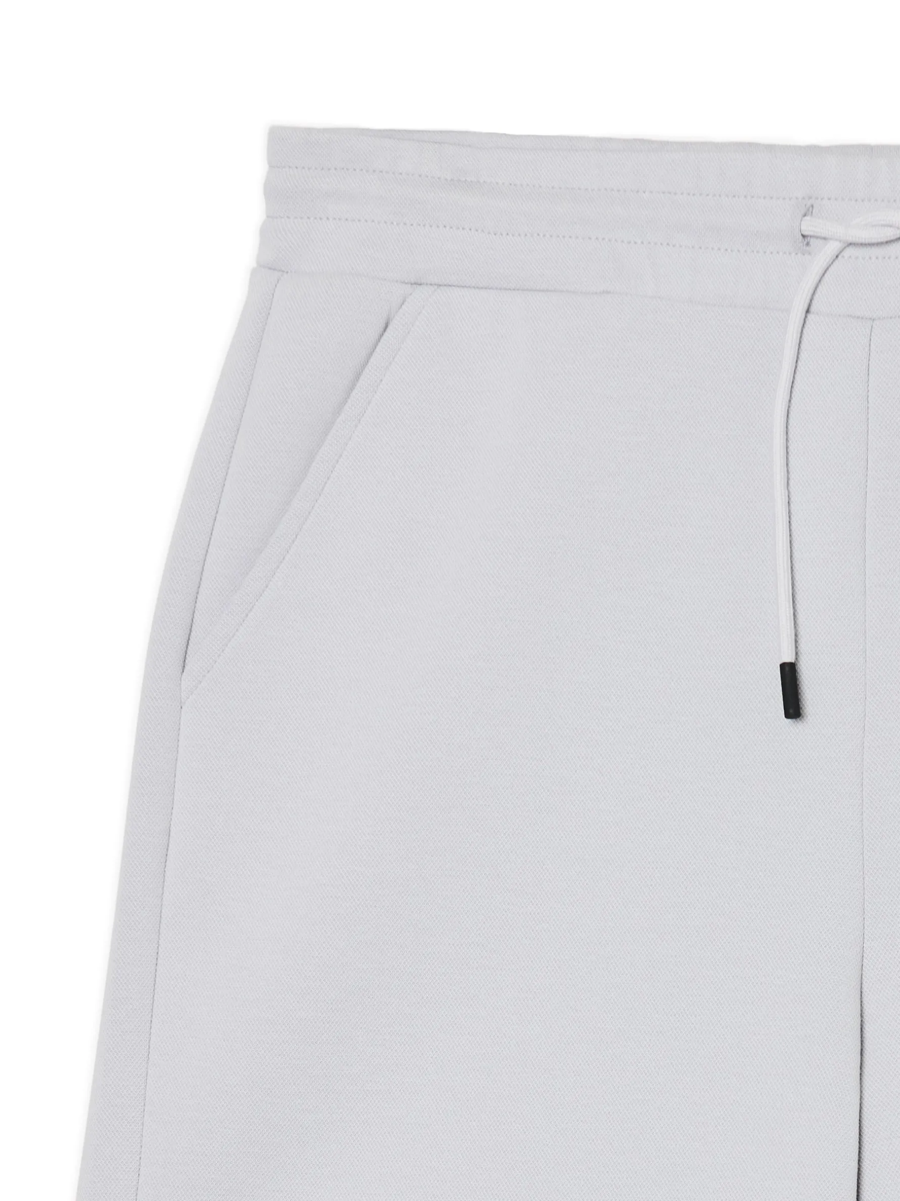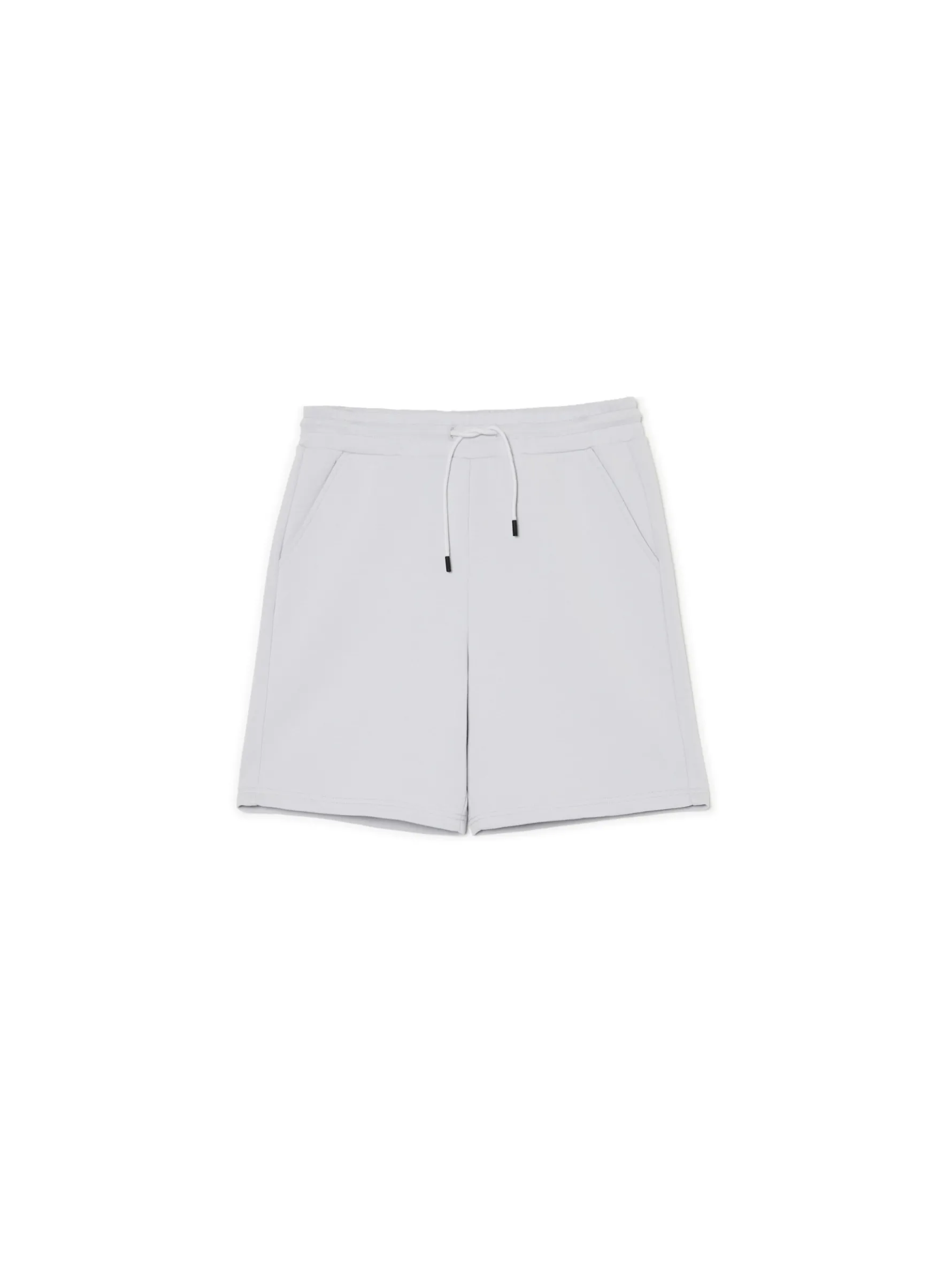 Dresowe spodenki męskie, uszyte z mieszanki dzianin z bawełną w jasnoszarym kolorze. Wyposażone w praktyczne kieszenie i wygodną gumkę w pasie nadają się do każdego typu aktywności. dzianinowy materiał z bawełną regularny stan gumka w pasie ze sznurkiem do regulacji długość do kolan dwie kieszenie z przodu naszywana kieszeń z tyłu Wzrost modela: 185 cm