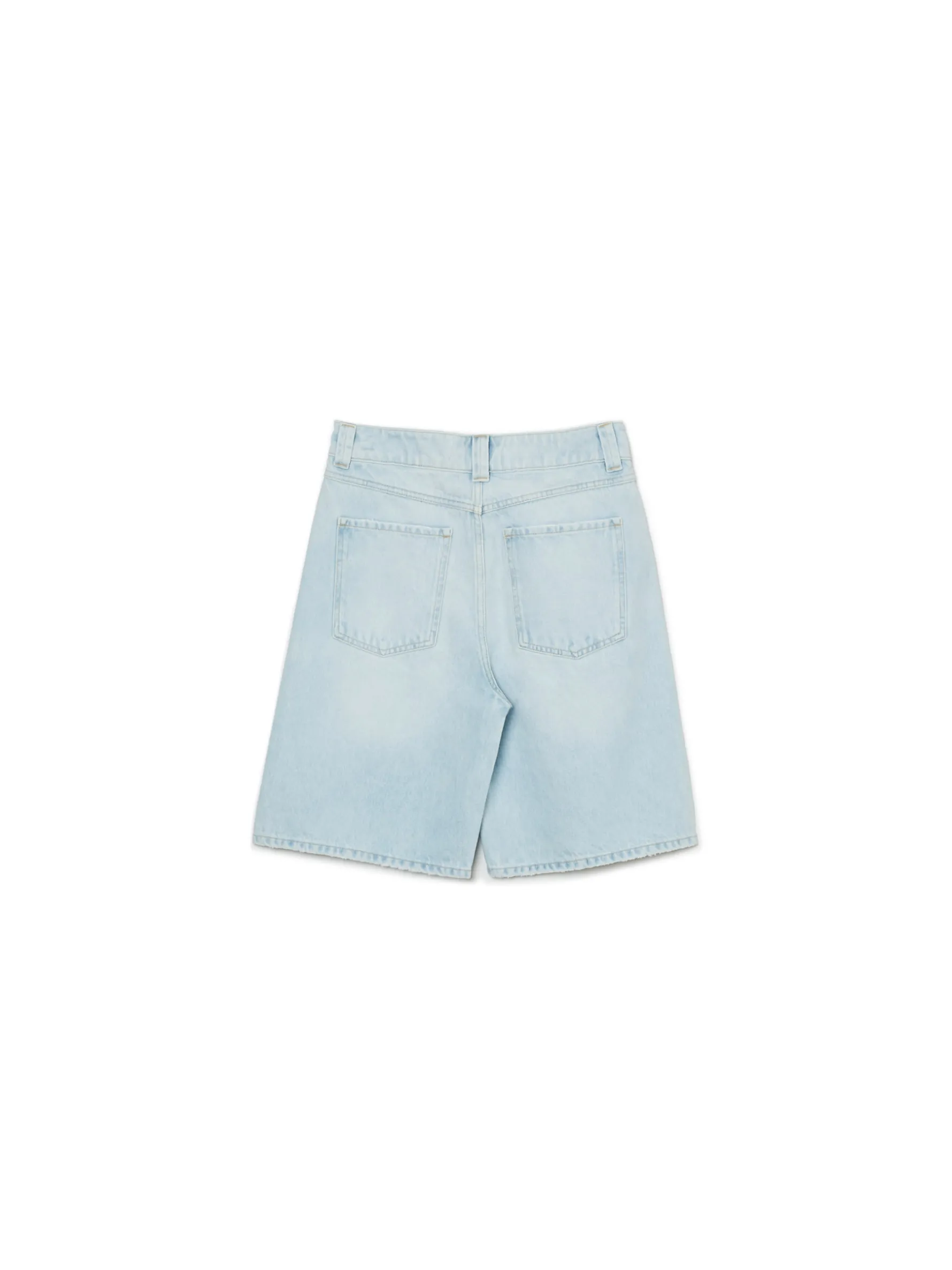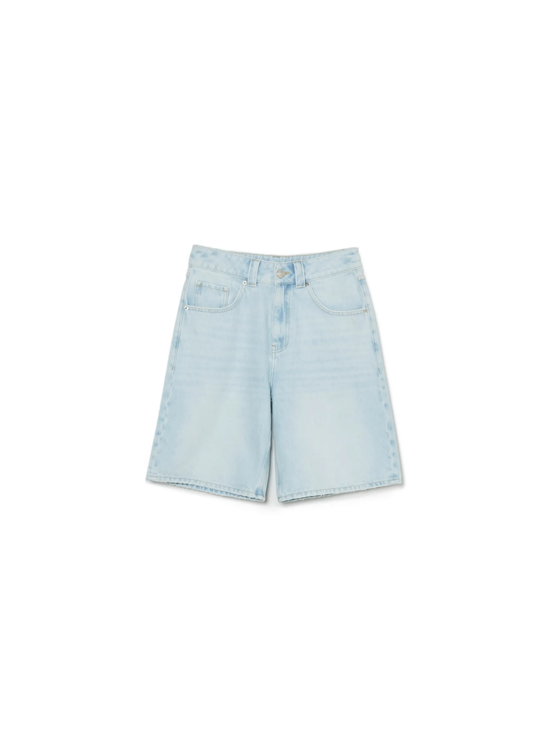 Damskie bermudy w jasnym odcieniu jeansowego materiału idealne na letnie dni. Dla balansu denim jest niezbędny… check it! 100% bawełny w składzie jeansowe bermudy o kroju baggy zapinane na zamek i guzik dwie pary kieszeni z przodu i z tyłu modny efekt sprania Wzrost modelki: 172 cm
